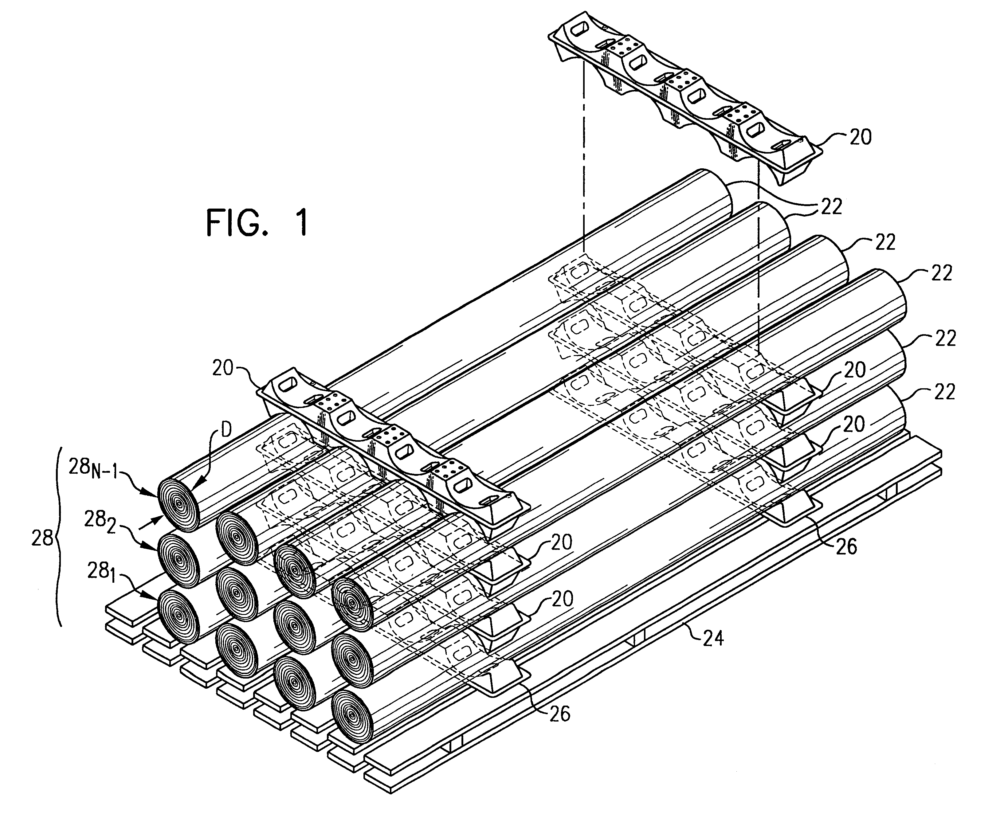 1. A support apparatus for receiving and supporting one or more pieces of roll stock, said support apparatus comprising: (a) a first elongated upper surface comprising a plurality of roll support cradle portions, each of said roll support cradle portions having an outward surface shaped in an arcuate segment of pre-selected dimensions adapted for securely receiving a piece of roll stock of substantially complementary shape; (b) a first pair of longitudinally running opposing sidewall portions, each of said opposing sidewall portions sloping inwardly and upwardly toward said first elongated upper surface; (c) a first base, said first base providing upward structural support to each of said opposing sidewall portions, which, in turn, each provide upward structural support for said first upper surface comprising a plurality of roll support cradle portions; (d) one or more support platforms in each of said roll support cradle portions, and wherein each of said one or more support platforms further comprises (i) first and second inwardly and downwardly sloping sidewall portions, each having a lower end portion and (ii) a transversely extending bottom support foot, said bottom support foot located adjacent said lower end portion of said first and said second inwardly and downwardly sloping sidewall portions, and (A) extending laterally across said roll support cradle portion, and (B) extending downwardly to a location substantially even with said first base. 2. The apparatus as set forth in claim 1, wherein each of said roll support cradle portions has a bottom portion, and wherein said bottom portion is elevated above said base. 3. The apparatus as set forth in claim 2, wherein said bottom portion of said roll support cradle portion is elevated about 0.25 inches above said base. 4. The apparatus as set forth in claim 1, wherein each of said opposing sidewall portions is angled upward and inward at an angle sigma (ε) of about 20 degrees. 5. The apparatus as set forth in claim 1, wherein each of said first and second inwardly and downwardly sloping sidewall portions of said support platforms is angled downwardly and inwardly at a preselected angle alpha and beta, respectively. 6. The apparatus as set forth in claim 5 wherein said angle alpha (α) is about 20 degrees. 7. The apparatus as set forth in claim 5 wherein said angle beta (β) is about 20 degrees. 8. The apparatus as set forth in claim 1, further comprising, between adjacent roll support cradle portions, a platform portion. 9. The apparatus as set forth in claim 8, wherein said platform portion further comprises a plurality of outwardly and upwardly protruding dimple portions. 10. The apparatus as set forth in claim 1, further comprising: (a) a second elongated upper surface comprising a plurality of roll support cradle portions, each of said roll support cradle portions having an outward surface shaped in an arcuate segment of pre-selected dimensions adapted for securely receiving a piece of roll stock of substantially complementary shape; (b) a second pair of longitudinally running opposing sidewall portions, each of said opposing sidewall portions sloping inwardly and upwardly toward said second elongated upper surface; (c) a second base, said second base providing upward structural support to each of said second pair of opposing sidewall portions, which, in turn, each provide upward structural support for said second upper surface comprising a plurality of roll support cradle portions; (d) a flexible attachment portion, said flexible attachment portion adapted to flexibly connect said first base to said second base so that said first (e) one or more support platforms in each of said roll support cradle portions, and wherein each of said one or more support platforms further comprises (i) first and second inwardly and downwardly sloping sidewall portions, each having a lower end portion and (ii) a transversely extending bottom support foot, said bottom support foot located adjacent said lower end portion of said first and said second inwardly and downwardly sloping sidewall portions, and (A) extending laterally across said roll support cradle portion, and (B) extending downwardly to a location substantially even with said first base. 11. The apparatus as set forth in claim 1, or in claim 10, wherein said apparatus in manufactured in a strong, flexible plastic material. 12. The apparatus as set forth in claim 11, wherein the plastic material is a polyethylene terephthalate. 13. The apparatus of claim 12, wherein said plastic material is a recycled plastic, material. 14. The apparatus as set forth in claim 11, wherein said apparatus is thermoformed. 15. The apparatus as set forth in claim 10, wherein a multiple of roll supports combine to support a multiple of rolls of roll stock, said rolls of roll stock supported by the roll supports to form a bottom tier of supported roll stock, and the bottom tier of the supported roll stock additionally supports a minimum of two additional tiers of the roll stock, and each of the two additional tiers of the cylindrical is also supported by additional roll supports.