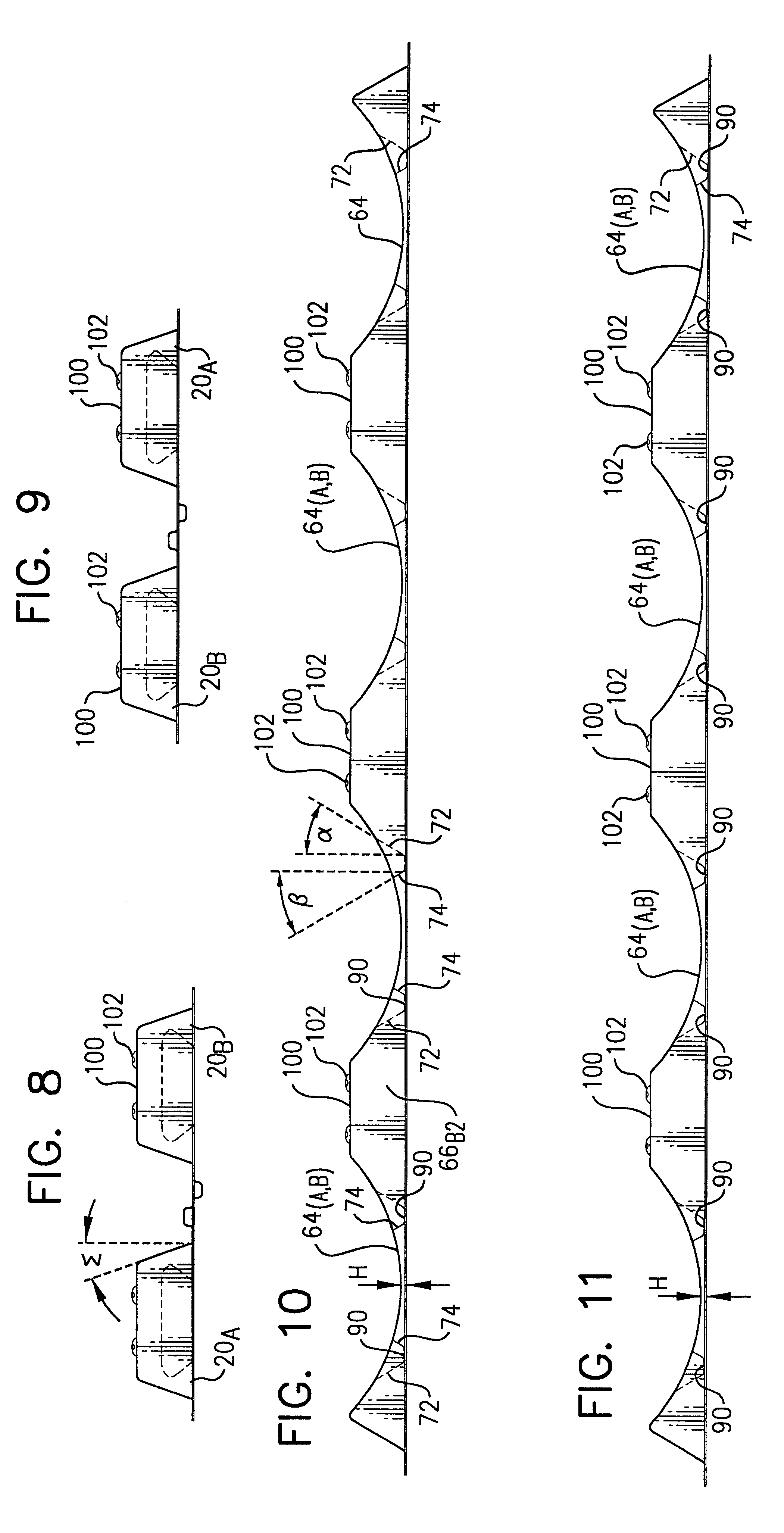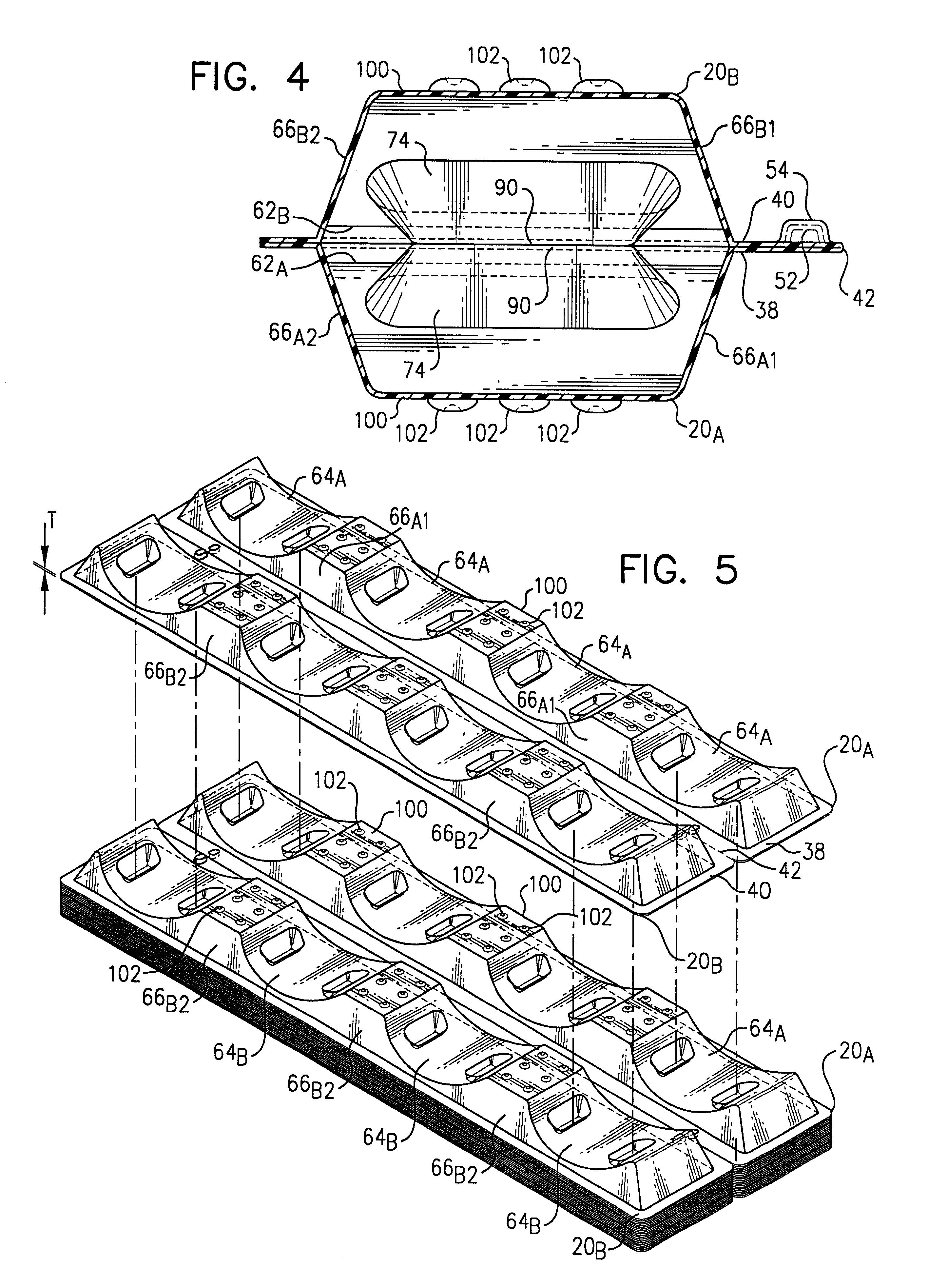 This application is a Continuation-In-Part of prior application Ser. No. 09/330,536, filed Jun. 11, 1999, now U.S. Pat. No. 6,209,839 the disclosure of which is incorporated herein in its entirety by this reference. The invention relates to stacking supports for roll stock, and more particularly to a compactly nestable, high strength, improved stacking support for roll stock. “Roll stock” is a term that is commonly used to describe cylindrical rolls or tubular rolls of a selected width of thin materials. Such items include paper products, plastic film products, thin gauge metals, roofing sheets, and various other thin materials. Importantly, these various cylindrical or tubular shaped rolls are typically shipped and stored on pallets. Most often, such storage is provided in tiers of rolls, and, most commonly, the rolls are horizontally oriented above the pallets. In order to stabilize and support the cylindrical or tubular rolls, stacking supports have typically been employed. Various U.S. patents show stacking supports for receiving stacked rolls of materials. One such disclosure is found in U.S. Pat. No. 4,195,732 to Bell, which teaches a support and spacing member for roll stock formed from expanded polystyrene foam. Similarly, U.S. Pat. No. 4,832,196 to Butler shows a roll support member that, like Bell the '732 patent, is formed utilizing expanded polystyrene foam. However, certain characteristics of the polystyrene foam make it less than ideal for use in roll stock supports. This is because expanded polystyrene is rather rigid, relatively brittle, and thus has a minimum of structural flexibility. Additionally, polystyrene foam rolls supports do not compactly nest together and thus storage of roll supports manufactured of polystyrene or similar plastic materials takes up considerable space. One alternative to polystyrene foam roll supports has been the development and use of roll supports made from papier-mâché. For example, U.S. Pat. No. 5,080,314 issued Jan. 14, 1992 to Moyer et al for a ROLL STACKER teaches a roll support formed of papier-mâché. Unfortunately, in many circumstances, papier-mâché is inadequate for roll stock supports. For example, the strength of papier-mâché roll stock supports rapidly degrades which they get wet. Consequently, papier-mâché roll sock supports must be protected from the weather, and even cannot be used in many humid environments. Such weather protection is especially difficult during transport, and requires that such supports be shipped within a fully enclosed container or trailer. Further, even though roll supports manufactured from papier-mâché have improved stackability over foam type roll supports, because papier-mâché roll stackers must be of substantial thickness to support the weight of many materials, it would nevertheless be desirable to develop a material that would further reduce the storage space requirements of roll supports, to free up warehouse space. Thus, there remains a need for a strong, weather-proof, preferably recyclable material which can be utilized in the production of compactly stackable roll supports which can be stored with minimal warehouse volume requirements. I have now developed a roll stacking support that can be fabricated in a high strength material suitable for high density storage of the roll stacking support, especially when compared to storage density of conventional stacking supports manufactured from foam or from molded pulp utilizing prior art roll support designs. Importantly, certain improved structural components of my roll stacking support design may be utilized to advantage in improving the performance of prior art roll supports made of materials such as papier-mâché. My novel roll support design provides a support for receiving and supporting stacked tiers of roll stock. My roll support is designed for use in roll support pairs, so that the pair of roll supports can be folded out and utilized side-to-side and located below a base tier of roll stock, or so that the pair of roll supports can be used in a back-to-back fashion and located between tiers or roll stock, or folded out in a side-by-side orientation and placed above a top tier of roll stock, all in order to provide a secure, stacked arrangement of the roll stock that is suited for storage or transport. Alternately, as single one of a pair can be used where appropriate at the base or at the top of a stack of roll stock. Importantly, successive pair sets of my roll supports in pile of such roll supports will nest tightly within a prior or lower pair set, thereby substantially reducing the storage space required for new or for used roll supports. It is preferable (but not mandatory) that roll supports provided utilizing my design configurations be thermoformed utilizing a recyclable plastic. To date, the most preferable structural material that I have found is the use of the polyethylene terephthalate (PET) type plastic. My roll support is preferably formed and provided in a side-by-side pair of support portions which are attached to each other along a flexible joint or hinge. Each roll support portion includes an elongated upper surface having a plurality of roll support cradle portions. Each of the roll support cradle portions has an outward surface shaped in an arcuate segment of pre-selected dimensions adapted for securely receiving a piece of roll stock of substantially complementary shape. A pair of longitudinally running opposing sidewall portions is provided in each roll support portion, and each of the opposing sidewall portions slope inwardly and upwardly toward the elongated upper surface. A base is provided in each of the roll support portions. The base provides upward structural support to each of the opposing sidewall portions, which, in turn, each provide upward structural support for the upper surface that has therein a plurality of roll support cradle portions. For enhanced structural strength, I provide one o