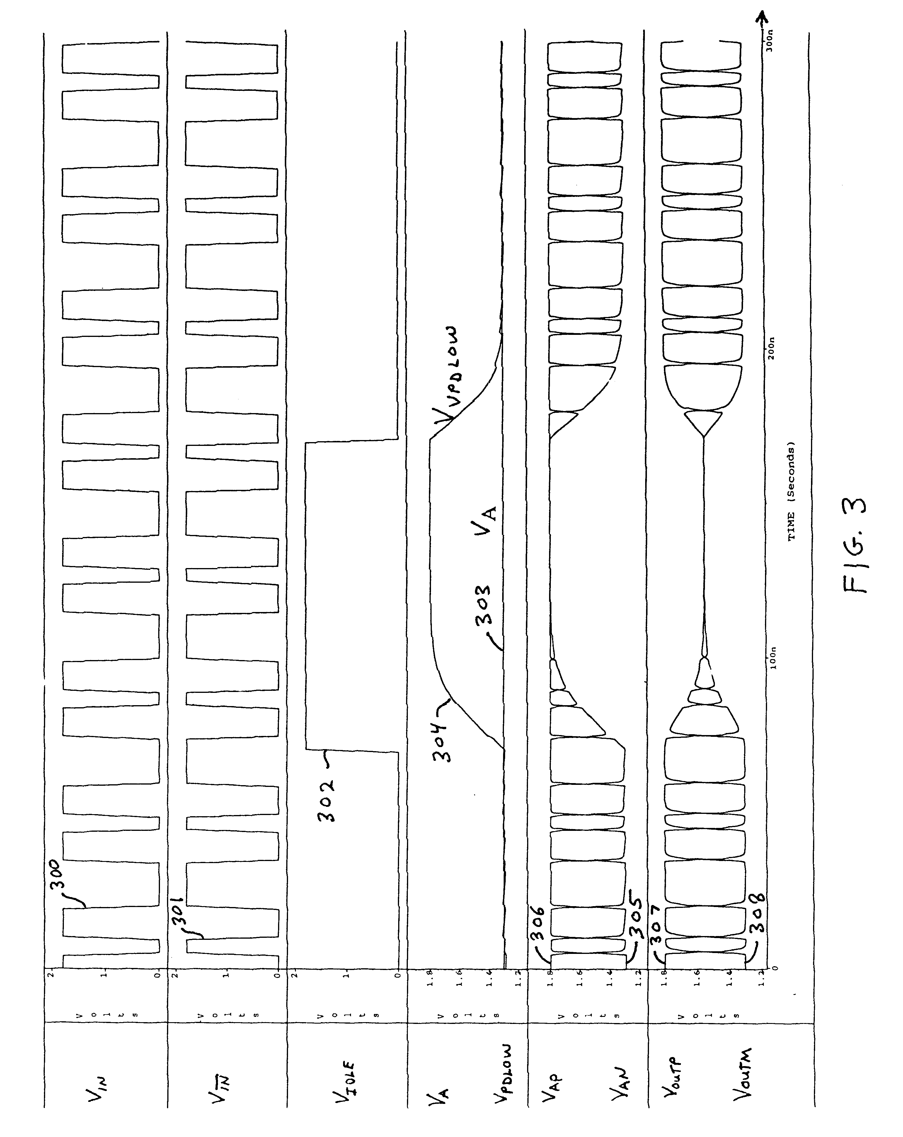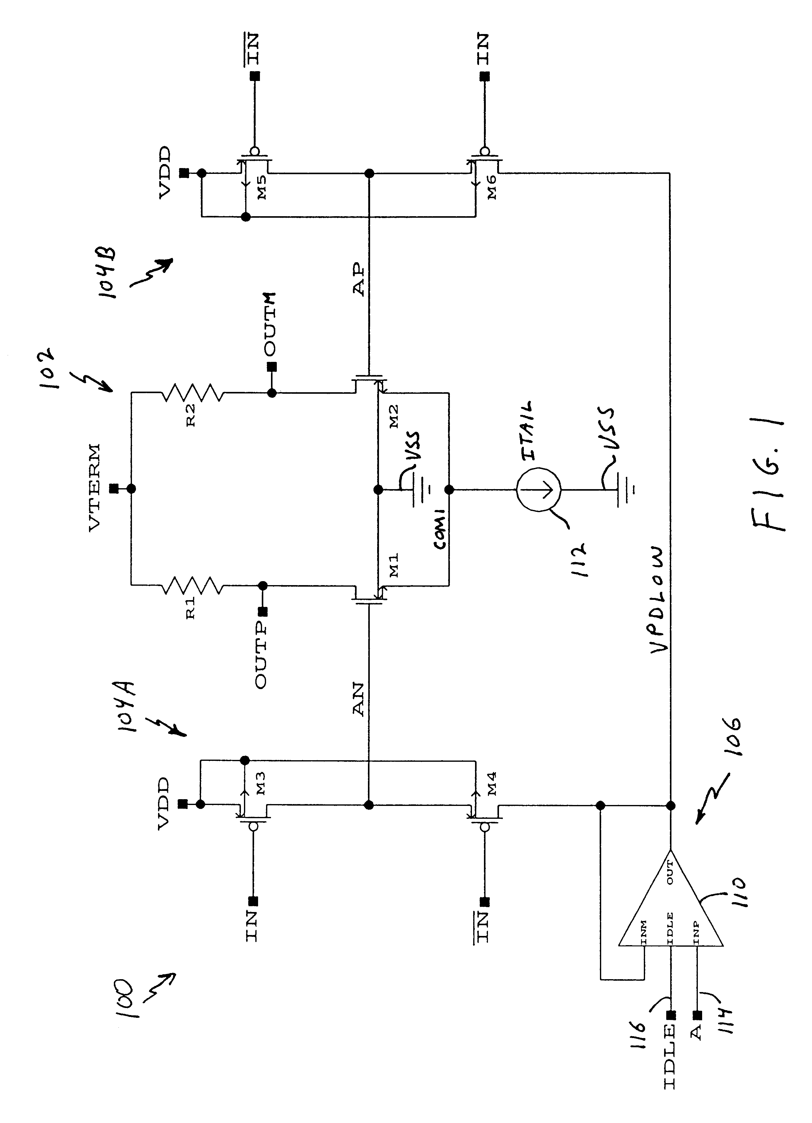 This application claims priority from U.S. Provisional Application No. 60/236,935, filed Sep. 28, 2000, and entitled “REDUCED-SWING DRIVER WITH IDLE FUNCTION.” Cross reference is also made to U.S. Application No. 09/782,806, entitled “LOW-POWER DATA SERIALIZER”, U.S. application Ser. No. 09/783,231, entitled “DATA SERIALIZER WITH SLEW RATE CONTROL”, and U.S. application Ser. No. 09/782,843, entitled, “RESISTIVELY-LOADED CURRENT-MODE OUTPUT BUFFER WITH SLEW RATE CONTROL,” which were filed on even date herewith. The present invention relates to integrated circuits. More specifically, the present invention relates to a reduced-swing differential output buffer having an idle function. High-speed data communication circuits frequently use differential output buffers for transmitting data over transmission media. In certain communication applications, there is a need to be able to reduce the differential output swing of the output buffer to zero while leaving the common-mode output level of the buffer unchanged. One existing approach for reducing the differential output swing uses first and second differential output buffers, where the second differential output buffer drives the first differential output buffer. The differential output swing of the first differential buffer is reduced to zero by cutting the tail current supplied to the second differential buffer. This causes both outputs of the second differential buffer to go to a logic high voltage level. This approach is effective in reducing the differential output swing of the first differential buffer while leaving the common-mode level of the differential output buffer unchanged, but suffers from additional power consumption by the second differential buffer during normal operation. A low-power differential output buffer is therefore desired which is capable of reducing the differential output swing of the buffer to zero while leaving the common-mode output level of the buffer unchanged. One aspect of the present invention relates to a differential output buffer which includes first and second complementary data inputs, an idle input, and a differential output stage having first and second output stage control inputs and first and second differential data outputs. First and second push-pull circuits charge one of the first and second output stage control inputs toward a logic high voltage and discharge the other of the first and second output stage control inputs toward a logic low voltage based on relative logic states of the first and second data inputs. A logic low voltage supply generator is coupled to the idle input and the logic low voltage supply terminal for setting the logic low voltage as a function of the idle input. Another aspect of the present invention relates to a differential output buffer which includes first and second complementary data inputs, an idle input, a current-mode differential output stage, first and second push-pull circuits and a voltage supply generator. The idle input has an active state and an inactive state. The differential output stage includes first and second differential data outputs and first and second output stage control inputs. The first push-pull circuit is biased in series between logic high and logic low voltage supply terminals and has first and second inputs coupled to the first and second data inputs, respectively, and an output coupled to the first output stage control input. The second push-pull circuit is biased in series between the logic high and logic low voltage supply terminals and has first and second inputs coupled to the second and first data inputs, respectively, and an output coupled to the second output stage control input. The voltage supply generator is coupled between the idle input and the logic low voltage supply terminal and generates a logic low voltage on the logic low voltage supply terminal when the idle input is in the inactive state and a logic high voltage on the logic low voltage supply terminal when the idle input is in the active state. Another aspect of the present invention relates to a method of reducing a differential output swing of a differential output buffer. The method includes: providing a differential transistor pair between first and second differential data outputs and a tail current source, wherein the differential transistor pair comprises first and second output stage control inputs; receiving first and second complementary data inputs; receiving an idle input having an active state and an inactive state; driving the first and second output stage control inputs between a logic high voltage level and a logic low voltage level using P-channel type transistors, based on relative logic states of the first and second data inputs; and raising the logic low voltage level toward the logic high voltage level when the idle input is in the active state. Differential transistor pair M1 and M2 steer the tail current ITAIL through one side of output stage 102 or the other, depending on the relative voltages on the gates of each transistor in the pair. Thus, one of the differential outputs OUTP and OUTM will be pulled low by tail current source 112, and the other will be pulled high through the respective load resistor R1 or R2. The gates of transistors M1 and M2 are coupled to respective output stage control inputs AN and AP. Push-pull circuits 104A and 104B drive one of the output stage control inputs AN and AP high, and the other low, based on the relative logic states on data inputs IN and {overscore (IN)}. Push-pull circuit 104A includes P-channel pull-up transistor M3 and P-channel pull-down transistor M4. Pull-up transistor M3 is coupled in series between voltage supply terminal VDD and output stage control input AN. Pull-up transistor M3 has a gate (i.e., a control terminal) which is coupled to data input IN and a substrate which is coupled to voltage supply terminal VDD. Pull-up transistor M3 drives output stage control input AN 