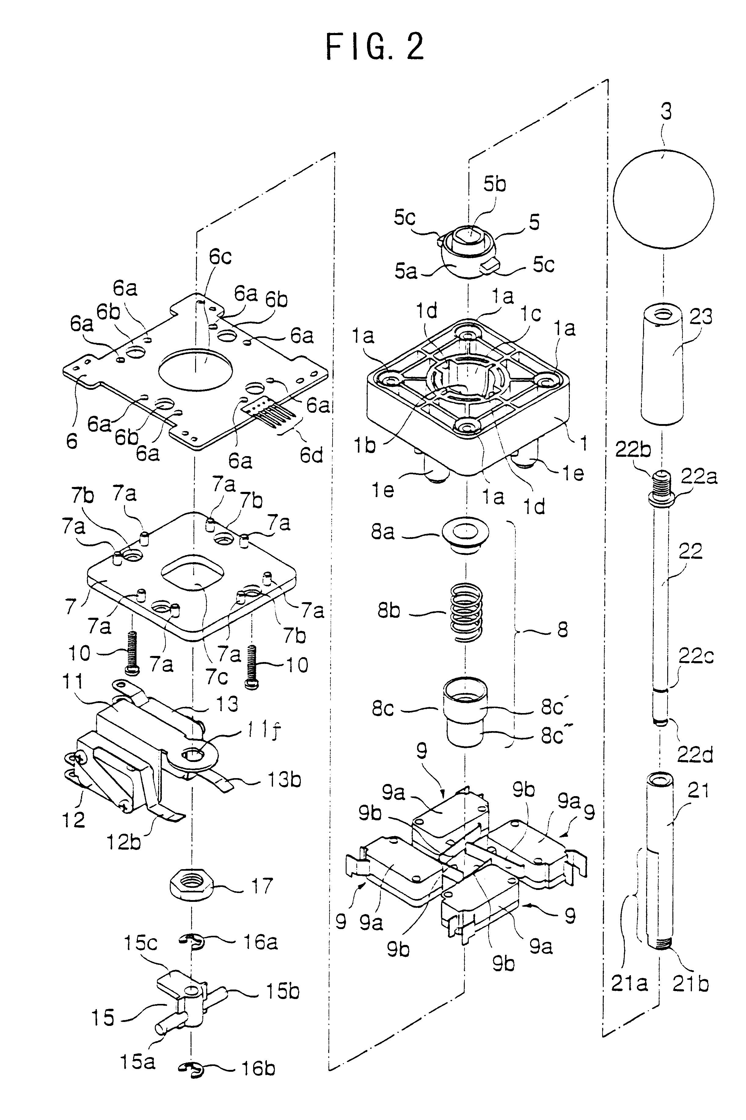[40]More specifically, referring to FIG. 3, as the large diameter portion 8c′ of the spring holder 8 fitted upon the first shaft 21 moves in the guide holder 7c following the movement of the joystick assembly 2, the corresponding hinged lever 7c is deflected as shown by the imaginary lines 9b′ in the drawing, and the corresponding micro-switch 9a is activated. As a result, in the illustrated embodiment, a selected one of the micro-switches is activated when the joystick assembly 2 is tilted in the forward, rearward, right or left direction, but, when the stick assembly 2 is tilted in an oblique direction, the two micro-switches on either side of the tilting direction are activated. Therefore, a four-bit signal indicating the tilting direction is obtained from these micro-switches via a connector pin array 6d. The micro-switches, in this case, are directly mounted on the switch mounting plate 6, and the output signal therefrom is forwarded to the connector pin array 6d via an electroconductive circuit pattern (not shown in the drawing) formed on the switch mounting plate 6.