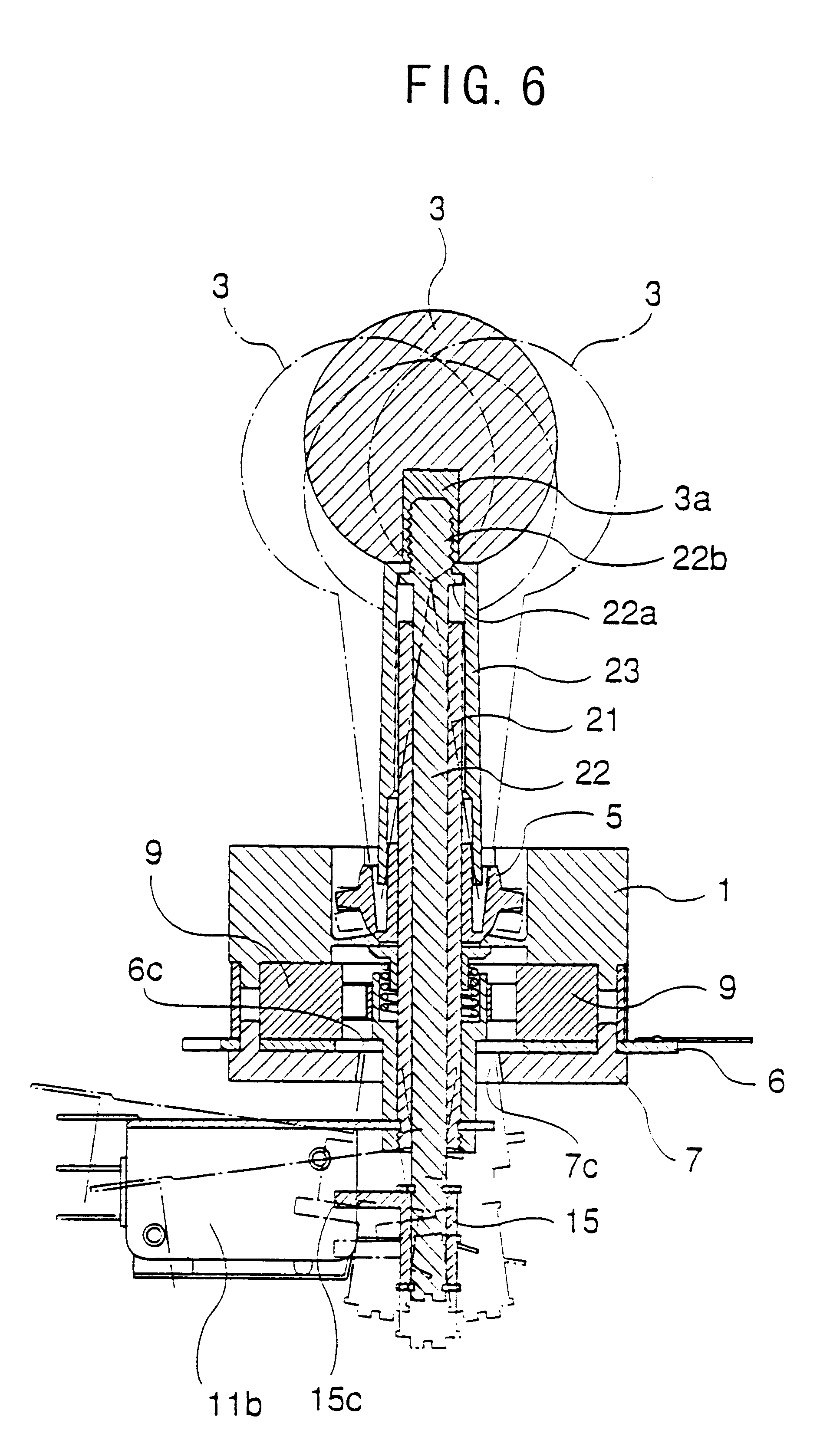 [41]Now is described the sliding direction detecting mechanism for detecting the axial pushing and pulling movement of the ball knob 3. To the lower end of the first shaft 21 is attached a pair of limit switches 12 and 13 via a switch holder 11. As best shown in FIG. 4, the switch holder 11, which in this case consists of a metallic member, comprises right and left vertical mounting plates 11a and 11b, a horizontal connecting plate 11c connecting the upper ends of the vertical mounting plates to each other, and a tongue piece lid extending from the horizontal connecting plate 11c and provided with a mounting hole 11f for passing a mounting screw. Numeral 11e denotes threaded holes for receiving screws which securely attach the micro-switches to the corresponding vertical mounting plates 11a and 11b. The switch holder 11 is attached to the lower end of the first shaft 21 by passing the threaded portion 21b of the first shaft 21 into the mounting hole 11f of the tongue piece 11, and fastening the nut 17 onto the threaded portion 21b. The limit switches 12 and 13 each comprise a micro-switch 12a or 13a, and a hinged lever 12b or 13b made of spring material. Numerals 11e, 12c, 12d, 13c and 13d denote mounting holes for passing mounting screws 14. These limit switches 12 and 13 are mounted on the vertical mounting plates 11a and 11b of the switch holder 11 in a mutually inverted relationship, and are fixedly secured by fastening the screws 14 passed through the mounting holes 12d, 12c, 13d and 13c and threaded into the threaded holes 11e of the vertical mounting plates 11a and 11b. Thus, the restoring force acting on the hinged lever 12b of the limit switch 12 is directed upward while the restoring force acting on the hinged lever 13b of the limit switch 13 is directed downward. Numeral 12e denotes the pushbutton-like actuating parts of the micro-switches.