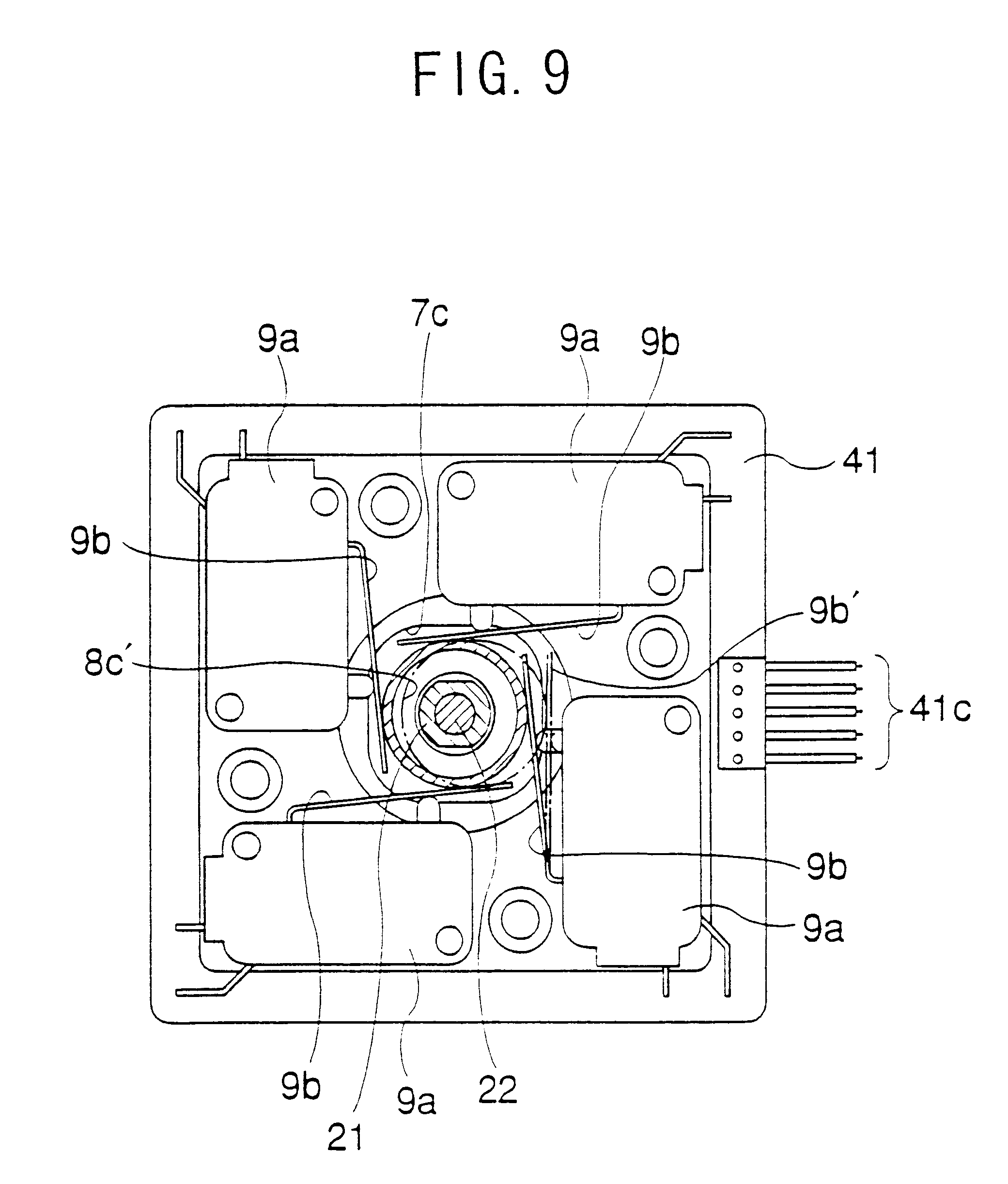 [57]Now is described the circuit board which includes a circuit pattern for collecting signals from the individual limit switches 9, and leading out the combined signal to the outside. In the first embodiment, the switch mounting plate 6 was used as the circuit board for leading the combined signal from the limit switches 9. The micro-switches 9a of the limit switches 9 were mounted on the switch mounting plate 6, and the terminal pins extending from the micro-switches 9a were soldered to the appropriate pads of the circuit pattern on the switch mounting plate 6. The need for such a soldering step preceding the final assembly process is not desirable in view of the assembling cost. The second embodiment eliminates such a problem.