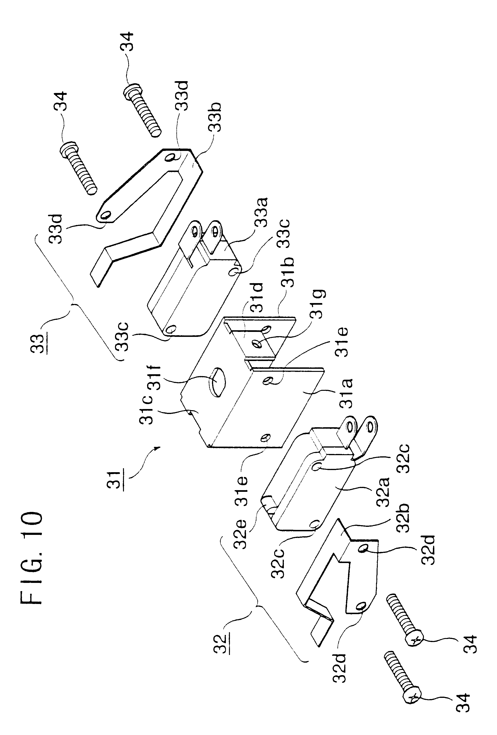 [53]The limit switches 32 and 33 each consist of a micro-switch 32a or 33a and a hinged lever 32b or 33b made of spring material. Numerals 32c, 32d, 33c and 33d denote holes for receiving mounting screws 34. These limit switches 32 and 33 are mounted on the vertical mounting plates 31a and 31b of the switch holder 31 in a mutually inverted relationship, and are fixedly secured by fastening the screws 34 passed through the mounting holes 32d, 32c, 33d and 33c and threaded into the threaded holes 31e of the vertical mounting plates 31a and 31b. Thus, the restoring force acting on the hinged lever 32b of the limit switch 32 is directed upward while the restoring force acting on the hinged lever 33b of the limit switch 33 is directed downward. Numeral 32e denotes the pushbutton-like actuating part of the limit switch 32.