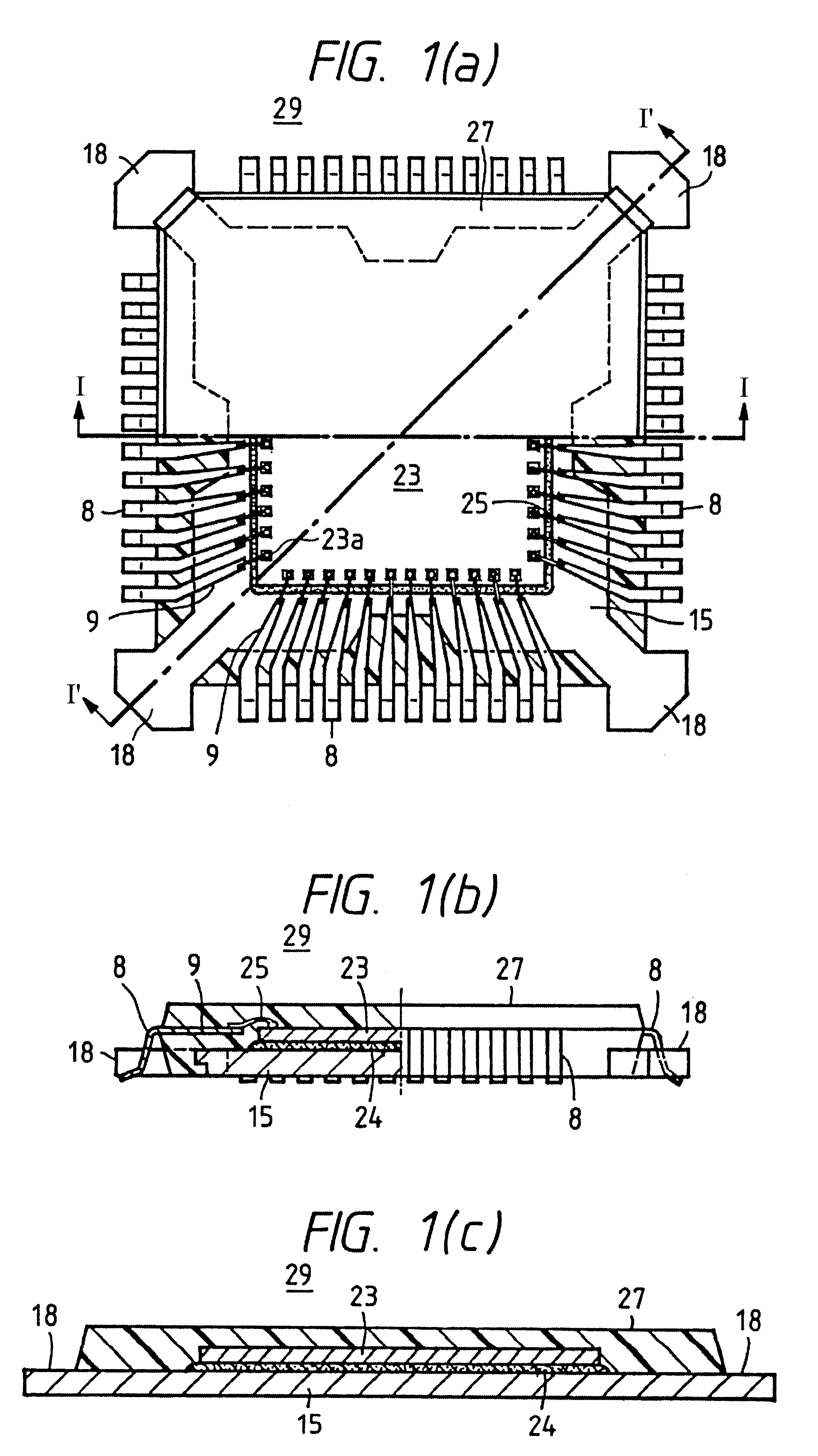 A QFP adapted to lowering the heat resistance and increasing the number of pins, and a method of producing the same. The QFP includes a heat-radiating metal plate having bumpers formed at the four corners thereof as a unitary structure, a semiconductor chip mounted on the heat-radiating metal plate, leads provided on the heat-radiating metal plate and surrounding the peripheries of the semiconductor chip, bonding wires for connecting the leads to the semiconductor chip, and a sealing resin member for sealing part of the semiconductor chip, inner leads of the leads, bonding wires and part of the heat-radiating metal plate. The tips of the bumpers integrally formed with the heat-radiating metal plate are positioned outside the tips of the outer leads that are protruding from the sealing resin member. In the QFP producing method, the heat-radiating metal plate having the bumpers and the lead frame having the leads are secured outside the sealing resin member.