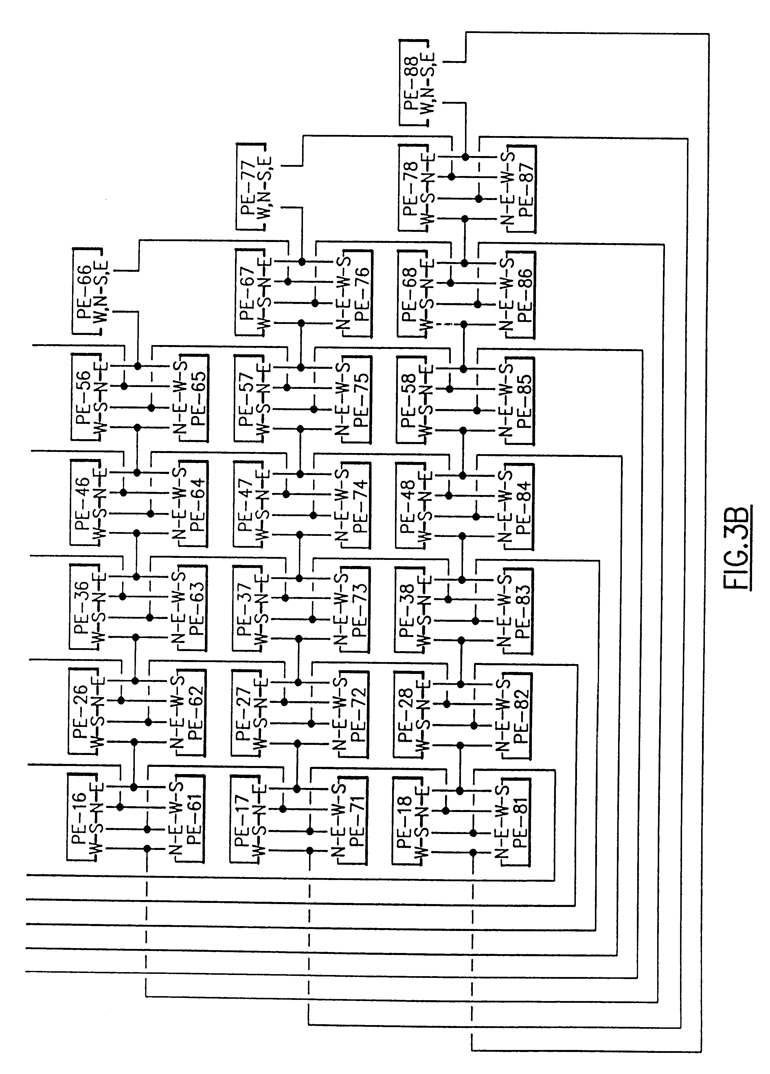 the PEs each coupled to four adjacent ones of the plurality of PES each at one of said plurality of I/O ports, and wherein each PE along an edge of the array is wraparound coupled to another PE of the plurality of PEs along a nonadjacent edge of the array, said four adjacent ones of the PEs are designated as north, south, east and west PEs;