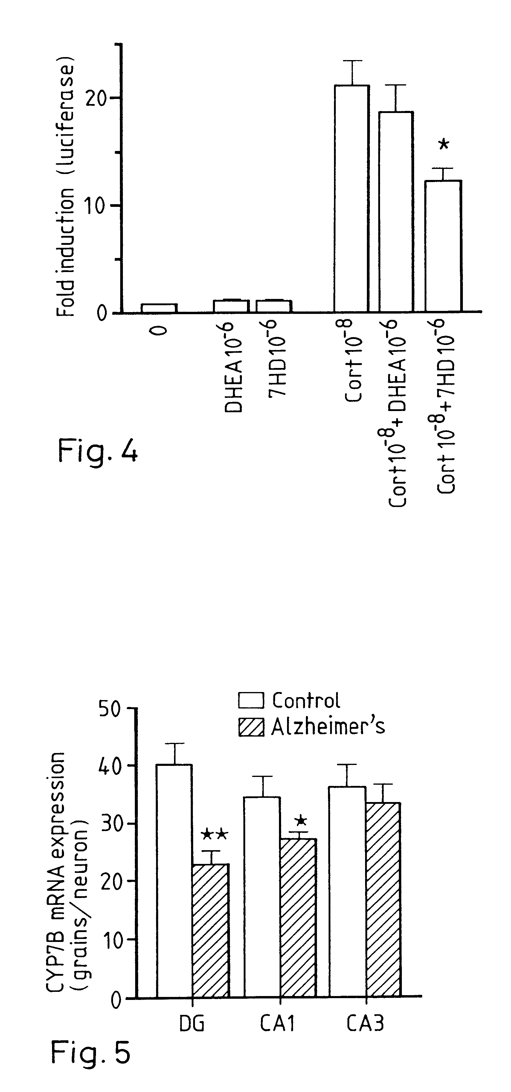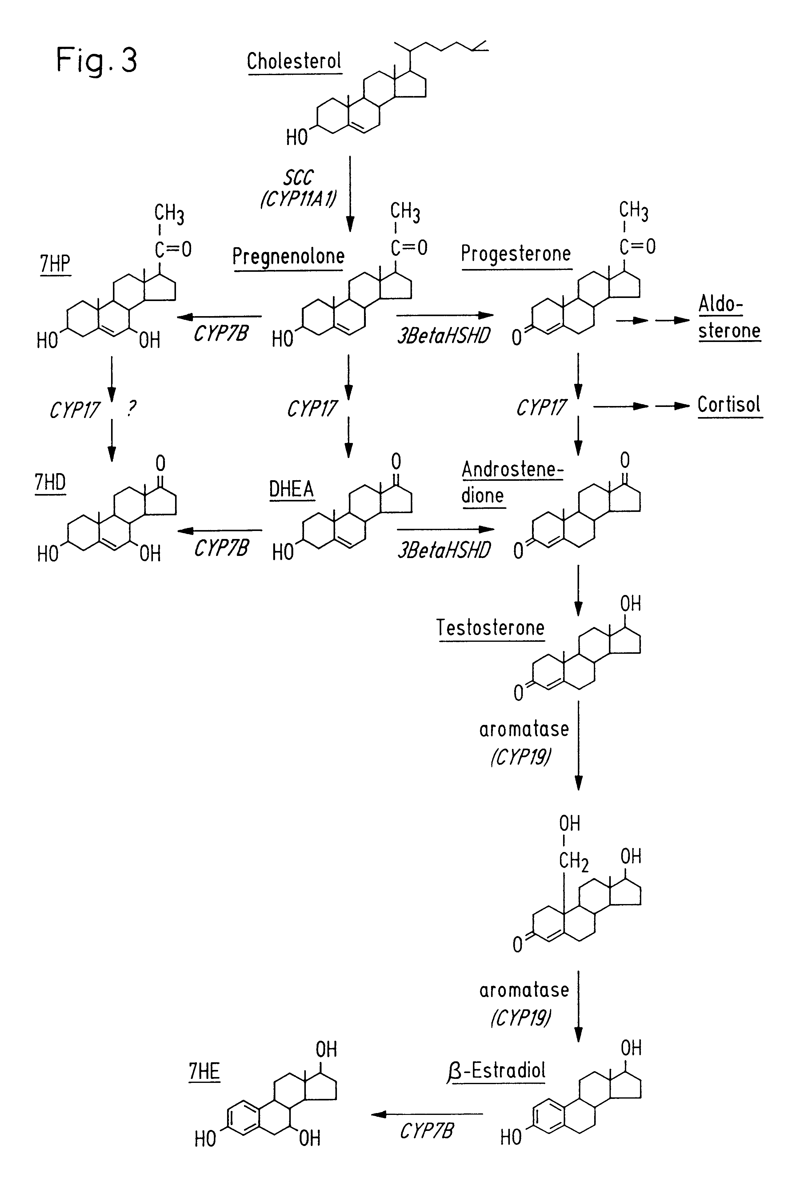 This is a continuation of PCT application No. PCT/GB97/00955, filed Apr. 4, 1997. The present invention relates to novel uses for 7α-hydroxy-substituted steroids, to a process for preparing such steroids and to novel steroids so produced. In particular the invention relates to the use of cytochromes of the cytochrome P450 family designated Cyp7b to effect 7α-hydroxylation of certain 3β-OH steroids so as to produce a 7α-hydroxy-substituted steroids. Certain of the 7α-hydroxy-substituted steroids so produced, as well the corresponding 7-oxo derivatives, are novel and form further aspects of the invention. The invention also relates to uses of these steroids, to uses of Cyp7b enzymes and to uses of novel macromolecular species, e.g. antibodies and DNAs, which are biologically related to the Cyp7b enzymes. Cytochromes P450 are a diverse group of heme-containing mono-oxygenases (termed CYP's; see Nelson et al., DNA Cell Biol. (1993) 12, 1-51) that catalyse a variety of oxidative conversions, notably of steroids but also of fatty acids and xenobiotics. While CYP's are most abundantly expressed in the testis, ovary, placenta, adrenal and liver, it is becoming clear that the brain is a further site of CYP expression. Several CYP activities or mRNA's have been reported in the nervous system but these are predominantly of types metabolizing fatty acids and xenobiotics (subclasses CYP2C, 2D, 2E and 4). However, primary rat brain-derived glial cells have the capacity to synthesize pregnenolone and progesterone in vitro. Mellon and Deschepper, Brain Res. (1993), 629, 283-292(9) provided molecular evidence for the presence, in brain, of key steroidogenic enzymes CYP11A1 (scc) and CYP11B1 (11β) but failed to detect CYP17 (c17) or CYP11B2 (AS). Although CYP21A1 (c21) activity is reported to be present in brain, authentic CYP21A1 transcripts were not detected in this tissue. Interest in steroid metabolism in brain has been fuelled by the finding that adrenal- and brain-derived steroids (neurosteroids) can modulate cognitive function and synaptic plasticity. For instance, pregnenolone and steroids derived from it are reported to have memory enhancing effects in mice. However, the full spectrum of steroid metabolizing CYP's in brain and the biological roles of their metabolites in vivo has not been established. Many aspects of brain function are modulated by steroids. Intracellular receptors for glucocorticoids (cortisol, corticosterone) are particularly abundantly expressed in the hippocampus (1), a brain region that plays a key role in specific aspects of memory formation, and which is an early and prominent target for dysfunction and damage in Alzheimer's disease (AD). While glucocorticoids regulate learning and memory, mood and neuroendocrine control, chronic glucocorticoid excess compromises neuronal activity, synaptic plasticity and eventually survival, particularly in the hippocampus. These findings prompted the suggestion that glucocorticoid-mediated neurotoxicity might underpin some age-related brain disorders, including AD, in which plasma cortisol levels are markedly elevated (2). Conversely, dehydroepiandrosterone (DHEA), the most abundant steroid product of the human adrenal cortex, has been proposed to protect against disorders of the aging brain (3). Plasma levels of DHEA often show a striking age-associated decline which correlates with loss of cognitive function (4). In rodents, injection of DHEA or its sulfate into limbic structures improves post-training memory and enhances synaptic plasticity (5). DHEA and glucocorticoids thereby appear to exert inverse effects upon memory function and synaptic plasticity, and DHEA has been advocated as an endogenous ‘anti-glucocorticoid’. However, despite considerable circumstantial evidence to support this contention, there is no evidence for a direct interaction between DHEA and glucocorticoid signalling pathways in neurons. Neurosteroidogenesis has been reported in isolated rat retina (8) and brain (9). In addition to the production of pregnenolone and DHEA from cholesterol, a variety of novel steroids are made in brain extracts or cultured brain cells, including 20α-dehydropregnenolone, 7α-hydroxy derivatives of pregnenolone and DHEA, progesterone, and both 3α- and 3β-hydroxy-5α-pregnan-20-one (reviewed in Ref. 7). Androgens are also modified, particularly through the action of aromatase and a 5α-reductase (reviewed in Ref. 10). However, the specific enzymes responsible for these and other transformations in the central nervous system have not been well characterized. As referred to above, several Cyps are present in the central nervous system (11-22). Activities or mRNAs corresponding to key steroidogenic enzymes (23-25), in addition to Cyp19 (aromatase) have been detected. Furthermore, mRNAs encoding the non-Cyp hydroxysteroid dehydrogenases (HSD) 3α-HSD, 3β-HSD and 11β-HSD have been reported in the central nervous system (25, 27-29). To investigate regulation of brain function, studies reported in copending International Patent Application No PCT/GB95/02465, published as WO 96/12810, and in Stapleton et al (J. Biol. Chem. 270, 29739-1995, Dec. 15, 1995), focused on the hippocampus, a brain region important in learning and memory. A copy of the specification of International Patent Application No PCT/GB95/02465 has been filed with the priority documents filed in respect of this specification. That copending application, PCT/GB95/02465, describes and claims novel cytochrome P450 proteins designated Hct-1. These Hct-1 proteins have now been named as Cyp7b by the Committee on Standardized Cytochrome P450 Nomenclature and the name Cyp7b will be used in this application. The Cyp7b enzyme shares 39% sequence identity to hepatic cholesterol 7α-hydroxylase (Cyp7a) and lesser but significant homology with other steroidogenic Cyps. The postulated steroidogenic domain (30,31), found in many of these enzymes, is present in both Cyp7a and 