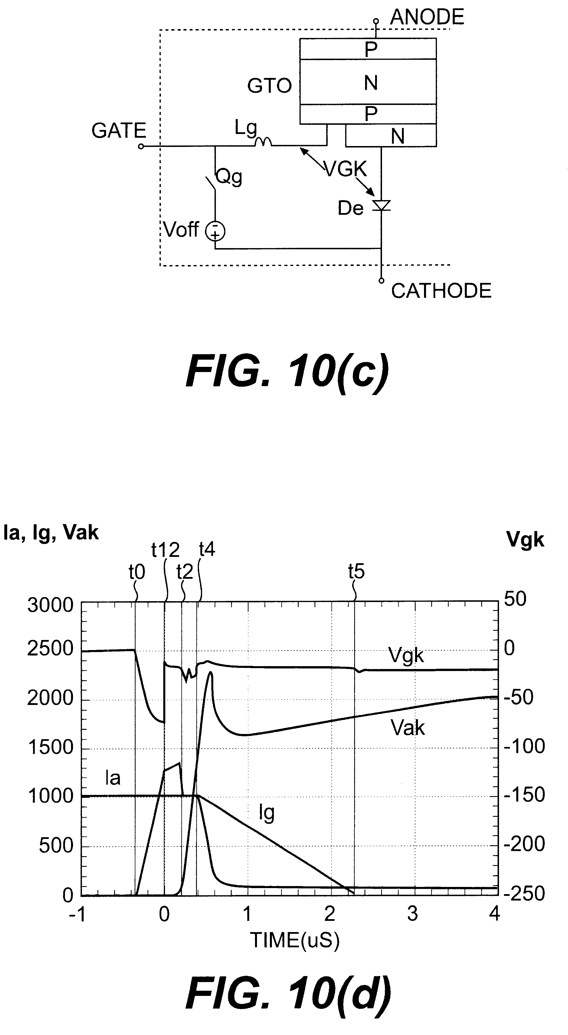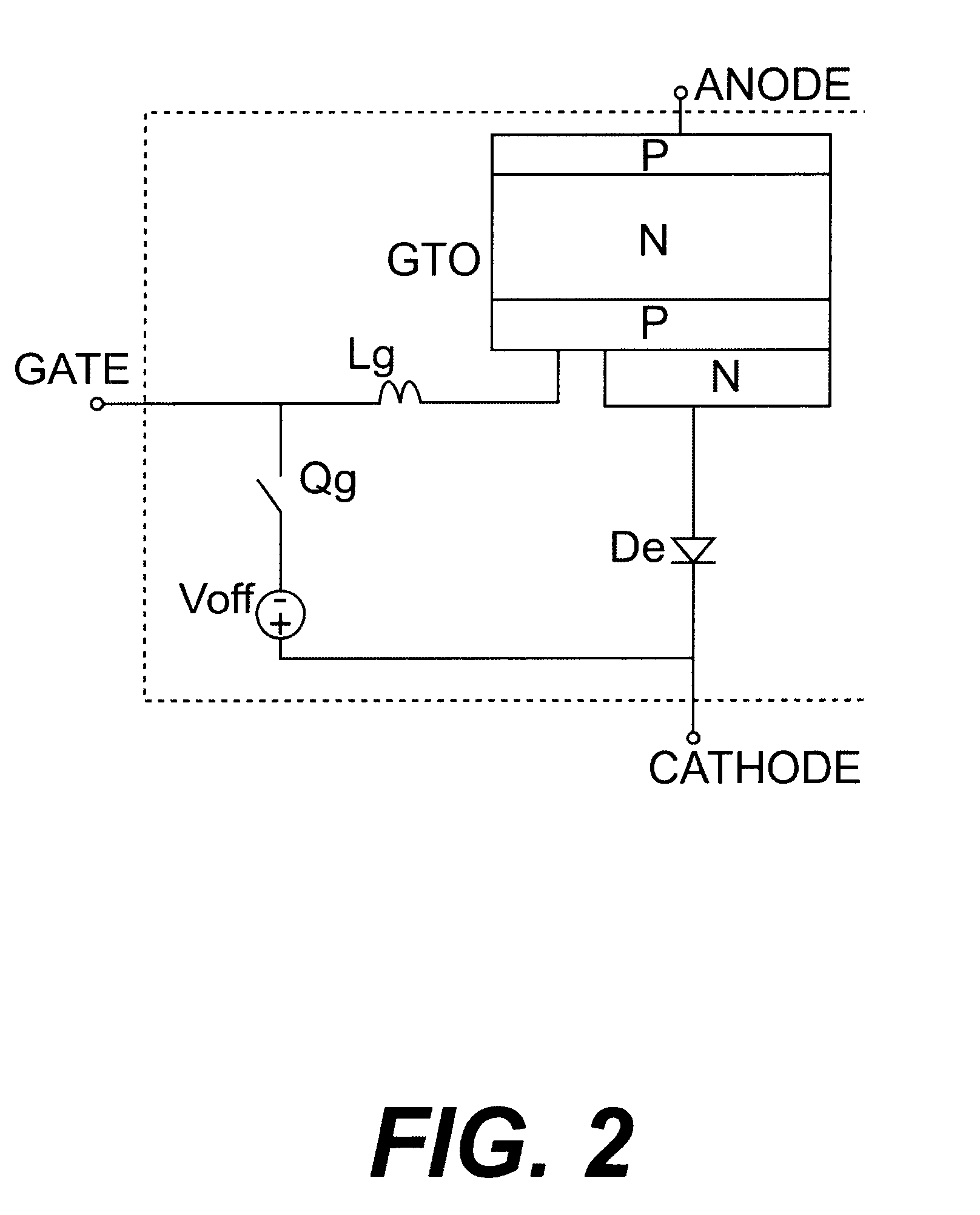 This application claims the benefit of provisional Application Serial No. 60/164,555, filed on Nov. 10, 1999, the contents of which is hereby incorporated by reference. 1. Field of the Invention This invention generally relates to gate-controlled switches, and more particularly to a gate turn-off thyristor which achieves enhanced performance through an improvement in turn-off current commutation. 2. Description of the Related Art Gate turn-off (GTO) thyrisitor switches are the foundation of the high-power electronics industry. Structurally, GTO thyristors are four-layered, three-terminal silicon semiconductor devices which resemble a traditional thyristor in terms of performance but has the additional attribute that anode current can be turned off by control of its gate. Traditionally, a GTO's turn-off performance is limited by the slow gate current rising rate, and the turn-off is conducted with a turn-off gain (defined as Ia/Igat turn-off point) in the range of 3 to 5. Major drawbacks of the GTO include: 1) large gate control power due to the fact that the gate current has to be supplied for a long time; 2) slow switching speed due to long storage time; and 3) poor turn-off Safe Operation Area (SOA) due to non-uniform current distribution during turn-off. Because of the poor SOA problem, a GTO turn-off requires a dV/dt snubber, typically in the form of an R-C-D network. The RCD snubber is not only bulky, but also very lossy because each time the GTO turns on it will have to dissipate the energy stored in the snubber capacitor. The slow switching speed and high control power limits GTO's application in high frequency Pulse Width Modulation (PWM) converters. In recent years, the turn-off performance of GTO thyristors has been significantly improved by turning it off at the unity-gain condition (Ig=Iaat turn-off). By taking this approach, also known as hard-driven approach, the turn-off storage time has been shortened from typically several tens of microseconds to about one microsecond. The maximum turn-off current hence the SOA of these GTO thyristors has been significantly increased and the bulky and costly dv/dt snubber can be removed. High-power, hard-driven GTO thyristors can operate at frequencies of one kilohertz or above in a practical application system. See Motto et al. “The Emitter Turn-Off Thyristor (ETO) Based High Voltage, High Frequency Converter System,” 1999 Center for Power Electronics Systems Annual Power Electronics Seminar, pages 340-345. The condition known as unity gain turn-off corresponds to a situation where the cathode current is completely commutated to its gate before the end of the storage stage, or before the anode voltage increases. The essence of this is to break the PNPN latch-up mechanism, changing the GTO into an open-base PNP transistor mode during the turn-off transient. Typically, the GTO has a storage time of 1 microsecond under the unity gain turn-off condition. Therefore, the current commutating rate has to be very high (˜anode current/1 μsec) for high-current GTOs. Three major methods (devices) have been reported for operating GTOs in the unity turn-off gain condition. The first method was applied to an emitter turn-off (ETO) thyristor which made use of two switches to realize the high turn-off current commutation. During turn-off, its emitter switch QEis turned off while the gate switch QGis turned on. A voltage as high as the breakdown voltage of QEcan be applied on the gate loop stray inductor LG, realizing fast current commutation. See Li et al., “Introducing the Emitter Turn-Off Thyristor (ETO),” IEEE Industry Applications Society 33rd Annual Meeting, Oct. 12-15, 1998, pages 860-864. The second method was applied to a MOS turn-off (MTO) thyristor. This device was implemented using only a gate switch QGDuring turn-off, the gate switch is turned on, bypassing the current through the GTO gate-cathode diode and realizing unity gain turn-off. See Piccone et al., “The MTO Thyristor—A new High Power Bipolar MOS Thyristor,” IEEE Industry Applications Society 31st Annual Meeting, Oct. 6-10, 1996, pages 1472-1473. The third method was applied to an integrated gate commutated thyristor (IGCT) . This IGCT uses one voltage source and one gate switch. By dramatically decreasing the gate loop stray inductance, a high current commutation rate is achieved in the IGCT. Each of the aforementioned devices has inherent limitations which degrade performance. The emitter switch of the ETO thyristor needs to conduct the main current, so it is implemented by paralleling many MOSFETs. The turn-off voltage for the current commutation in the MTO thyristor is less than the forward voltage drop of the GTO gate-cathode diode, so the current commutation rate is low. Insofar as the IGCT is concerned, it is indisputable that the turn-off current commutation diG/dt is crucial to the performance of this type of device. As has been reported in the previously referenced Yamamoto article, even under the unity gain turn-off condition, higher commutation di/dt ensures a more uniform turn-off transient process over the entire GTO thyristor wafer. This, in turn, increases the turn-off capability of the device. Nevertheless, conventional IGCT devices remain limited by the turn-off loop stray inductance and the maximum turn-off voltage, the latter of which is typically about 20 V. More specifically, in conventional IGCT devices a further increase of the turn-off current commutation diG/dt is difficult because of its gate loop stray inductance LGand the maximum available voltage source VOFFthat can be used. For example, the gate loop stray inductance of a 4-inch IGCT has been reduced to 3 nH, which is considered to be very low and is even harder to decrease. The maximum gate turn-off voltage that can be applied to the IGCT has to be less than the breakdown voltage of the GTO's gate-cathode diode. Because this breakdown voltage is typically about 20 V, a maximum of about 