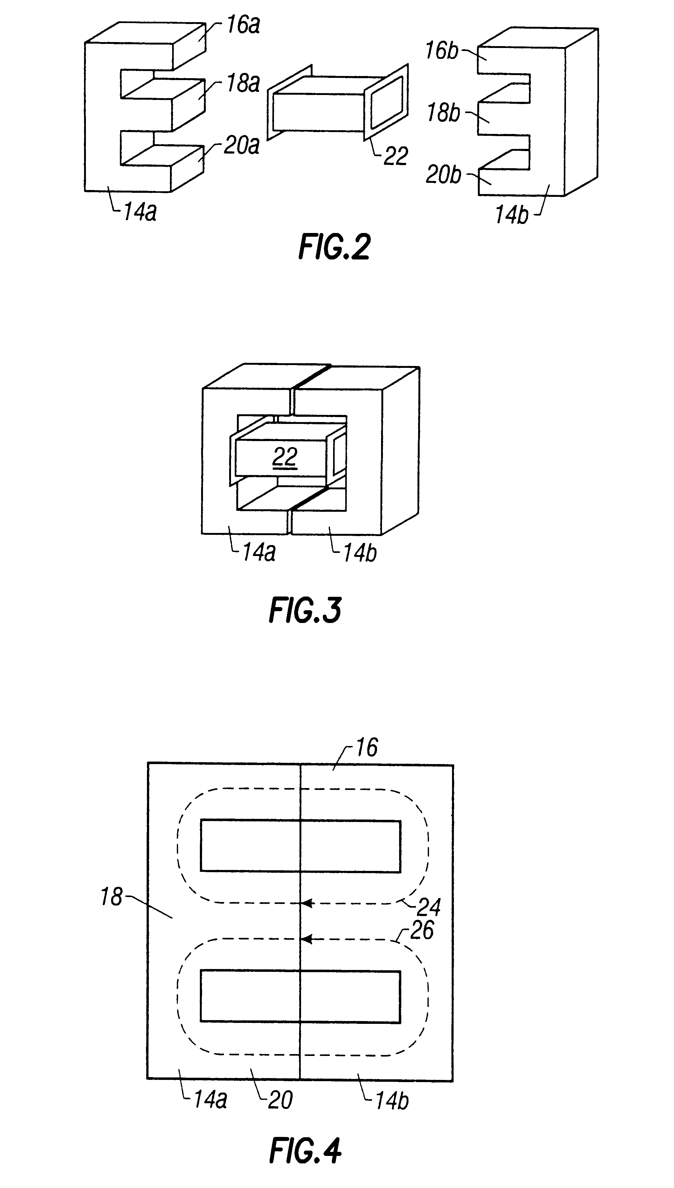1. A data communication isolation transformer comprising: a transformer core with a relatively high magnetic permeability, the core including two E-shaped sections adjacent to and in contact with each other so as to form two flux paths through the core, each of which passes through a center portion of the core; a bobbin that is mountable on the center portion of the core; the primary winding wound about the bobbin; a secondary winding wound about the bobbin; and an electromagnetic shield located between the primary winding and the secondary winding; wherein the core, bobbin, primary winding, secondary winding and shield together being located within an integrated circuit (IC) package and used for the purpose of data communication isolation. 2. A transformer according to 3. A transformer according to 4. A transformer according to 5. A transformer according to 6. A transformer according to 7. A transformer according to 8. A transformer according to 9. A transformer according to 10. A transformer according to 11. A transformer according to 12. A transformer according to 13. A transformer according to 14. A data communication isolation transformer comprising: a transformer core with a relatively high magnetic permeability, the core including two E-shaped sections adjacent to and in contact with each other so as to form two flux paths through the core, each of which passes through a center portion of the core; a non-conductive bobbin that is mountable on the center portion of the core; a primary winding wound about the bobbin; a secondary winding wound about the bobbin; an electromagnetic shield of conductive material located between the primary winding and the secondary winding; and an integrated circuit (IC) package within which the core, bobbin, primary winding, secondary winding and shield are located, the IC package including mounting pins to which the primary winding and secondary winding are electrically connected; wherein said transformer issued for the purpose of data communication. 15. A transformer according to 16. A transformer according to 17. A transformer according to 18. A transformer according to 19. A transformer according to 20. A transformer according to 21. A data communication isolation transformer comprising: a transformer core with a relatively high magnetic permeability, the core including two E-shaped sections adjacent to and in contact with each other so as to form two flux paths through the core, the flux paths each passing through one of two outer portions of the core and both passing through a center portion of the core, and wherein the center portion of the core has a crosssectional area which is substantially twice the cross-sectional area of either of the outer core portions; a non-conductive bobbin that is mountable on the center portion of the core; a primary winding wound about the bobbin; a secondary winding would about the bobbin; an electromagnetic shield of conductive material located between the primary winding and the secondary winding, the shield being electrically connectable to an electrical ground of a system in which the transformer is used ; and an integrated circuit (IC) package within which the core, bobbin, primary winding, secondary winding, and shield are located, the IC package including mounting pins to which the primary winding and secondary winding are electrically connected; wherein the transformer is used for the purpose of data communication isolation.