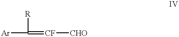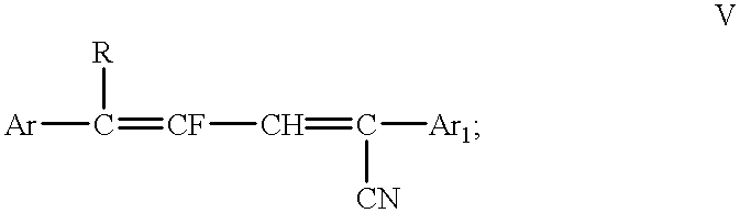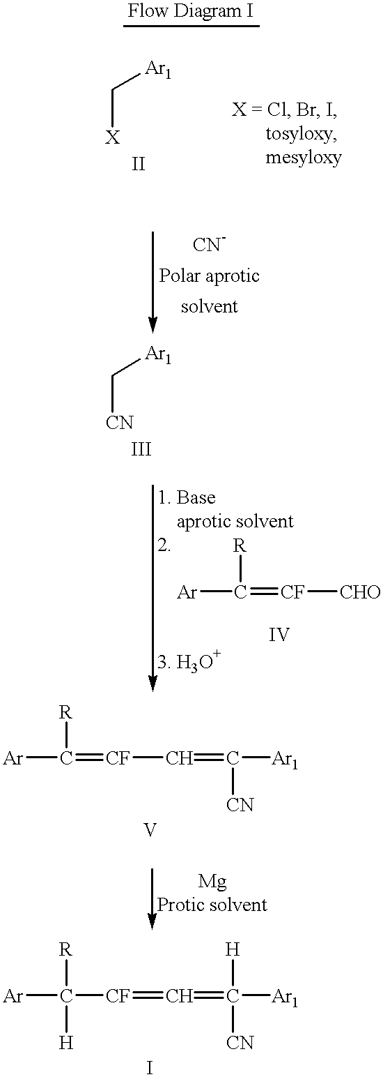 This application claims priority from copending provisional application(s) Ser. No. 60/201,826 filed on May 4, 2000. Certain fluoroolefin compounds are known to possess insecticidal and acaricidal activity (see, e.g., U.S. Pat. No. 5,248,834; GB 2,288,803-A; WO 94/06741; WO 97/16067; and U.S. Pat. No. 5,998,673. However, the fluoroolefin compounds disclosed in those patents and patent applications are outside the scope of the present invention. U.S. Pat. No. 5,248,834 generically discloses certain 1-aryl-1-(3-aryl-1,2-difluoroprop-1-enyl)cyclopropane compounds. However, that patent does not provide a method to prepare those compounds. In fact, U.S. Pat. No. 5,248,834 does not provide a method to prepare any fluoroolefin compounds. 1,4-diaryl-2-fluoro-4-cyano-2-butenes and a method for their preparation are described in U.S. Pat. No. 5,998,673. Said compounds are useful as insecticidal and acaricidal agents and for protecting plants from damage caused by insect and acarid attack and infestation. Although a method for the preparation of said agents is known, alternative more effective methods contribute to the enhanced availability of these useful insecticidal and acaricidal agents. It is, therefore, an object of the present invention to provide a process for the preparation of 1,4-diaryl-2-fluoro-4-cyano-2-butenes. It is also an object of the present invention to provide intermediates useful in said process. These and other objects of the present invention will become more apparent from the detailed description thereof set forth below. The present invention provides a process for the preparation of insecticidal and acaricidal 1,4-diaryl-2-fluoro-4-cyano-2-butene compounds of structural formula I wherein Ar is phenyl optionally substituted with any combination of from one to three halogen, C1-C4alkyl, C1-C4haloalkyl, C1-C4alkoxy or C1-C4haloalkoxy groups, 1- or 2-naphthyl optionally substituted with any combination of from one to three halogen, C1-C4alkyl, C1-C4haloalkyl, C1-C4alkoxy or C1-C4haloalkoxy groups, or a 5- or 6-membered heteroaromatic ring optionally substituted with any combination of from one to three halogen, C1-C4alkyl, C1-C4haloalkyl, C1-C4alkoxy or C1-C4haloalkoxy groups; R is hydrogen, C1-C4alkyl, C1-C4haloalkyl, C3-C6cycloalkyl or C3-C6halocycloalkyl; and Ar1 is phenoxyphenyl optionally substituted with any combination of from one to six halogen, C1-C4alkyl, C1-C4haloalkyl, C1-C4alkoxy or C1-C4haloalkoxy groups, phenyl optionally substituted with any combination of from one to five halogen, C1-C4alkyl, C1-C4haloalkyl, C1-C4alkoxy or C1-C4haloalkoxy groups, biphenyl optionally substituted with any combination of from one to five halogen, C1-C4alkyl, C1-C4haloalkyl, C1-C4alkoxy or C1-C4haloalkoxy groups, phenoxypyridyl optionally substituted with any combination of from one to five halogen, C1-C4alkyl, C1-C4haloalkyl, C1-C4alkoxy or C1-C4haloalkoxy groups, benzylpyridyl optionally substituted with any combination of from one to five halogen, C1-C4alkyl, C1-C4haloalkyl, C1-C4alkoxy or C1-C4haloalkoxy groups, benzylphenyl optionally substituted with any combination of from one to five halogen, C1-C4alkyl, C1-C4haloalkyl, C1-C4alkoxy or C1-C4haloalkoxy groups, benzoylphenyl optionally substituted with any combination of from one to five halogen, C1-C4alkyl, C1-C4haloalkyl, C1-C4alkoxy or C1-C4haloalkoxy groups, 1- or 2-naphthyl optionally substituted with any combination of from one to three halogen, C1-C4alkyl, C1-C4haloalkyl, C1-C4alkoxy or C1-C4haloalkoxy groups, or a 5- or 6-membered heteroaromatic ring optionally substituted with any combination of from one to three halogen, C1-C4alkyl, C1-C4haloalkyl, C1-C4alkoxy or C1-C4haloalkoxy groups; or the optical isomers thereof; or the cis and trans isomers thereof which process comprises the following steps: (a) reacting an intermediate of formula II wherein Ar1 is defined as above and X is a nucleophilic replaceabale leaving group, such as halogen, alkylsulphonyloxy or arylsulphonyloxy, especially chloro, bromo, iodo, tosyloxy, mesyloxy or the like, with a cyanide delivering reagent in a first solvent to afford a cyano intermediate of formula III; (b) reacting said cyano intermediate III with an aldehyde of formula IV in the presence of a base in a second solvent to yield an anion which is acidified to afford a diene of formula V and (c) reacting said diene V with magnesium in the presence of a third solvent. This invention also provides intermediate dienes of structural formula V. Although a method for the preparation of insecticidal and acaricidal 1,4-diaryl-2-fluoro-4-cyano-2-butenes is described in U.S. Pat. No. 5,998,673, alternative more effective methods contribute to the enhanced availability of these useful insecticidal and acaricidal agents. Advantageously, the present invention provides an effective and practical method for the preparation of 1,4-diaryl-2-fluoro-4-cyano-2-butenes of formula I, wherein Ar, Ar1 and R are defined as above. In accordance with the process of the invention intermediate II is treated with a cyanide delivering reagent in a polar aprotic solvent (first solvent) to afford the cyano intermediate III. Cyano intermediate III is reacted with an aldehyde of formula IV in the presence of a base optionally in the presence of a second solvent to yield an intermediate which is acidified to afford a diene of formula V; and said diene V is reacted with magnesium in the presence of a protic solvent (third solvent) to provide 1,4-diaryl-2-fluoro-4-cyano-2-butene I. The process is depicted in Flow Diagram I. Intermediate aldehydes IV may be prepared as described in U.S. Pat. No. 5,998,673. First solvents suitable for use in the inventive process include polar aprotic solvents such as dimethylformamide, dimethylsulfoxide, N-methylpyrrolidone or the like, preferably dimethylsulfoxide. Second solvents suitable for use in the inventive process include aprotic solvents such as tetrahydrofuran, diethyl ether a