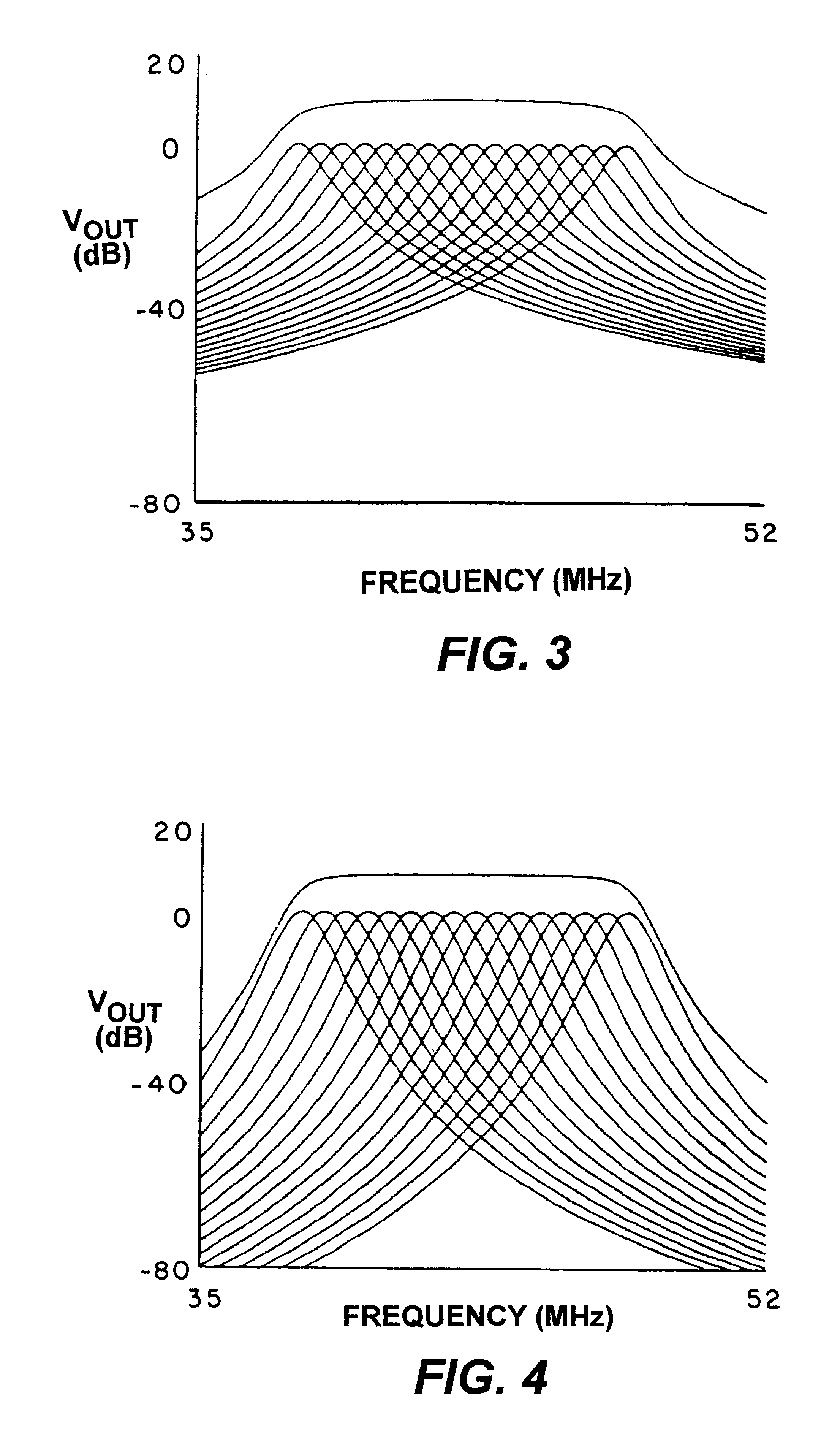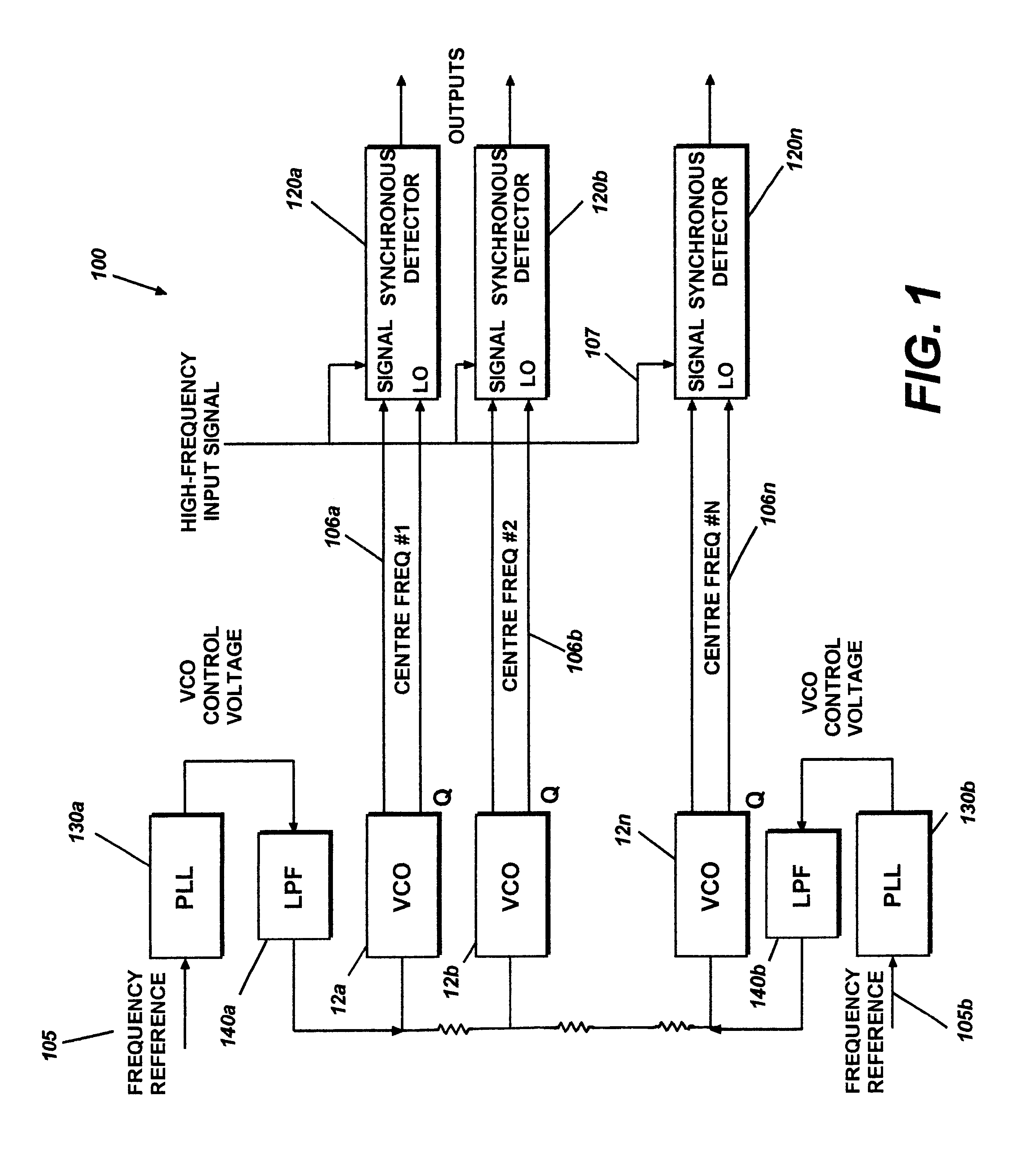 The present application is based on and claims priority from Provisional Application Serial No. 60/178,836 filed on Jan. 28, 2000. 1. Technical Field of the Invention This invention relates generally to an analog circuit, and more particularly, to an analog circuit approach to implement a continuous wavelet transform circuit to decompose an input signal using a wavelet basis to produce a time-frequency description of the input signal. 2. Description of the Related Art Decomposition of a signal into components with respect to frequency and time was studied in the past. Prior works were related to the orthogonal decomposition of a signal where time and frequency were unrelated to one another. This decomposition is called as “wavelet transform” which is dependent both on frequency and time. Various analog and switched-capacitor continuous wavelet transform circuits have been proposed for audio frequency operation. High frequency continuous wavelet transform circuits have potential applications in radar and communications signals processing. Radar applications for wavelet decomposition include chirp detection and matched filtering since radar returns are attenuated, delayed, and dilated versions of transmitted radar pulses. U.S. Pat. No. 4,974,187 to Lawton discloses a system that decomposes a digital input sequence into its digital wavelet transform. The digital sampling of an analog input to form the digital input sequence loses some of the information of the input signal. U.S. Pat. No. 5,495,554 to Edwards et al. discloses an analog wavelet transform circuitry for implementing a continuous wavelet transform by forming a multiplicity of analog wavelet outputs. The method comprises filtering an input signal to produce a multiplicity of analog wavelet outputs; sampling the multiplicity of analog wavelet outputs to produce digitally sampled wavelet data; and compressing the digitally sampled wavelet data into a reduced amount of digital data. Also, wavelet transforms have been suggested in the prior art for use in data compression wherein signal information is arranged in a fashion that would facilitate data compression. Thus, wavelet transforms have many applications in signal processing and image processing. Usually, wavelet transforms are used on discrete-time digital data. However, for certain applications, the wavelet decomposition cannot be performed in real-time using conventional sampled-data and digital techniques. The prior art references fail to teach or suggest an analog continuous wavelet transform circuit which provides a real-time wavelet decomposition at high sampling frequencies. Furthermore, none of the prior art references teach or suggest an analog wavelet transform circuit wherein increasing the number of channels (i.e., the size of the filter bank) does not increase the time required to perform the wavelet decomposition. Thus, there is a need for an analog continuous wavelet transform circuit which provides a real-time wavelet decomposition at high sampling frequencies. There is also a further need for an analog continuous wavelet transform circuit wherein increasing the number of channels (i.e., the size of the filter bank) does not increase the time required to perform the wavelet decomposition. The system and method of the present invention offers an effective solution overcoming the problems encountered by the prior art. Accordingly, the present invention is directed to an analog continuous wavelet transform circuit and method for decomposing an input signal using a wavelet basis to produce a time-frequency description of the input signal. In one aspect, the present invention is directed to an analog continuous wavelet transform apparatus which comprises a plurality of quadrature voltage controlled oscillators (VCOs) for generating center frequencies of a plurality of synchronous receivers, wherein each quadrature VCO generates differential in-phase (I) and quadrature (Q) outputs. The plurality of synchronous receivers act as a bandpass filter bank which comprises a plurality of bandpass filters. The center frequency of each of the plurality of bandpass filters is set by the frequency of a corresponding voltage controlled oscillator, and bandwidth of each of the bandpass filters is set by bandwidth of a lowpass filter of a corresponding synchronous receiver. The bandwidths of each of the bandpass filters is chosen in such a manner so as to make the overall power response of the bank of bandpass filters uniform over the frequency range of the bandpass filter bank. Each of the synchronous receivers of the analog continuous wavelet transform apparatus further comprises at least one multiplier, at least one gain amplifier, and at least one squarer for both in-phase (I) and quadrature (Q) phase to produce a squarer output, and means for combining the squarer outputs to produce a synchronous receiver output. Gilbert multipliers may be used to perform the multiplication and squaring functions. The wavelet transform apparatus further includes a circuit to remove the offset of the gain amplifier. The output of each of the synchronous receivers represents the instantaneous input signal power within a specific bandpass filter. Each of the bandpass filters may act as a channelized receiver. Each squarer further comprises at least one adder circuit, and an analog compressing circuit implemented within the adder circuit in order to increase the dynamic range of the wavelet transform apparatus. The order of each of the bandpass filters is determined by the order of a corresponding synchronous, receiver. Resistive dividers may be used to bias the intermediate VCOs among the plurality of the VCOs. The endpoints of the resistor dividers may be biased using fixed voltages or by using phase locked loops (PLLs) having fixed frequency reference as inputs. The voltages to the resistor voltage dividers are controlled by applying programmable voltages. The wavelet transform apparatus fur