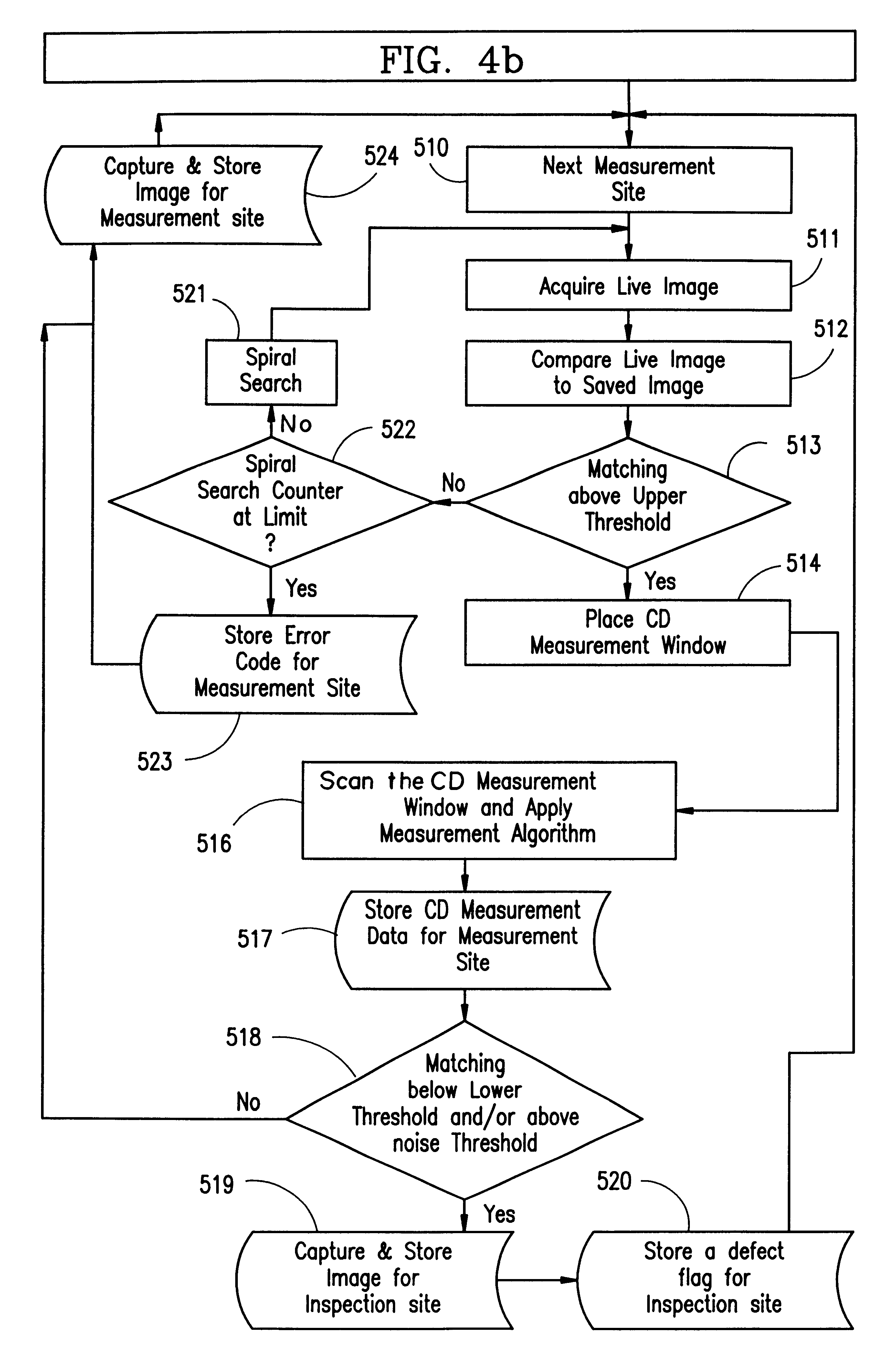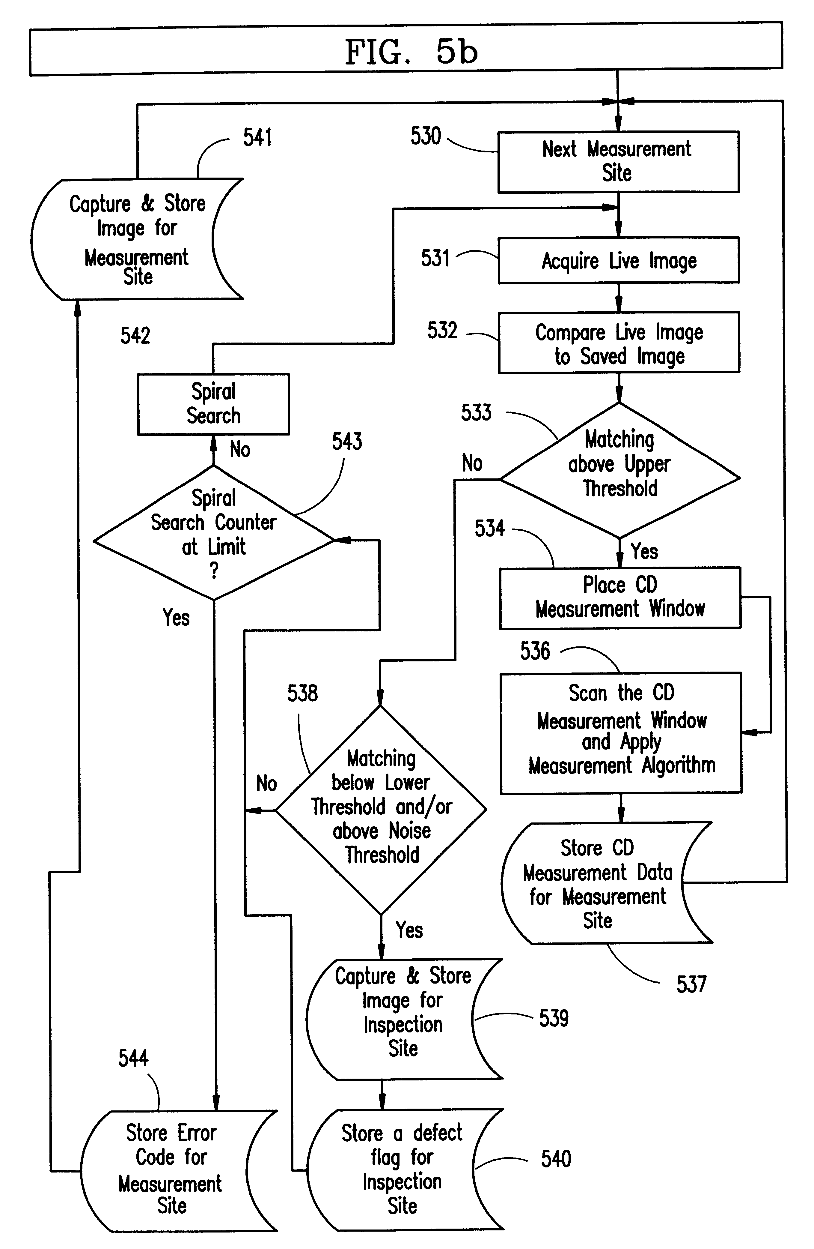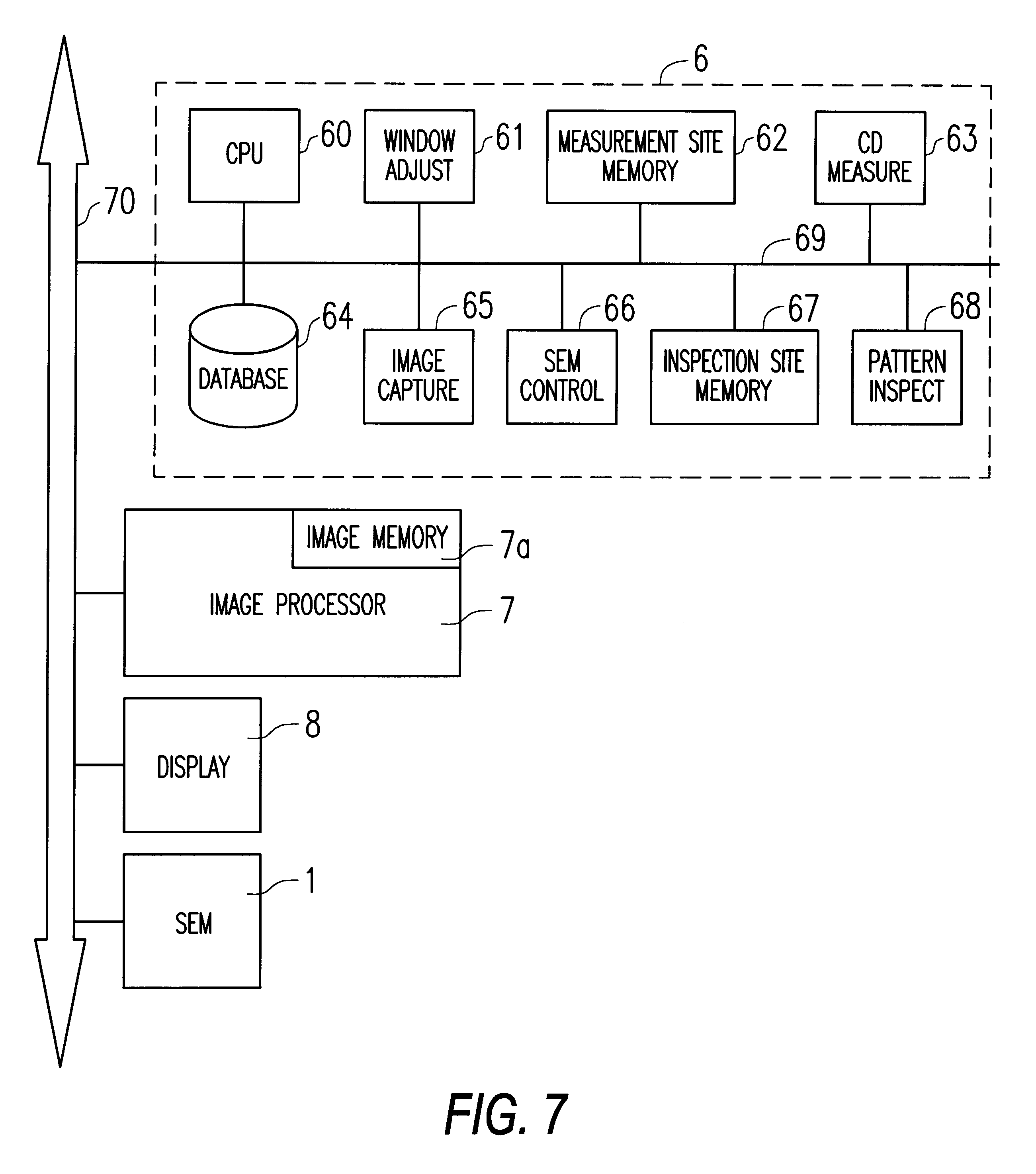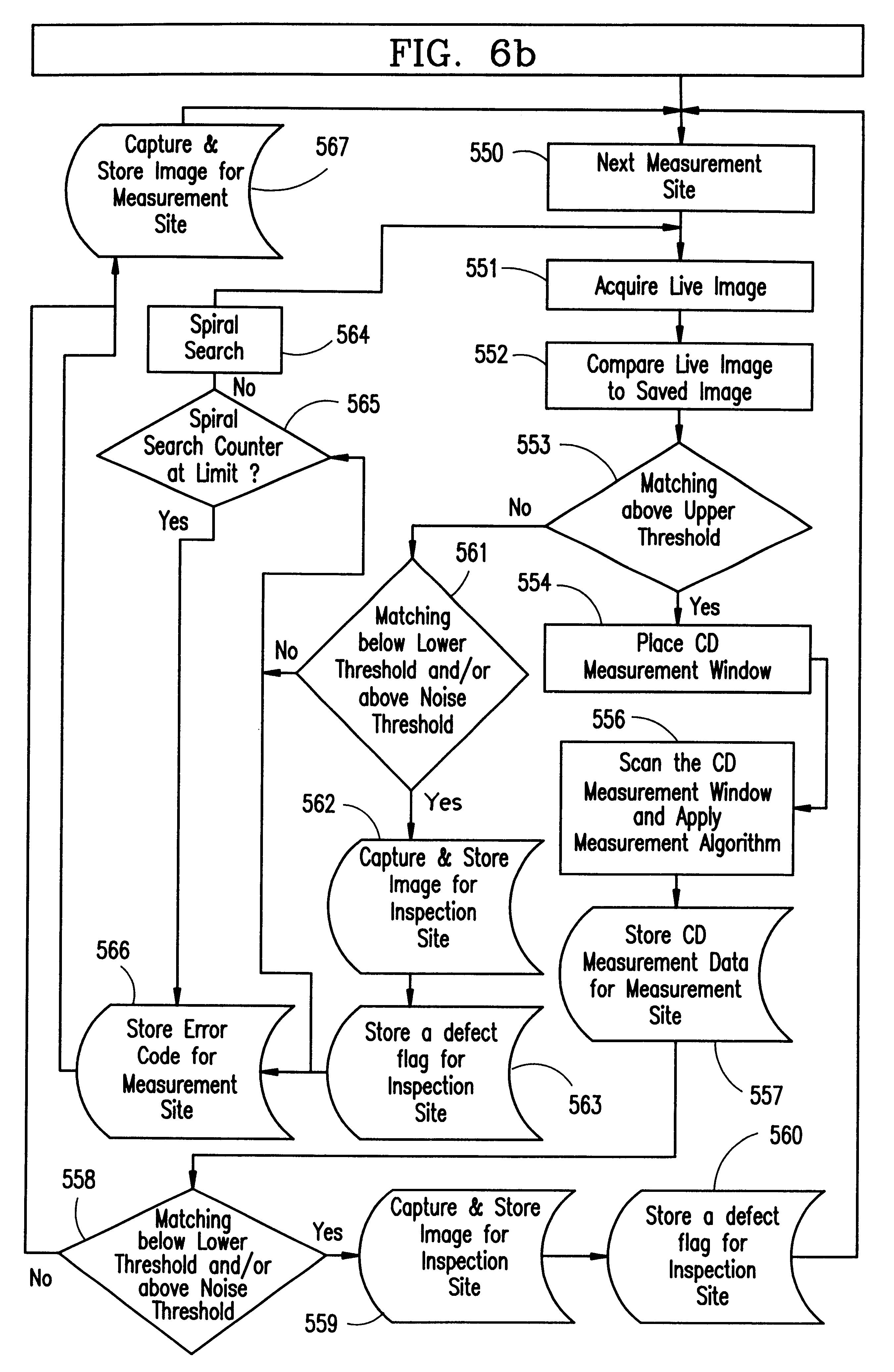 1. Field of the Invention The invention is directed to the field of fabricating and manufacturing electronic devices. More specifically, the invention is directed to a measurement and detection method and apparatus for detecting defects in the manufacture of an electronic device such as a semiconductor integrated circuit or a wafer composed of a plurality of integrated circuits. 2. Description of Related Art In the semiconductor industry, there is a continuing movement towards higher integration, density and production yield, all without sacrificing throughput or processing speed. The making of today's integrated circuits (ICs) requires a complex series of fabrication, inspection and testing steps interweaved throughout the entire process to ensure the proper balance between throughput, processing speed and yield. The inspections and tests are designed to detect unwanted variations in the wafers produced, as well as in the equipment and masks used in the fabrication processes. One small defect in either the devices produced or the process itself can render a finished device inoperable. Many of the inspection steps once done manually by skilled operators have been automated. Automated systems increase the process efficiency and reliability as the machines performing the inspection are more consistent than human operators who vary in ability and experience and are subject to fatigue when performing repetitive tasks. The automated systems also provide greater amounts of data regarding the production and equipment, which enables process engineers to both better analyze and control the process. One such automated inspection step is known as “pattern inspection.” Many different “patterns” appear on both the wafer and the masks used to produce the ICs. Patterns may be repeated areas on a single IC such as test areas, memory areas, shift registers, adders, etc., or, as shown in Typical pattern inspection systems are image based, as described, for example, in U.S. Pat. Nos. 4,794,646; 5,057,689; 5,641,960; and 5,659,172. In U.S. Pat. No. 4,794,646, for example, the wafer, or part thereof, is scanned and a highly resolved picture or image of the pertinent “pattern” is obtained. This pattern image is compared to other pattern images retrieved from the same or other wafers, or is compared to an ideal image stored in the inspection system database. Differences highlighted in this comparison identify possible defects in the IC or wafer. Another inspection step that is typically automated in processes today is known as “critical dimension (CD) measurement.” On each integration level there is a region or set of patterns or features whose dimensions are critical to the functioning of the entire circuit. A representative pattern is chosen for CD measurements. Examples of CD features include transistor channel length (gate length), transistor channel width, trench depth, step slope, spacing, contact dimensions, etc. Like pattern inspection, CD measurement can be done during several different stages in the fabrication process (e.g., masking, developing, final inspection, etc.). With the increase in integration, the dimensions to be measured as CDs are so minute that scanning electron microscopes (SEMs) have replaced other optical systems as the tool for performing CD measurements. See, e.g., U.S. Pat. No. 5,109,430. Indeed, SEMs made exclusively for CD measurements are commonplace. The ability of a viewing system to distinguish detail is related to the wavelength of the light (radiation) used. The shorter the wavelength, the smaller the detail that can be seen. With feature sizes breaking the sub-micron barrier, it is imperative that variations in the lower sub-micron range be detected. One error, even of this small magnitude, may be enough to render the entire IC or wafer useless. Only the SEM provides the capability to detect these variations. For automated CD-SEMs, fiducial markers on wafers are typically included for the purpose of locating certain features or structures—usually test targets. U.S. Pat. No. 5,109,430, for example, discloses use of fine scale marks fabricated in a pattern in a two-dimensional array to form a target occupying a region of the IC where circuitry is not to be formed, e.g., between bonding pads or in a region interior to the bonding pads. Different patterns on different layers can be used to detect misalignment between layers, as well as measure critical dimensions of the patterns. These “test targets” are specially designed structures included on the wafer for test purposes only. If the test targets are the correct size and shape, it follows that other semiconductor devices in their proximity will also have the correct size and shape and will therefore function properly. During its scanning of the wafer surface, the CD-SEM compares stored image data of the fiducial wafer markers with the scanned images received from the current position of the wafer under the CD-SEM. Once a “best match” is made, the CD-SEM is in correct position to perform the CD measurement on the intended “test target” for that particular location of the wafer (or IC). With each new level of integration achieved, a number of new fabrication steps are introduced. This increase is inherently followed by a similar increase in the inspection and testing steps needed to ensure quality control of the products. The increased complexity of the process, however, typically leads to a reduction in throughput or processing speed. The invention provides a unique apparatus for and method of detecting defects in an electronic device. In one preferred embodiment, the electronic device is a semiconductor integrated circuit (IC), particularly one of a plurality of IC dies fabricated on a wafer of silicon or other semiconductor material. The defect detection operation is effectuated by a unique combination of critical dimension measurement and pattern inspection techniques. During the initial sca