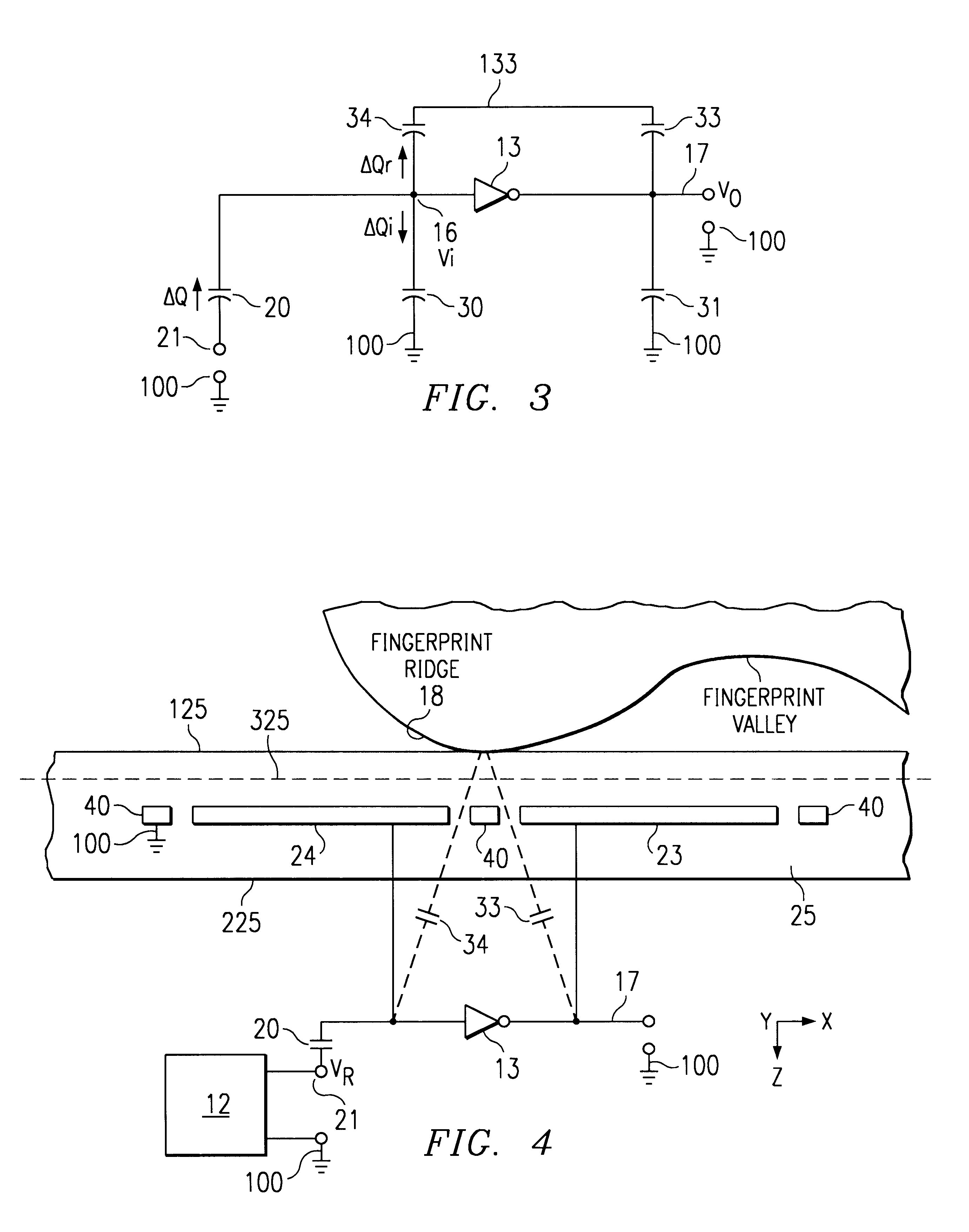 1. A method of providing electrostatic discharge for a capacitive fingerprint pattern detecting array, comprising: providing a fingerprint pattern detecting array having a number of individual skin-distance sensing cells that are arranged in a closely spaced physical configuration; providing a dielectric layer for said array, said dielectric layer having an upper surface and a lower surface; placing a fingertip having said fingerprint pattern on said upper surface; providing each sensing cell with an amplifier having an ungrounded input node and an ungrounded output node; providing ungrounded output node-to-input-node feedback for each of said amplifiers, said feedback being sensitive to said fingerprint pattern; providing said feedback for each of said amplifiers by way of a first capacitor plate that is placed within said dielectric layer vertically under said upper surface and above the lower surface of said dielectric layer and is connected to said ungrounded input node, a second capacitor plate that is placed within said dielectric layer vertically under said upper surface and above the lower surface of said dielectric layer in close horizontal spatial relation to said first capacitor plate and is connected to said ungrounded output node, and said fingertip in vertical spatial relation with said first and second capacitor plates; providing a conductive path within said dielectric layer vertically under said upper surface and above the lower surface of said dielectric layer, said conductive path being peripherally contiguous with each of said first and second capacitor plates to spatially surround but not physically engage said first and second capacitor plates; and connecting said conductive path to ground, to thereby protect said input and output nodes from electrostatic potential that may be carried by said fingertip by providing an electrostatic discharge path for said electrostatic potential. 2. The method of placing said first and second capacitor plates and said conductive path on a common horizontal physical plane. 3. The method of providing said amplifier for each sensing cell as signal-inverting amplifier; and providing said ungrounded output-node-to-input-node feedback for each of said amplifiers as negative-signal feedback. 4. The method of placing said first and second capacitor plates and said conductive path on a common physical plane. 5. The method of prior to said step of placing said fingertip on said upper surface, momentarily shorting said input and output nodes of each amplifier of each sensing cell. 6. The method of providing said amplifier for each sensing cell as signal-inverting amplifier; and providing said ungrounded output-mode-to-input-node feedback for each of said amplifiers as negative feedback. 7. The method of placing said first and second capacitor plates and said conductive path on a common horizontal plane. 8. The method of burying said first capacitor plate, said second capacitor plate, and said conductive path within said dielectric layer between said upper surface and a lower surface of said dielectric layer at a location that is spaced from said upper surface of said dielectric layer. 9. A distance measuring apparatus for providing an output indicative of a ridge/valley fingerprint pattern of a fingertip, said apparatus comprising: a physical array having a plurality of individual distance-sensing capacitance-cells; each capacitance-cell including a first and a second electrically ungrounded capacitor plate that are electrically isolated from each other and are placed below an ungrounded upper dielectric surface of a dielectric layer that is adapted for physical association with a portion of a fingertip; each capacitance-cell including an amplifier having an electrically ungrounded input-node connected to said first capacitor plate, and having an electrically ungrounded output-node connected to said second capacitor plate; said first and said second of capacitor plates being adapted to form a feedback capacitor having a capacitance affected by the fingertip if resident on said dielectric surface, said feedback capacitor providing amplifier feedback as a function of a distance between a portion of the ridge/valley fingerprint pattern of the fingertip and said dielectric surface; and an electrically conductive path coupled to ground and placed within the dielectric layer below said ungrounded dielectric surface and above a bottom surface of the dielectric layer in a manner to be electrically isolated from, and in a manner to at least partially physically surround, each of said capacitor plates of each of said capacitance-cells. 10. The apparatus of said capacitor plates and said conductive path are placed in a common plane that is generally parallel to said upper dielectric surface. 11. The apparatus of said conductive path is placed at a first plane that is intermediate a second plane that is occupied by said capacitor plates and a third plane that is occupied by said dielectric surface. 12. The apparatus of said conductive path and said capacitor plates are embedded within the dielectric layer whose upper generally planar surface comprises said dielectric surface. 13. The apparatus of said capacitor plates and said conductive path are placed in a common plane that is generally parallel to said dielectric surface. 14. The apparatus of said conductive path is placed in a first plane that is intermediate a second plane that is occupied by said capacitor plates and a third plane that is occupied by said dielectric surface. 15. The apparatus of said amplifier is a signal-inverting amplifier; and said amplifier feedback is negative-signal feedback. 16. The apparatus of said capacitor plates and said conductive path are placed in a common plane that is generally parallel to said dielectric surface. 17. The apparatus of said conductive path is placed in a first plane that is intermediate a second plane that is occupied by said capacitor plates and a t