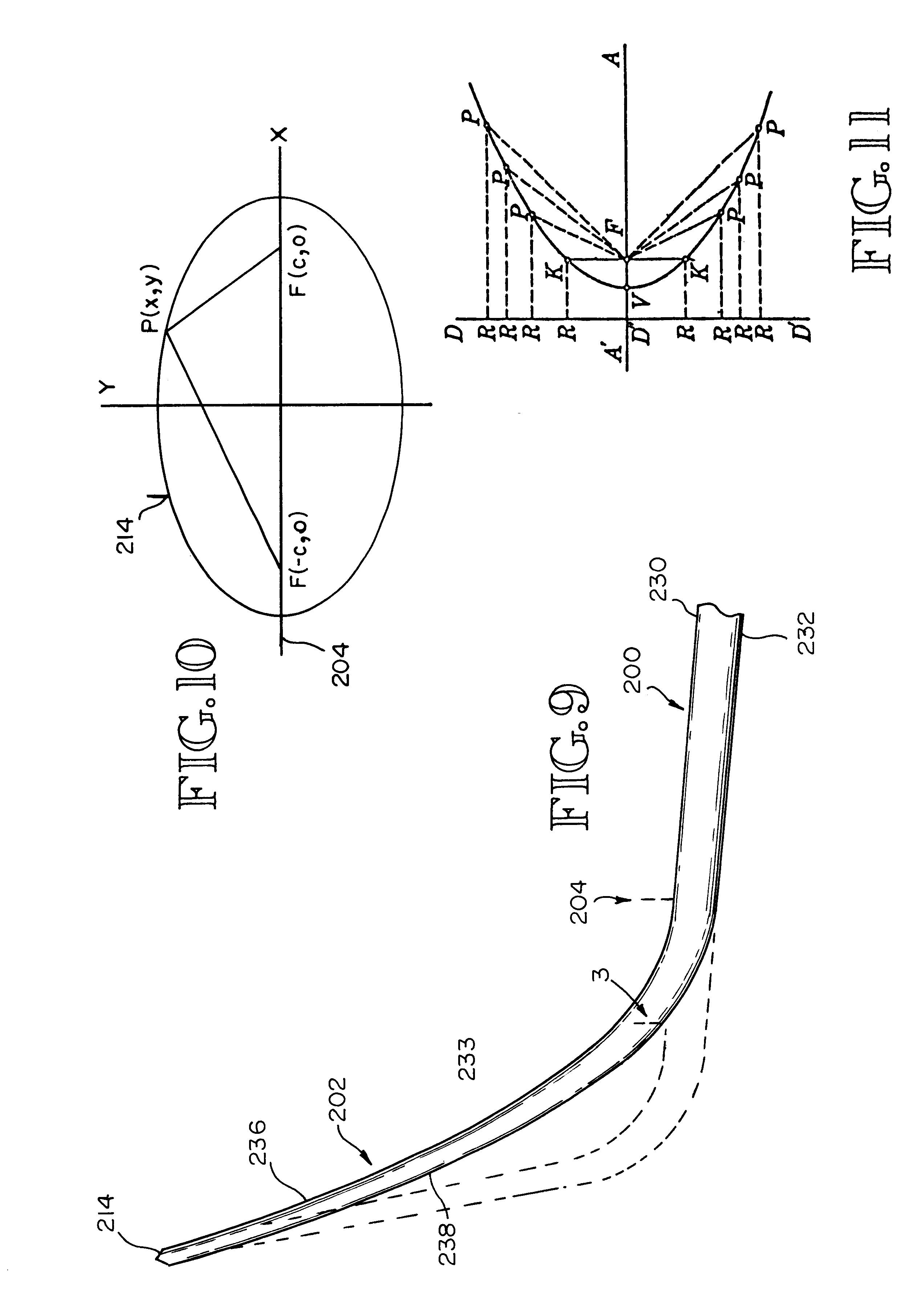 This invention relates to winglets adapted to reduce the induced drag created by an aircraft's wings when they create lift. More particularly, it relates to the provision of a winglet that is continuously curved from where it joins the outer end of the wing out to its outer end or tip and the curvature at least closely approximates the curvature of a conical section, viz. has elliptical, parabolic or hyperbolic curvature. Lifting surfaces (wings) create drag when they create lift. This drag-due-to-lift is called “induced drag.” Aerodynamic theory shows that for essentially planar wings (wings that line essentially in the x-y plane), that the induced drag is minimized if the lift on the wing is distributed elliptically along the span of the wing. That is, the lift per unit span as a function of spanwise position should vary elliptically, with the largest lift per unit span at the wing centerline, and with the lift per unit span gradually dropping in an elliptical manner as the tip is approached. This theoretical result is well known, and many aircraft wings have been constructed with elliptical wing planforms to ensure that the lift does, in fact, vary in an elliptical fashion. The British Spitfire is a classic example of an aircraft wing constructed in an elliptical shape to take advantage of this theoretical result. The purpose and operation of “winglets” is described in “Aerodynamics, Aeronautics and Flight Mechanics”, by Barnes W. McCormick, and published 1979 by John Wiley & Sons, Inc. (pages 215-221). Known winglet constructions in the patent literature are disclosed by U.S. Patents: No. 4,017,041, granted Apr. 12, 1977 to Wilbur C. Nelson; No. 4,190,219, granted Feb. 26, 1980, to James E. Hackett; No. 4,205,810, granted Jun. 3, 1980, to Kichio K. Ishimitsu; No. 4,240,597, granted Dec. 23, 1990, to Roger R. Ellis, W. Martin Gertsen and Norman E. Conley; No. 4,245,804, granted Jan. 20, 1981, to Kichio K. Ishimitsu and Neal R. Van Devender; No. 4,714,215, granted Dec. 22, 1987, to Jeffrey A. Jupp and Peter H. Rees; No. 5,275,358, granted Jan. 4, 1994 to Mark I. Goldhammer and Karela Schippers; No. 5,348,253, granted Sep. 20, 1994 to Lewis B. Gratzer and No. 5,407,153, granted Apr. 18, 1995 to Phillip S. Kirk and Richard Whitcomb. Referring to The second feature is a continuous monotonic variation of cant angle. It is stated that the rate of curvature R must be large enough to accommodate the chord variation in the transition section and allow the practical achievement of optimum aerodynamic loading and minimum interference between wing and winglet. The radius and curvature criteria is given below in terms of a parameter, Krhaving fairly narrow limits: where, h=winglet height measured along a normal to the wing chord plane φ4=cant angle of the planar section ΛH=maximum sweep angle of the leading edge curve 7 KR=curvature parameter (select lower limit if practical) More details respecting the winglet curvature are set forth in U.S. Pat. No. 5,348,253. The present invention includes the discovery that when winglets are attached to the wing tips, the minimum induced drag is obtained when the lift is distributed in a generally elliptical fashion both in the spanwise and vertical directions. The present invention utilizes winglets having a generally elliptical shape in the z-y plane, assuring that the wing loading closely approximates the ideal lift distribution. This results in minimum induced drag and reduced fuel consumption. The present invention also includes the discovery that the winglets will provide reduced induced drag when the winglets have a generally parabolic shape or a generally hyperbolic shape in the y-z plane. The present invention includes providing the wings of an aircraft with winglets of a unique curvature. Each wing has an inner end, an outer end, an upper surface, a lower surface, a leading edge and a trailing edge. Each winglet has an inner end, an outer end, an upper surface, a lower surface, a leading edge and a trailing edge. The inner end of each winglet is connected to the outer end of its wing. The upper and lower surfaces of the winglets and the leading and trailing edges of the winglets are continuations of the upper and lower surfaces of the wing and the leading and trailing edges of the wing. Each winglet follows a generally elliptical curve as it extends from its inner end out to its outer end. The generally and said elliptical curve has a major axis that extends substantially perpendicular to the wing reference plane and substantially intersects the location where the outer end of the wing is joined to the inner end of the winglet. In preferred form, the generally elliptical curve has a minor axis substantially perpendicular to the major axis, and that is spaced above the outer end of the winglet. The minor axis intersects the major axis at a center and a diagonal line extends from the center out to the outer end of the winglet and makes an acute angle of about forty-five to ninety (45°-90°) degrees with the major axis. In preferred form, at its outer end the winglet has a cant angle of substantially about forty-five to about ninety degrees (45°-90°). In preferred form, each wing has a dihedral angle of substantially about zero to fifteen degrees (0°-15°). Other objects, advantages and features of the invention will become apparent from the description of the best mode set forth below, from the drawings, from the claims and from the principles that are embodied in the specific structures that are illustrated and described. Like reference numerals are used to designate like parts throughout the several views of the drawing, and: The aircraft shown by Referring first to A cross sectional view taken at intersection 204 and looking outwardly towards the winglet 202 in elevation would look substantially like FIG. 2. The winglet 202 has a generally trapezoidal shape in side elevation ( The winglet 202 preferably has a curvature in the y-z p