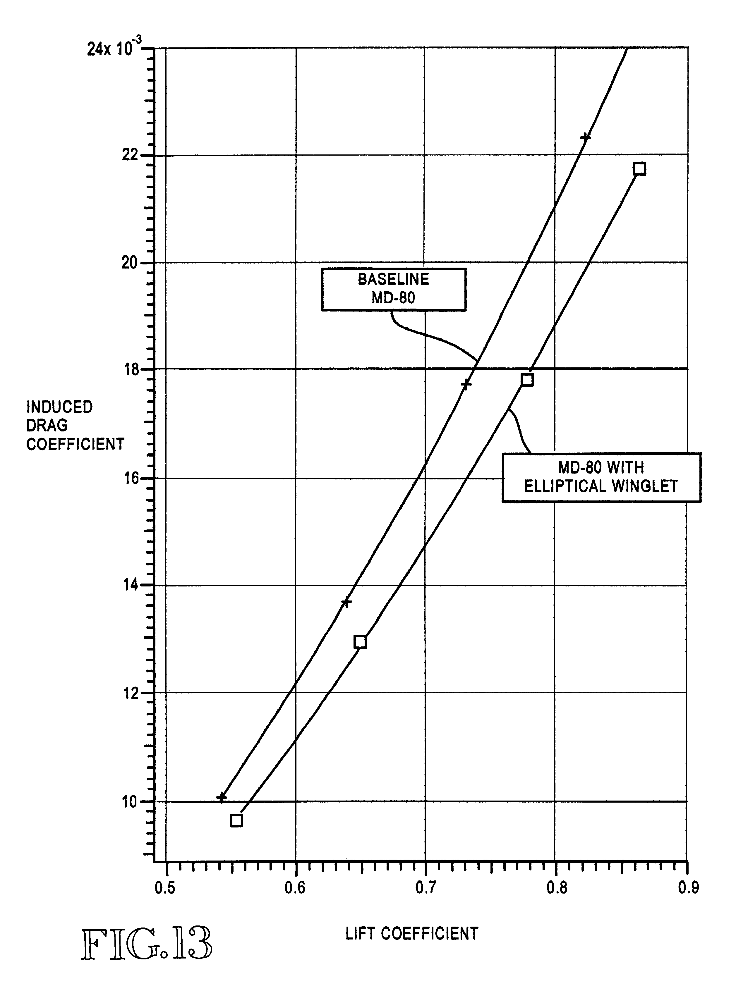 1. An aircraft, comprising: a wing having an inner end, an outer end, an upper surface, a lower surface, a leading edge, and a trailing edge; and a winglet having an inner end, an outer end tip, an upper surface, a lower surface, a leading edge and a trailing edge; wherein the inner end of said winglet is connected to the outer end of said wing; wherein the upper and lower surfaces of the winglet and the leading and trailing edges of the winglet are continuations of the upper and lower surfaces of the wing and leading and trailing edges of the wing; wherein said winglet curves as it extends from its inner end out to its outer end tip and said curve has an increasing radius as it extends from the inner end of the winglet out to the outer end tip of the winglet; and wherein the curve that is followed by the winglet is from the group of curves consisting of a generally elliptical curve, a generally parabolic curve and a generally hyperbolic curve. 2. The aircraft of 3. The aircraft of 4. The aircraft of 5. An aircraft, comprising: a wing having an inner end, an outer end tip, an upper surface, a lower surface, a leading edge, and a trailing edge; and a winglet having an inner end, an outer end, an upper surface, a lower surface, a leading edge and a trailing edge; wherein the inner end of said winglet is connected to the outer end of said wing; wherein the upper and lower surfaces of the winglet and the leading and trailing edges of the winglet are continuations of the upper and lower surfaces of the wing and the leading and trailing edges of the wing; and wherein said winglet follows a generally elliptical curve as it extends from its inner end out to its outer end tip and said elliptical curve has a major axis that extends substantially perpendicular to the wing reference plane and substantially intersects the location where the outer end of the wing is joined to the inner end of the winglet. 6. The aircraft of 7. The aircraft of 8. The aircraft of 9. The aircraft of 10. The aircraft of 11. The aircraft of 12. The aircraft of 13. The aircraft of