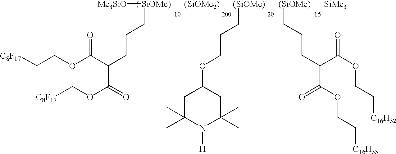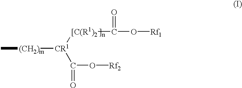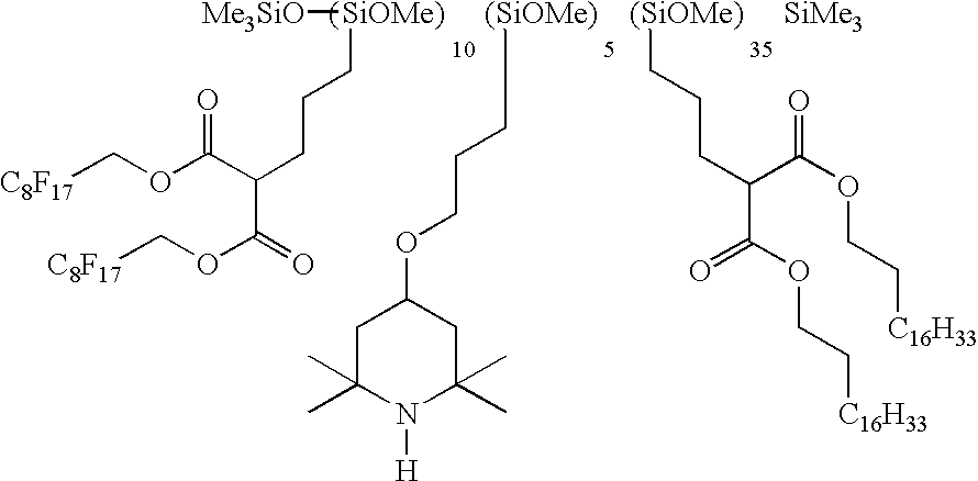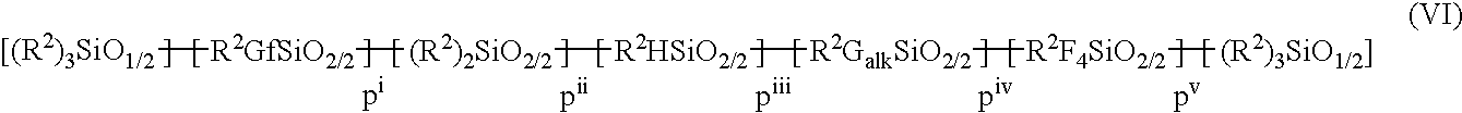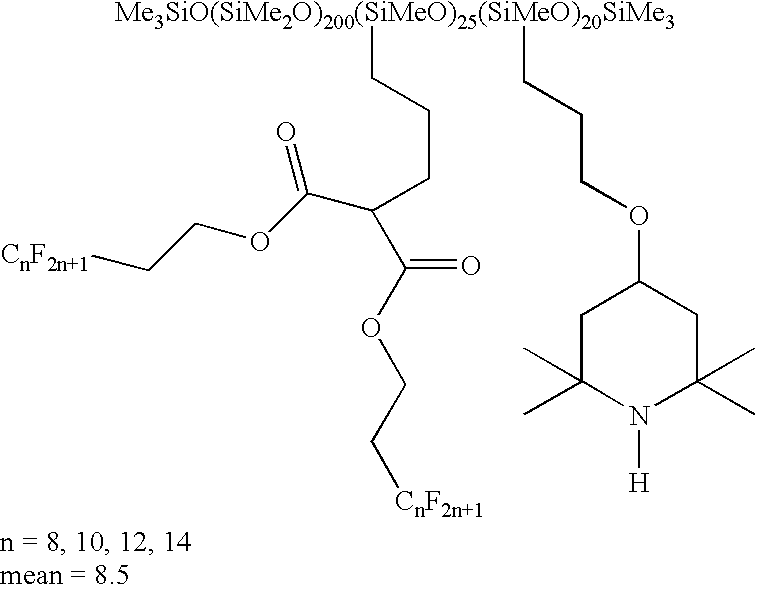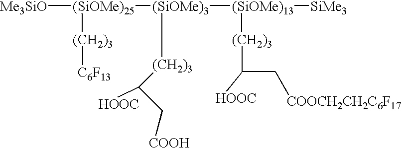 Spray Test OR % 1 wash 5 wash 1 wash 5 wash Exam- fluo- Ini- 1 + 5 + Ini- 1 + 5 + ples rine tial wash iron wash iron tial wash iron wash iron 2 22 80 70 70 50 50 5 5 4 4 4 3 45 70 50 50 0 0 0 0 0 0 0 4 38 70 70 70 50 70 5 5 5 1 3 5 31.9 70 50 50 0 50 3 1 1 0 0 6 19.8 100 50 90 0 70 3 3 2 0 0 7 35.5 70 0 0 0 0 0 0 0 0 0 Key: iron = ironing − wash = washing. Solids Spray Test OR Exam- content % Ini- 5 5 wash + Ini- 5 5 wash + ples % fluorine tial wash iron tial wash iron 2 15 22 80 70 70 5 5 5 3 45 70 50 50 3 0 0 4 38 80 70 70 5 4 5 503* 100 80 100 6 1 5 FC251** 100 70 80 5 1 2 *503 = Foraperle ® 503 from Atochem **FC251 = Scotchguard ® from 3M. 8 Comparative MIBK Methyl isobutyl ketone 0 0 8 MIBK 4 3 9 MIBK 5 7 10 MIBK 6 7 11 MIBK 5 7 12 MIBK 6 7 9 8 10 11 8 Comp. 12 Example No. Constituents 13 14 15 16 POS A = fluorosilicone 19.9 13.6 25.1 13.6 Example No. 9 Methyl isobutyl ketone 14.9 28.9 22.3 10.2 Acetic acid 0.5 0.17 0.51 0.63 Water 64.7 41.8 50.2 41.8 Genapol X050 0.68 Genapol X080 1.25 0.68 13 4 4 14 4 4 15 4 5 16 4 4 Comp. 17 4 4 (Asahi) Comp. 18 5 3 (3M) Surface energy (mN/m) Example No. Before extraction After extraction 9 11.2 14.6 10 11.4 13.9 Comp. 17 8 21 Example No. 21, 22, Emulsion composition 19 20 Comp. Comp. Fluorosilicone No. 8, Comp. 19 Fluorosilicone No. 9 19.7 Methyl isobutyl ketone 14.8 14.8 Acetic acid 0.5 0.12 Water 65.2 64 87.65 Genapol X080 1 1 FC251 (3M) 100 2.13 Quedocur FF (Thor) 8 Magnesium chloride 2 COTTON 5 washing 5 washing operations + Initial operations ironing Example OR spray test OR spray test OR spray test 19 2 50 0 0 0 0 20 5 70 2 50 4 50 21, Comp. 3 90 1 50 0 50 22, Comp. 6 90 0 50 0 50 PET/COTTON 5 washing 5 washing operations + Initial operations ironing Example OR spray test OR spray test OR spray test 19 3 70 0 50 0 50 20 5 70 4 50 5 70 21, Comp. 5 100 1 70 2 80 22, Comp. 6 80 0 70 4 70 POLYAMIDE μFIBERS 5 washing 5 washing operations + Initial operations ironing Example OR spray test OR spray test OR spray test 19 3 50 0 0 0 50 20 5 70 2 50 0 50 21, Comp. 6 100 3 70 6 100 22, Comp. 6 100 0 70 6 80