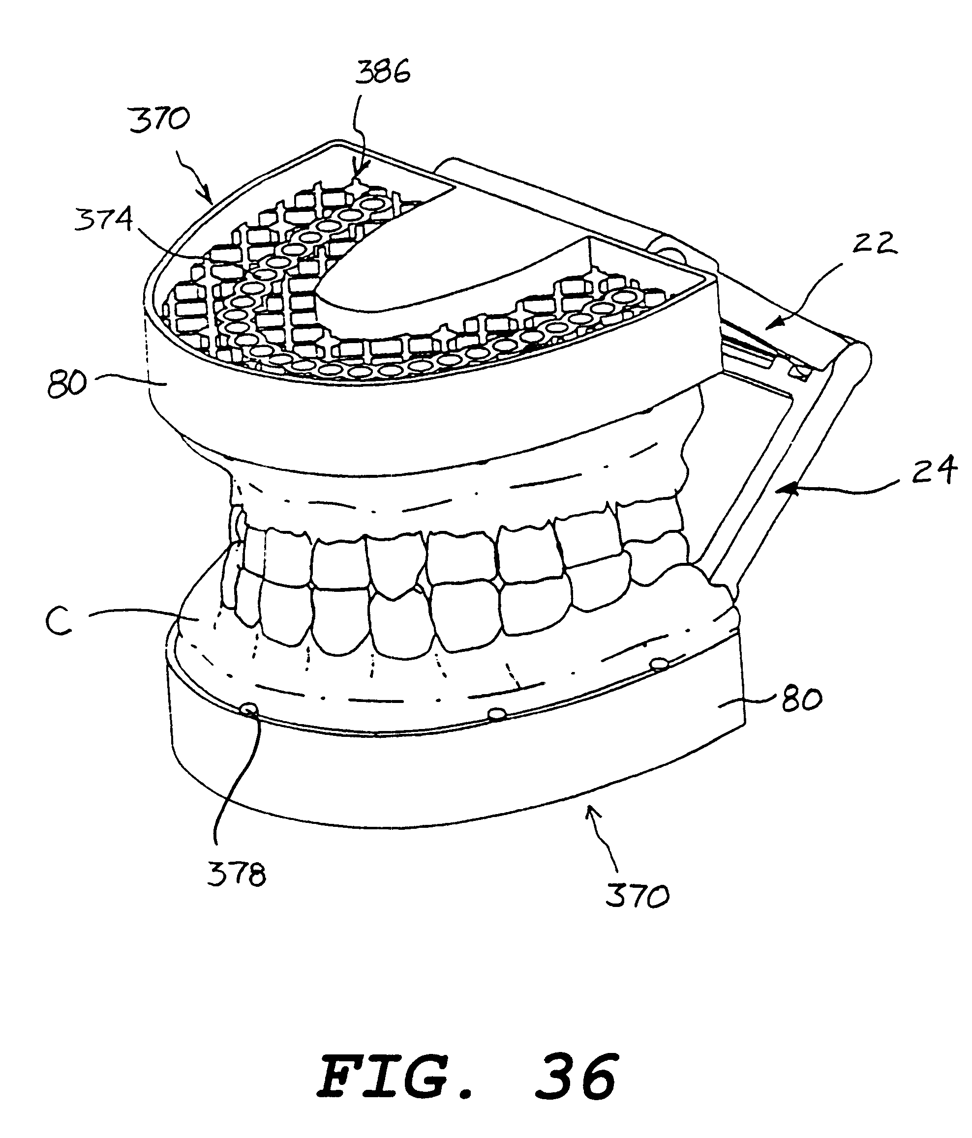 1. A dental modeling system comprising: a support for a dental cast, said support including: a main body having a top surface; and a plurality of registration pins extending upwardly from said top surface, said registration pins each having a pyramidal shape with four sides which taper inwardly extending away from said top surface of said main body; an articulator arm attached to said support; and a joint located between said articulator arm and said support, said joint including: an elongated part-cylindrical concave socket member; and a part-spherical ball received within said socket member. 2. The dental modeling system according to 3. The dental modeling system according to 4. The dental modeling system according to 5. The dental modeling system according to 6. The dental modeling system according to 7. The dental modeling system according to 8. The dental modeling system according to 9. The dental modeling system according to 10. The dental modeling system according to 11. The dental modeling system according to 12. The dental modeling system according to 13. The dental modeling system according to 14. The dental modeling system according to 15. The dental modeling system according to 16. The dental modeling system according to 17. The dental modeling system according to 18. The dental modeling system according to 19. The dental modeling system according to 20. The dental modeling system according to a second articulator arm having a first end and a second end, said first end including a second hinge portion; and a second pair of spaced-apart arm members, said second hinge portion of said second articulator arm being pivotally connected to said first hinge portion of said first articulator arm. 21. The dental modeling system according to 22. The dental modeling system according to 23. The dental modeling system according to 24. The dental modeling system according to 25. The dental modeling system according to 26. The dental modeling system according 27. The dental modeling system according to