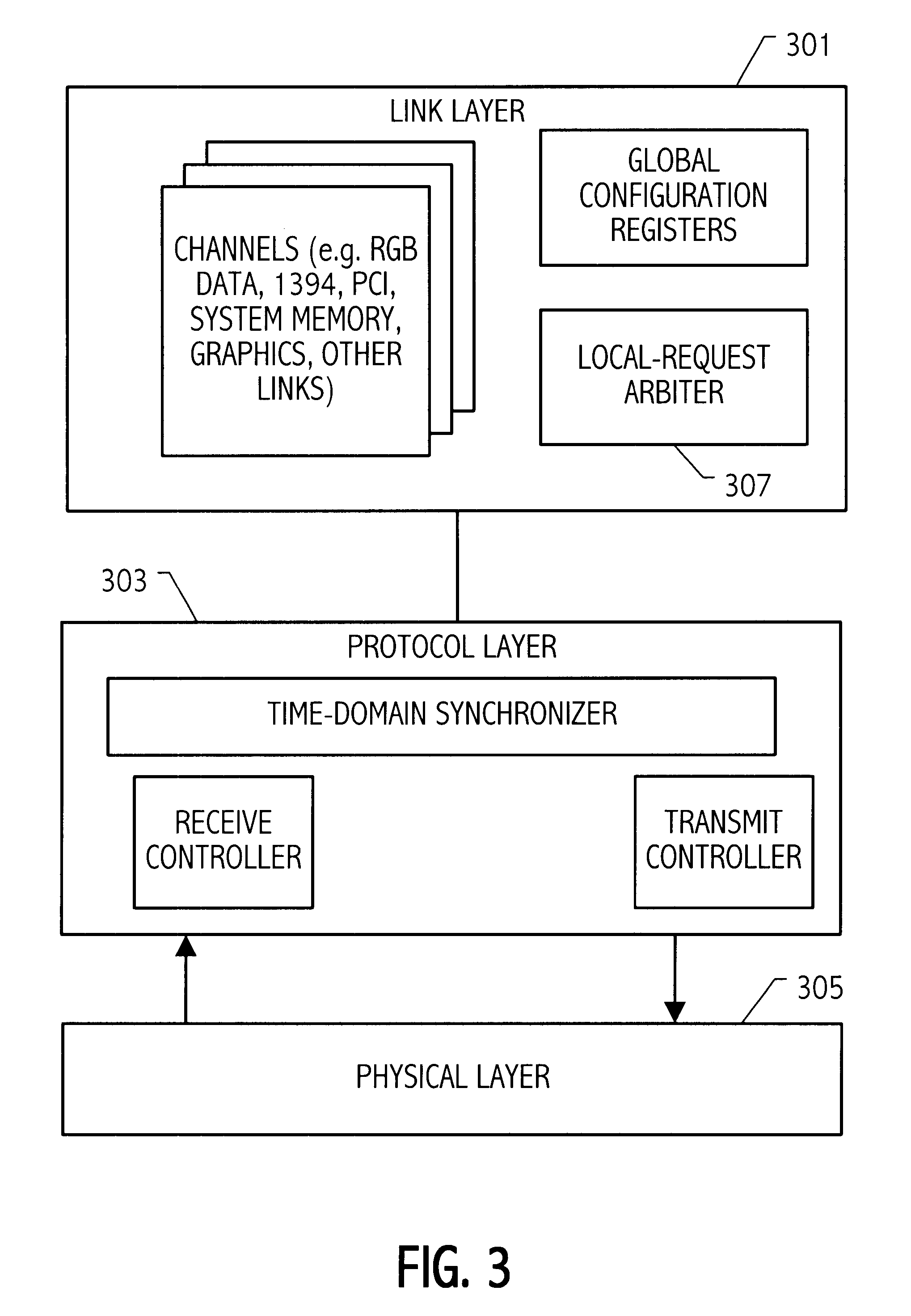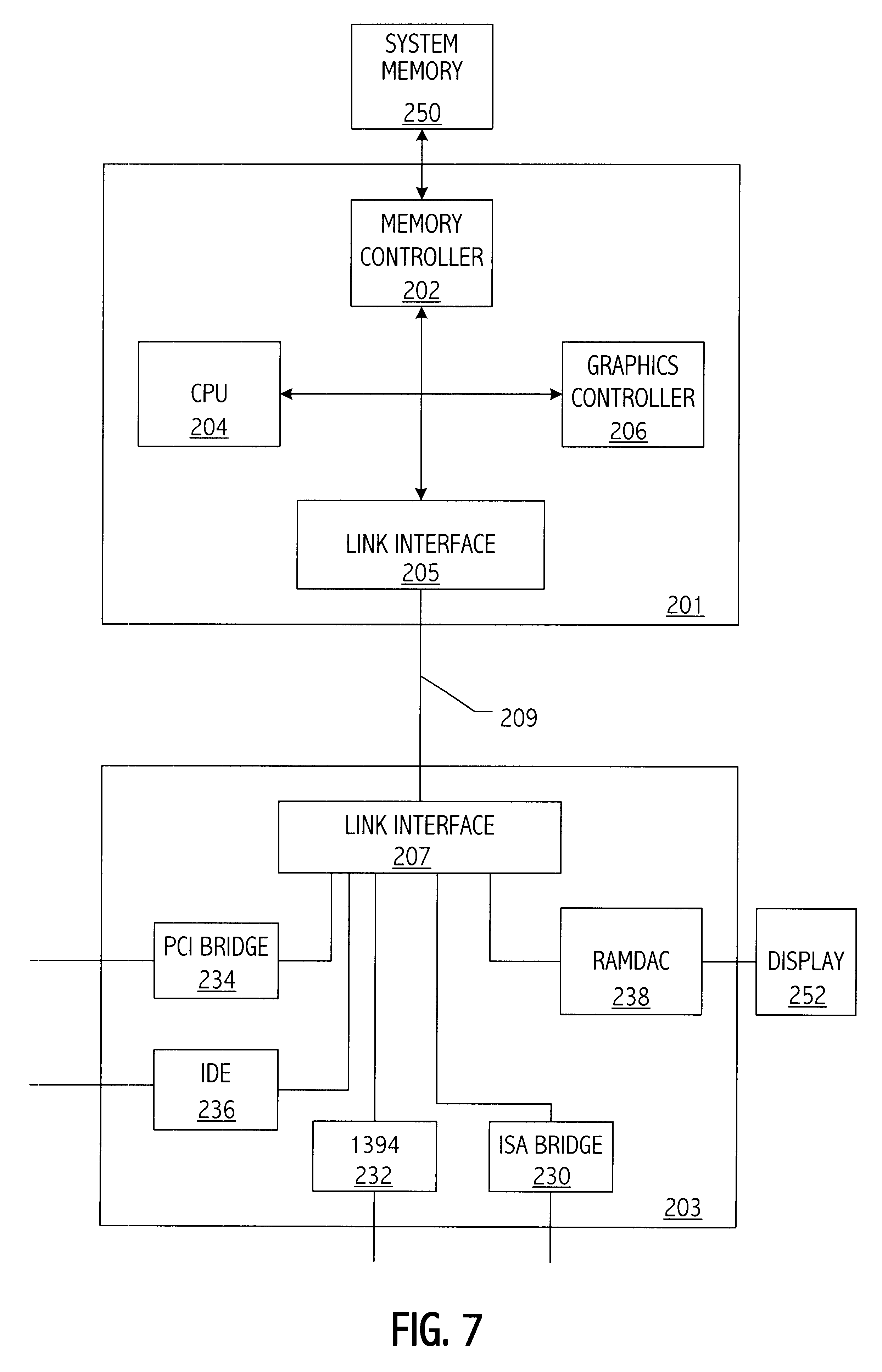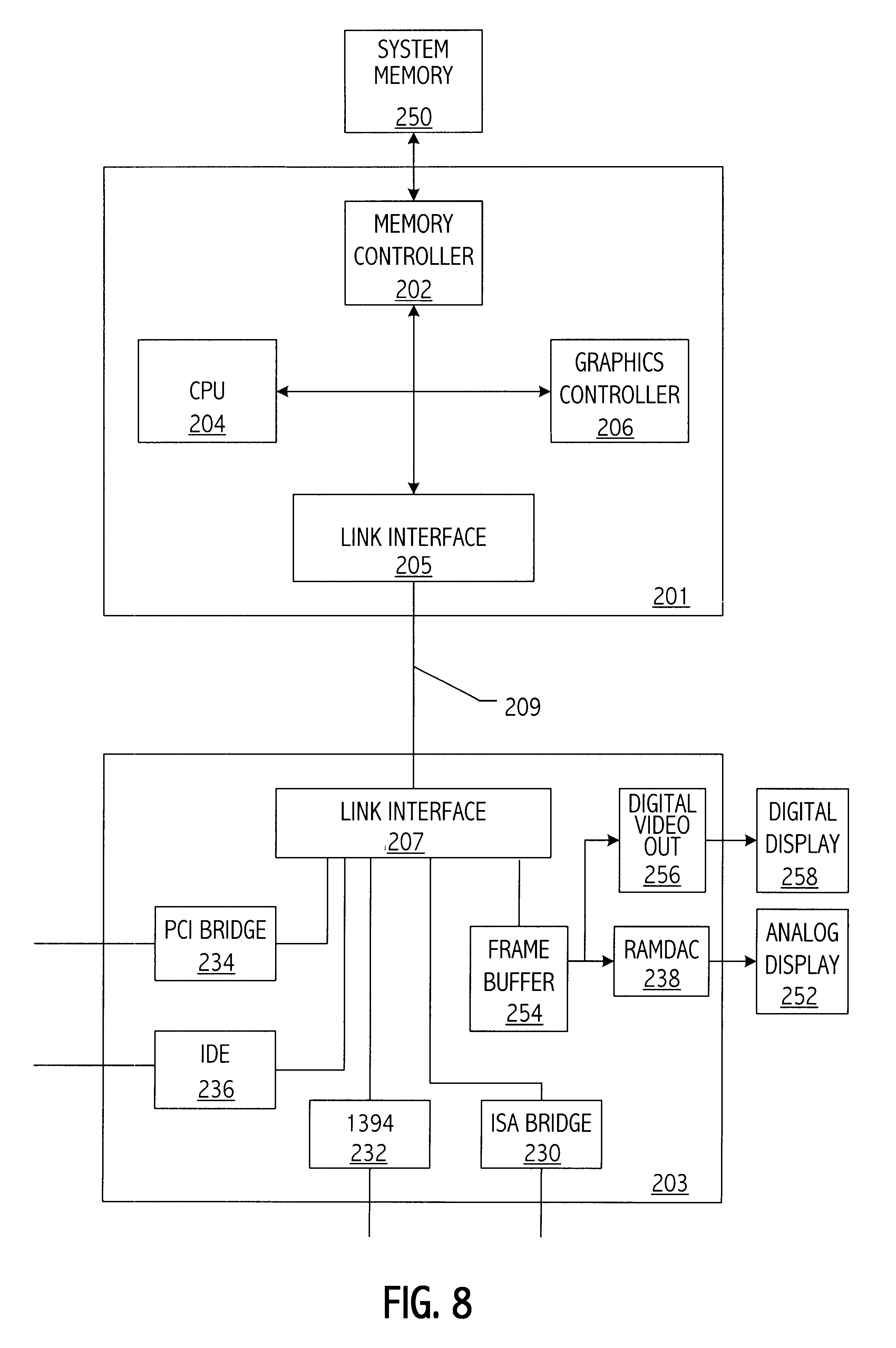 This application is a continuation-in-part of co-pending application Ser. No. 09/098,854, filed Jun. 17, 1998, entitled “Bus Optimized for Personal Computer Data Traffic” naming Larry D. Hewitt and Dale E. Gulick as inventors, which application is incorporated herein by reference. 1. Field of the Invention The invention relates to computer systems and more particularly to the graphics subsystem. 2. Description of the Related Art Traditional personal computer architectures partition the computer system into the various blocks shown in the exemplary prior art system illustrated in FIG. 1. One feature of this prior art architecture is the use of the Peripheral Component Interconnect (PCI) bus 101 as the connection between the “north bridge” integrated circuit 103 and the “south bridge” integrated circuit 105. North bridge 103 functions generally as a switch connecting CPU 107, a graphics bus 109 such as the Accelerated Graphics Port (AGP) bus, PCI bus 101 and main memory 111. North bridge 103 contains the memory controller function. The architecture also includes the “host bus” connection 108 between north bridge 103 and CPU 107. The south bridge 105 provides an interface to various input/output (I/O) portions of the computer system by providing, e.g., a bridge function between the PCI and legacy ISA bus 115, the Integrated Device Electronics (IDE) disk interface 117 and the Universal Serial Bus (USB) 119. Other devices, buses and functions may also be included in the South Bridge 105. In the illustrated prior art architecture, PCI bus 101 also functions as a major input/output bus for add-in functions such as network connection 121. The various busses and devices shown in The exemplary graphics subsystem 123, illustrated in AGP 109 offloads graphics traffic from the PCI bus 101 and allows the graphics controller direct access to main memory 111 for graphics information (e.g. 3-D textures) stored in system memory. The graphics subsystem conventionally includes a graphics processor 124 for performing video calculations and video memory including frame buffer 125. The frame buffer provides a digital representation of the screen image. Video memory also typically includes memory storing data used in video calculations performed by the video processor. The size of video memory varies but typical graphics cards have memory on the order of e.g., 4-16 Mbytes. Another function provided by the graphics subsystem 123 is provided by the random access memory digital to analog converter (RAMDAC). The RAMDAC converts the digital representation of the screen stored in frame buffer 125 into analog data for display device 127. The RAMDAC may be for instance a 230 MHz RAMDAC with three 8 bit DACs providing the red, green and blue (RGB) signals to display 127. One approach for providing lower cost personal computers is to provide an integrated graphics and northbridge function in order to try to reduce the number of system components. One disadvantage of such an approach is that the RAMDAC consumes a lot of power, e.g., on the order of 3W, making the power budget for the north bridge considerably higher than otherwise. Another cost savings approach, which may be used in conjunction with an integrated graphics and memory controller is to use system memory 111 for the video memory rather than providing for separate video memory. Such an approach is known as Unified Memory Architecture (UMA). The UMA approach can provide lower cost systems by eliminating separate video memory at the price of reduced graphics performance. It would be desirable to reduce the cost of personal computers by providing a more highly integrated system without paying the penalty of high power consumption caused by the RAMDAC. Accordingly, in one embodiment a computer system includes a first integrated circuit that has a central processing unit (CPU) and a graphics controller. An input/output integrated circuit, e.g., an I/O hub, which is coupled to a plurality of input/output buses, includes a RAMDAC. An communication link couples the first integrated circuit and the input/output integrated circuit and carries both graphics data to or from a frame buffer and also carries asynchronous system data between the processor and the input/output integrated circuit. The frame buffer may be located in the I/O hub, which further reduces graphics traffic over the communication link. Another embodiment provides a method for communicating frame buffer data to an input/output integrated circuit that includes a RAMDAC, over a communication link connecting the input/output integrated circuit to a first integrated circuit that includes a graphics controller and a CPU. The method includes transferring frame buffer data from the first integrated circuit to the input/output integrated circuit over the communication link. The method further includes transferring input/output data between the CPU and the input/output integrated circuit over the communication link and transferring input/output data between the memory controller and the input/output integrated circuit over the communication link. If the frame buffer is located in the input/output integrated circuit, the frame buffer data is data written into the frame buffer. Otherwise, the frame buffer data is data being read from the frame buffer and provided to the input/output integrated circuit. The present invention may be better understood, and its numerous objects, features, and advantages made apparent to those skilled in the art by referencing the accompanying drawings in which use of the same reference symbols in different drawings indicates similar or identical items. Referring to Each of the data lines 213 and 220 may include 2ndata bits where n>0. Thus, a minimum implementation has one data bit in each direction. However, each unidirectional connection is typically in byte multiples of 8, 16, 32 bits or larger and is fixed in size. Note however, that the link does not have to be sym