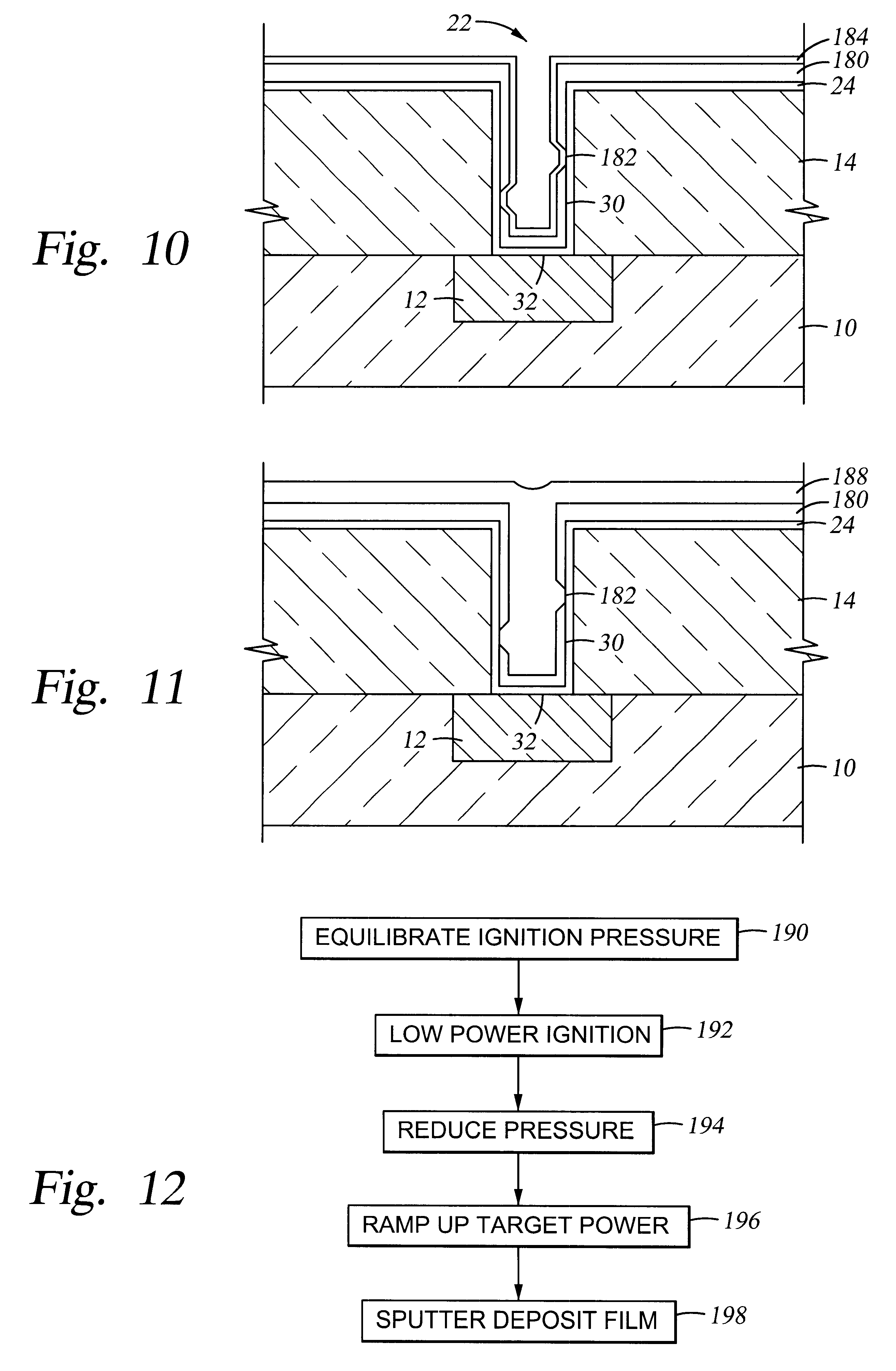 This application is a divisional of Ser. No. 09/414,614, filed Oct. 8, 1999, now U.S. Pat. No. 6,398,929, which is, incorporated herein by reference in its entirety. The invention relates generally to sputtering. In particular, the invention relates to the sputter deposition of copper in the formation of semiconductor integrated circuits. Semiconductor integrated circuits typically include multiple levels of metallization to provide electrical connections between the large number of active semiconductor devices. Advanced integrated circuits, particularly those for microprocessors, may include five or more metallization levels. In the past, aluminum has been the favored metallization, but copper has been developed as a metallization for advanced integrated circuits. A typical metallization level is illustrated in the cross-sectional view of Conventionally, the dielectric is silicon oxide formed by plasma-enhanced chemical vapor deposition (PECVD) using tetraethylorthosilicate (TEOS) as the precursor. However, low-k materials of other compositions and deposition techniques are being considered, and the invention is equally applicable to them. Some of the low-k dielectrics being developed can be characterized as silicates, such as fluorinated silicate glasses. Hereafter, only silicate (oxide) dielectrics will be directly described, but the invention is applicable in large part to other dielectric compositions. A via hole is etched into the upper-level dielectric layer 14 typically using, in the case of silicate dielectrics, a fluorine-based plasma etching process. In advanced integrated circuits, the via holes may have widths as low as 0.18 μm or even less. The thickness of the dielectric layer 14 is usually at least 0.7 μm, and sometimes twice this, so that the aspect ratio of the hole may be 4 or greater. Aspect ratios of 6 and greater are being proposed. Furthermore, in most circumstances, the via hole should have a vertical profile. A liner layer 16 is conformally deposited onto the bottom and sides of the hole and above the dielectric layer 14. The liner 16 performs several functions. It acts as an adhesion layer between the dielectric and the metal since metal films tend to peel from oxides. It acts as a barrier against the inter-diffusion between the oxide-based dielectric and the metal. It may also act as a seed and nucleation layer to promote the uniform adhesion and growth and possibly low-temperature reflow for the deposition of metal filling the hole and to nucleate the even growth of a separate seed layer. A metal layer 18, for example, of copper is then deposited over the liner layer 16 to fill the hole and to cover the top of the dielectric layer 14. Conventional aluminum metallizations are patterned into horizontal interconnects by selective etching of the planar portion of the metal layer 18. However, a preferred technique for copper metallization, called dual damascene, forms the hole in the dielectric layer 14 into two connected portions, the first being narrow vias through the bottom portion of the dielectric and the second being wider trenches in the surface portion which interconnect the vias. After the metal deposition, chemical mechanical polishing (CMP) is performed which removes the relatively soft copper exposed above the dielectric oxide but which stops on the harder oxide. As a result, multiple copper-filled trenches of the upper level, similar to the conductive feature 12 of the next lower level, are isolated from each other. The copper filling the trenches acts as horizontal interconnects between the copper-filled vias. The combination of dual damascene and CMP eliminates the need to etch copper. Several layer structures and etching sequences have been developed for dual damascene, and other metallization structures have similar fabrication requirements. Filling via holes and similar high aspect-ratio structures, such as experienced in dual damascene, has presented a continuing challenge as their aspect ratios continue to increase. Aspect ratios of 4:1 are common, and the value will further increase. An aspect ratio is defined as the ratio of the depth of the hole to the narrowest width of the hole, usually near its top surface. Via widths of 0.18 μm are also common, and the value will further decrease. For advanced copper interconnects formed in oxide dielectrics, the formation of the barrier layer tends to be distinctly separate from the nucleation and seed layer. The diffusion barrier may be formed from a bilayer of Ta/TaN, W/WN, or Ti/TiN, or of other structures. Barrier thicknesses of 10 to 50 nm are typical. For copper interconnects, it has been found necessary to deposit one or more copper layers to fulfil the nucleation and seed functions. The following discussion will address the formation of the copper nucleation and seed layer as well as the final copper hole filling. The deposition of the metallization by conventional physical vapor deposition (PVD), also called sputtering, is relatively fast. A DC magnetron sputtering reactor has a target composed of the metal to be sputter deposited and which is powered by a DC electrical source. The magnetron is scanned about the back of the target and projects its magnetic field into the portion of the reactor adjacent the target to increase the plasma density there to thereby increase the sputtering rate. However, conventional DC sputtering (which will be referred to as PVD in distinction to other types of sputtering to be introduced) predominantly sputters neutral atoms. The typical ion densities in PVD are less than 109cm−3. PVD also sputters atoms into a wide angular distribution, typically having a cosine dependence about the target normal. Such a wide distribution is disadvantageous for filling a deep and narrow via hole 22 illustrated in One approach to ameliorate the overhang problem is long-throw sputtering in a conventional reactor. In long-throw sputtering the target is spaced relatively far fro