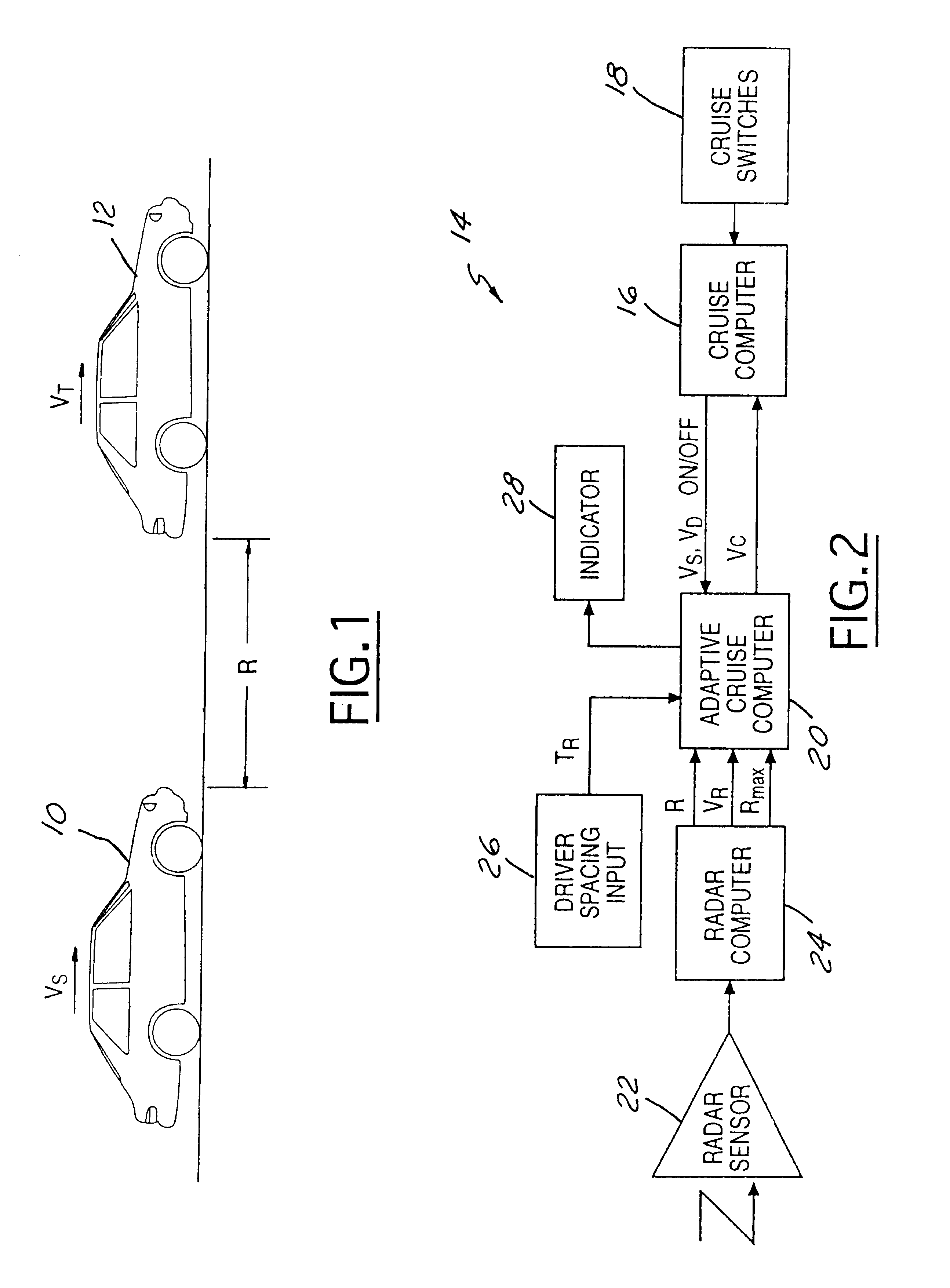 1. An adaptive cruise control system for controlling a distance, R, between a source vehicle and a preceding vehicle, said system comprising: a sensor for sensing said distance, R; a signal representing a predetermined time, T means for determining a maximum headway, Dmax; means for determining a desired headway, D means for comparing D means for controlling said distance, R, to the smaller of said desired headway, D 2. The system as claimed in 3. The system as claimed in 4. The system as claimed in 5. The system as claimed in 6. The system as claimed in 7. The system as claimed in 8. A method for limiting a following distance between a source vehicle and a preceeding vehicle in an adaptive cruise control system, said method comprising the steps of: relaying an actual source vehicle speed, a relative distance, a relative velocity, between the actual source vehicle speed and a preceeding vehicle speed, a desired source vehicle speed, a time related speed multiplier, and a maximum system range to an adaptive cruise computer; determining a predetermined maximum headway; calculating a desired headway by solving a desired distance equation; limiting said time related speed multiplier; setting a headway limited flag when said relative distance approaches said predetermined maximum headway; determining a source vehicle command speed based on said limited time related speed multiplier; limiting the following distance to be less than said predetermined maximum headway; and controlling said desired source vehicle speed to said source vehicle command speed. 9. The method as claimed in 10. The method as claimed in 11. The method as claimed in claim S wherein said step of setting a headway limited flag further comprises the step of activating an indicator. 12. The method as claimed in setting said relative velocity equal to zero; setting said source vehicle speed equal to said preceding vehicle speed; and setting said time related speed multiplier equal to a value pre-set by an operator of said source vehicle. 13. A method of controlling the headway between a preceding vehicle and a source vehicle operating at a controlled speed comprising the steps of: determining a maximum headway between the preceding vehicle and the source vehicle; calculating a desired headway between the preceding vehicle and the source vehicle; comparing the desired headway to the maximum headway; and when the desired headway is greater than the maximum headway, setting the controlled speed to result in a limited headway at which the source vehicle follows the preceding vehicle wherein the limited headway is less than the desired headway. 14. The method as claimed in 15. The method as claimed in 16. The method as claimed in 17. The method as claimed in 18. A method of controlling the headway between a preceding vehicle and a source vehicle operating at a controlled speed comprising the steps of: reading input of a sensor to determine an actual headway spacing between the source vehicle and the preceding vehicle; determining a maximum headway spacing between the source vehicle and the preceding vehicle as a function of a maximum effective range of the sensor; reading driver spacing input from a manually adjustable unit; determining a following headway spacing between the preceding vehicle and the source vehicle as a function of the driver spacing input; comparing the following headway spacing to the maximum headway spacing; and when the following headway spacing is greater than the maximum headway spacing, setting the controlled speed of the source vehicle to effect a limited headway spacing between the preceding vehicle and the source vehicle that is less than the following headway spacing. 19. The method as claimed in 20. The method as claimed in 21. The method as claimed in 22. The method as claimed in 23. The method as claimed in