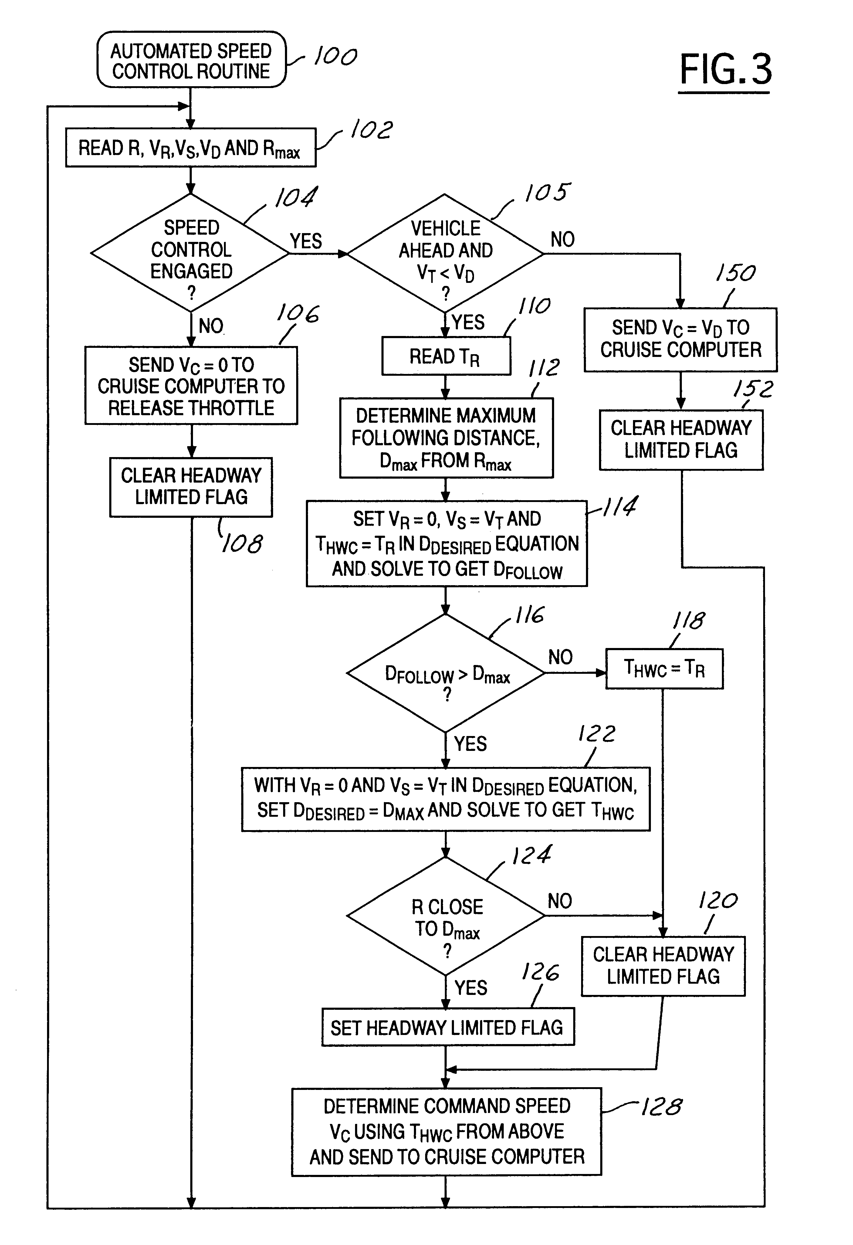 The present invention relates to vehicle speed control, and more particularly to headway limiting in adaptive cruise control for automotive vehicles. Automatic vehicle cruise control systems have been developed for maintaining the speed of a vehicle at a driver-selected speed. In conjunction with these known cruise systems, an adaptive cruise control system has been developed for detecting the presence of, and the distance to, a preceding vehicle and for adjusting the vehicle speed to maintain a following distance from the preceding vehicle when it is moving slower than the driver-selected speed. In essence, the source vehicle speed is controlled to the speed of the preceding vehicle with a speed dependent separation being maintained from the preceding vehicle, wherein the source vehicle speed is limited at a driver-selected speed. Adaptive cruise control systems typically have conventional cruise control that may be overridden in certain circumstances by an adaptive vehicle speed control routine. The conventional cruise control, when activated, may include a control function designed to minimize a difference between the actual vehicle speed and a cruise-set speed, which is selected by the driver. The adaptive cruise control system adapts any active conventional control to the environment external to the controlled source vehicle by attempting to account for vehicles preceding the source vehicle within a speed dependent separation interval of the source vehicle and in the path of the source vehicle. One form of adaptive control lies in the reduction of the cruise-set speed below the driver-selected speed by an amount determined and periodically updated to provide controlled following of sensed preceding vehicles traveling slower than the driver-selected speed. A speed command is generated, based in part, on the speed relationship between the source vehicle and the preceding vehicle. The cruise set speed is limited accordingly, to adapt the source vehicle speed to that of the preceding vehicle and provide a controlled following relationship. Adaptive cruise control systems, such as the system described in U.S. Pat. No. 5,014,200, incorporated herein by reference and assigned to the assignee of the present invention, provides a speed dependent following distance that is adjustable by the driver. This adjustment affects a speed multiplier term used in the determination of the speed dependent following distance. For a fixed speed multiplier, the desired following distance should increase with increasing vehicle speed. The present invention resides in an adaptive cruise control system that provides smooth adaptive cruise control following operation of a source vehicle by limiting the headway to keep it lower than a predetermined maximum. In the present invention, following distance limiting (headway limiting) allows the source vehicle to follow the preceding vehicle at the maximum distance or time interval that is predetermined to provide a smooth “non jerky” following operation. The system informs the driver of the source vehicle that the following distance and thus the amount of time or distance of headway is less than what the driver expected. The present invention accomplishes this objective through systematically limiting the headway. In particular, a time related speed dependent term used in calculating the desired headway is assigned prescribed limits, to maintain a headway that is less than a predetermined maximum headway that maintains the preceding source vehicle spacing within a preferred operational range for the adaptive cruise control system. Limiting the headway accounts for the practical maximum range limitations of forward looking sensors and allows smooth adaptive cruise control following operation of the source vehicle, especially during high speed operation of the source and preceding vehicles without requiring the driver to adjust the speed dependent following distance. This operation is desirable due to the practical maximum range limitations of forward looking sensors used in adaptive cruise control systems, wherein the performance of the adaptive cruise control system can be less than optimal when the desired headway is near or beyond a maximum range for the system's sensor. When no vehicle is detected to be in the path of die source vehicle, the adaptive cruise control system maintains or accelerates the source vehicle to the driver-selected speed. Conventional adaptive cruise control systems provide a speed dependent headway when a preceding vehicle moving slower than the driver-selected speed is encountered in the path of the source vehicle. Therefore, it is possible that the source vehicle will accelerate and decelerate, as the distance to the preceding vehicle moves into and out of the maximum sensor range resulting in a rough, “jerky” adaptive cruise condition. This occurs when the preceding vehicle is traveling slower than the driver-selected speed of the source vehicle but faster than a relatively high speed resulting in headway corresponding to or exceeding the maximum sensor range. For a hypothetical example in a conventional adaptive cruise control system, with a driver-selected speed of 120 kph, a 100 meters maximum range system, and no preceding vehicle ahead, the source vehicle speed would be 120 kph. If the source vehicle approaches a preceding vehicle traveling at 110 kph, the source vehicle would be decelerated by the system when it approached within 100 meters of the preceding vehicle. This occurs to bring the source vehicle down to a speed of 110 kph. The actual distance between vehicles can be lower than the desired headway based on the driver's setting, by the time the source vehicle decelerates to 110 kph. The source vehicle then decelerates slightly to meet the desired headway. When the deceleration causes the distance to exceed the maximum sensor range, no preceding vehicle will be perceived and the source vehicle will accelerate back to