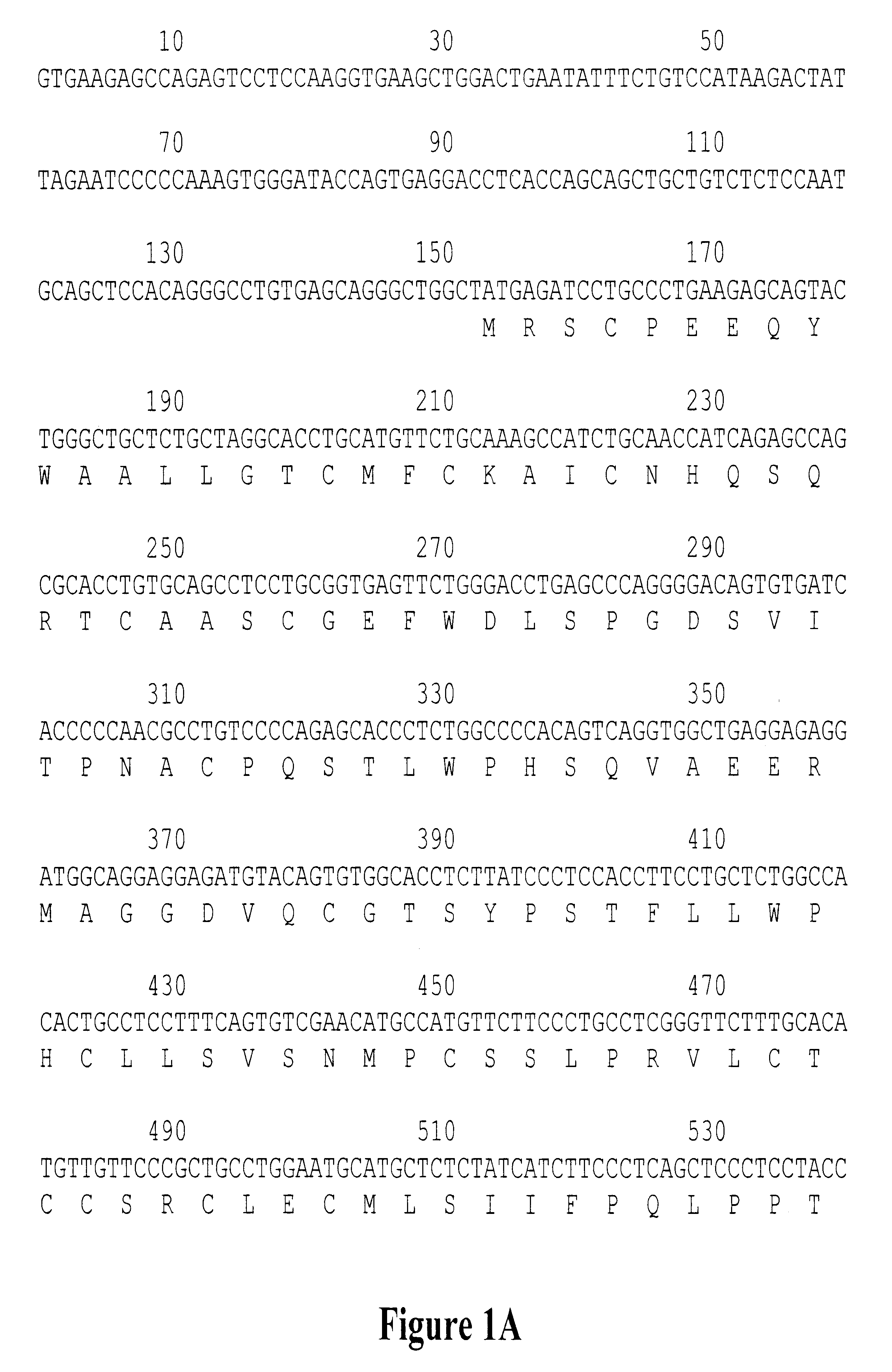 Met 1 . . . . T T . 0.28 −0.14 * * . 1.64 0.52 Arg 2 . . . . T T . 0.67 −0.14 * * . 1.91 0.63 Ser 3 . . . . . T C 1.06 −0.57 * * . 2.28 0.85 Cys 4 . . . . . T C 1.44 −1.00 * * . 2.70 1.50 Pro 5 . A . . . . C 1.59 −1.21 . * F 2.18 1.32 Glu 6 . A . . T . . 1.90 −0.46 * * F 1.81 1.55 Glu 7 . A . . T . . 1.20 0.07 . * F 0.94 3.03 Gln 8 . A . . T . . 0.91 0.00 . . . 0.52 1.98 Tyr 9 . A . . T . . 0.77 0.07 . . . 0.25 1.16 Trp 10 A A . . . . . 0.17 0.76 . . . −0.60 0.55 Ala 11 A A . . . . . −0.18 1.44 . . . −0.60 0.26 Ala 12 A A . . . . . −0.49 1.47 . . . −0.60 0.17 Leu 13 . A . . T . . −1.16 1.20 . . . −0.20 0.23 Leu 14 . A . . T . . −1.51 0.86 . . . −0.20 0.12 Gly 15 . A . . T . . −1.92 0.97 . . . −0.20 0.12 Thr 16 . A . . T . . −2.00 1.26 . . . −0.20 0.12 Cys 17 . A . . T . . −1.37 1.14 . . . −0.20 0.08 Met 18 . A . . T . . −1.14 0.46 * . . −0.20 0.16 Phe 19 . A . . T . . −1.22 0.53 * . . −0.20 0.11 Cys 20 . A . . T . . −1.54 0.73 * . . −0.20 0.15 Lys 21 . A . . T . . −1.23 0.73 * . . −0.20 0.08 Ala 22 . A . . T . . −0.60 0.51 * . . −0.20 0.15 Ile 23 . A . . T . . 0.00 0.23 * . . 0.10 0.38 Cys 24 . A . . T . . 0.40 0.06 * * . 0.38 0.33 Asn 25 . A . . T . . 1.07 0.44 . * . 0.36 0.44 His 26 . . . . T T . 1.13 0.34 . * . 1.49 1.08 Gln 27 . . . . T T . 1.41 −0.34 . . F 2.52 3.95 Ser 28 . . . . T T . 1.63 −0.43 . . F 2.80 3.54 Gln 29 . . . . T T . 1.71 −0.26 . . F 2.52 1.40 Arg 30 . . . . T . . 1.12 −0.26 . . F 1.89 0.81 Thr 31 . . . . T . . 0.86 −0.16 . . F 1.61 0.61 Cys 32 . . . . T . . 0.19 −0.16 . . . 1.18 0.48 Ala 33 . . . . T . . 0.14 0.01 . . . 0.30 0.13 Ala 34 . . . . T T . 0.14 0.44 * * . 0.20 0.09 Ser 35 . . . . T T . −0.67 −0.04 * * . 1.10 0.29 Cys 36 . . . . T T . −0.64 0.17 * . . 0.50 0.25 Gly 37 . . . . T T . 0.02 0.59 . . . 0.20 0.26 Glu 38 . . . . T . . −0.20 0.09 . . . 0.30 0.32 Phe 39 . . . . T . . 0.09 0.39 . . . 0.54 0.49 Trp 40 . . . . T . . 0.18 0.20 . . . 0.78 0.67 Asp 41 . . . . T . . 0.50 0.20 . . . 1.02 0.60 Leu 42 . . . . . . C 0.84 0.63 . . . 0.76 0.68 Ser 43 . . . . . T C 0.54 −0.16 . . F 2.40 1.08 Pro 44 . . . . T T . 0.39 −0.69 . . F 2.51 0.87 Gly 45 . . . . T T . −0.21 −0.04 . * F 1.97 0.78 Asp 46 . . . . T T . −0.52 −0.04 . * F 1.73 0.41 Ser 47 . . . B T . . 0.08 0.06 . * F 0.49 0.38 Val 48 . . B B . . . 0.38 0.06 . * . −0.30 0.60 Ile 49 . . B B . . . 0.00 0.03 . * . −0.30 0.57 Thr 50 . . B . . T . −0.32 0.53 . * . −0.20 0.43 Pro 51 . . . . T T . −0.53 0.71 . * . 0.20 0.31 Asn 52 . . . . T T . −0.23 0.50 . * . 0.20 0.69 Ala 53 . . . . T T C 0.32 0.21 . * . 0.50 0.83 Cys 54 . . . . . T C 0.90 0.11 . * F 0.45 0.72 Pro 55 . . . . T T . 0.40 0.17 . * F 0.65 0.64 Gln 56 . . . . T T . 0.32 0.46 . * F 0.35 0.52 Ser 57 . . . . T T . 0.11 0.87 . * F 0.50 1.03 Thr 58 . . . . T . . 0.67 0.73 . . F 0.30 1.03 Leu 59 . . . . . . C 1.03 0.80 . . F −0.05 0.81 Trp 60 . . . . . T C 1.24 0.79 . * . 0.00 0.81 Pro 61 . . . . . T C 0.39 0.80 . * . 0.00 0.97 His 62 . . . . . T C 0.10 0.96 . . . 0.00 0.87 Ser 63 . . . . . T C 0.41 0.77 . . . 0.00 0.84 Gln 64 . A . . . . C 1.22 −0.14 . * . 0.50 0.94 Val 65 . A . . . . C 1.62 −0.57 . * . 0.95 1.20 Ala 66 . A . . . . C 1.23 −1.07 . * . 0.95 1.75 Glu 67 A A . . . . . 0.68 −0.84 . * F 1.06 1.00 Glu 68 A A . . . . . 0.63 −0.74 . * F 1.52 1.36 Arg 69 A A . . . . . 0.29 −0.96 . . . 1.68 1.33 Met 70 . . . . T T . 1.14 −1.03 . * . 2.64 0.76 Ala 71 . . . . T T . 0.88 −1.03 . * F 3.10 0.73 Gly 72 . . . . T T . 0.88 −0.39 . * F 2.49 0.28 Gly 73 . . . . T T . 0.21 0.01 * * F 1.58 0.49 Asp 74 . . . . T . . −0.24 −0.03 * * F 1.67 0.26 Val 75 . . . . . . C 0.04 −0.10 . * F 1.16 0.26 Gln 76 . . B . . . . 0.33 −0.04 . * . 0.50 0.38 Cys 77 . . B . . T . 0.43 −0.09 . * . 0.70 0.30 Gly 78 . . . . T T . 0.57 0.67 . * F 0.35 0.64 Thr 79 . . . . T T . 0.27 0.46 . * F 0.35 0.57 Ser 80 . . . . . T C 0.81 0.44 * * F 0.30 1.42 Tyr 81 . . . . . T C 0.11 0.36 * . F 0.60 2.08 Pro 82 . . . . T T . −0.03 0.71 . . F 0.50 1.25 Ser 83 . . . . T T . −0.50 0.91 . . F 0.35 0.77 Thr 84 . . . . T T . −0.48 1.21 . . F 0.35 0.40 Phe 85 . . . . T . . −0.39 1.37 . . . 0.00 0.27 Leu 86 . . . . T . . −0.18 1.37 . . . 0.00 0.32 Leu 87 . . . . T . . −0.63 1.49 . . . 0.00 0.30 Trp 88 . . . . . T C −1.14 1.57 . . . 0.00 0.18 Pro 89 . . . . . T C −1.64 1.47 . . . 0.00 0.18 His 90 . . . . T T . −1.24 1.47 . . . 0.20 0.18 Cys 91 . . . . T T . −1.29 1.17 . * . 0.20 0.24 Leu 92 . . . B T . . −0.78 0.90 * . . −0.20 0.11 Leu 93 . . . B T . . −0.49 0.86 * . . −0.20 0.11 Scr 94 . . . B T . . −0.88 0.76 * . . −0.20 0.33 Val 95 . . . B T . . −1.06 0.80 * . . −0.20 0.40 Ser 96 . . . . T . . −1.06 0.54 . . . 0.00 0.75 Asn 97 . . . . T . . −0.54 0.43 . . . 0.00 0.30 Met 98 . . . . . T C −0.03 0.43 . . . 0.00 0.54 Pro 99 . . . . T T . −0.54 0.17 . . . 0.50 0.54 Cys 100 . . . . T T . 0.10 0.47 * * . 0.25 0.28 Ser 101 . . . . T T . 0.51 0.50 * * F 0.45 0.44 Ser 102 . . . . T . . −0.34 −0.11 * * F 1.20 0.55 Leu 103 . . . B . . C −0.56 0.10 * * F 0.25 0.76 Pro 104 . . . B T . . −1.01 0.21 * * F 0.50 0.47 Arg 105 . . . B T . . −0.66 0.40 * * . 0.00 0.19 Val 106 . . . B T . . −1.02 0.50 * * . −0.05 0.33 Leu 107 . . . B T . . −1.39 0.39 * . . 0.20 0.11 Cys 108 . . . B T . . −0.88 0.53 * * . −0.15 0.03 Thr 109 . . . B T . . −0.56 0.91 * * . −0.20 0.06 Cys 110 . . . B T . . −1.33 0.27 * * . 0.32 0.13 Cys 111 . . . . T T . −1.29 0.16 * . . 0.94 0.13 Ser 112 . . . . T T . −0.48 0.27 * . . 1.16 0.08 Arg 113 . . . . T T . −0.48 −0.21 * . . 1.98 0.25 Cys 114 . . . . T T . −0.77 −0.21 * . . 2.20 0.25 Leu 115 . A . B T . . −0.91 −0.17 * . . 1.58 0.18 Glu 116 . A . B T . . −0.54 0.13 * * . 0.76 0.08 Cys 117 . A . B T . . −1.13 0.51 * . . 0.24 0.19 Met 118 . A . B T . . −2.13 0.63 * * . 0.02 0.16 Leu 119 . A . B T . . −2.17 0.63 * * . −0.20 0.07 Ser 120 . . B B . . . −1.57 1.41 * * . −0.60