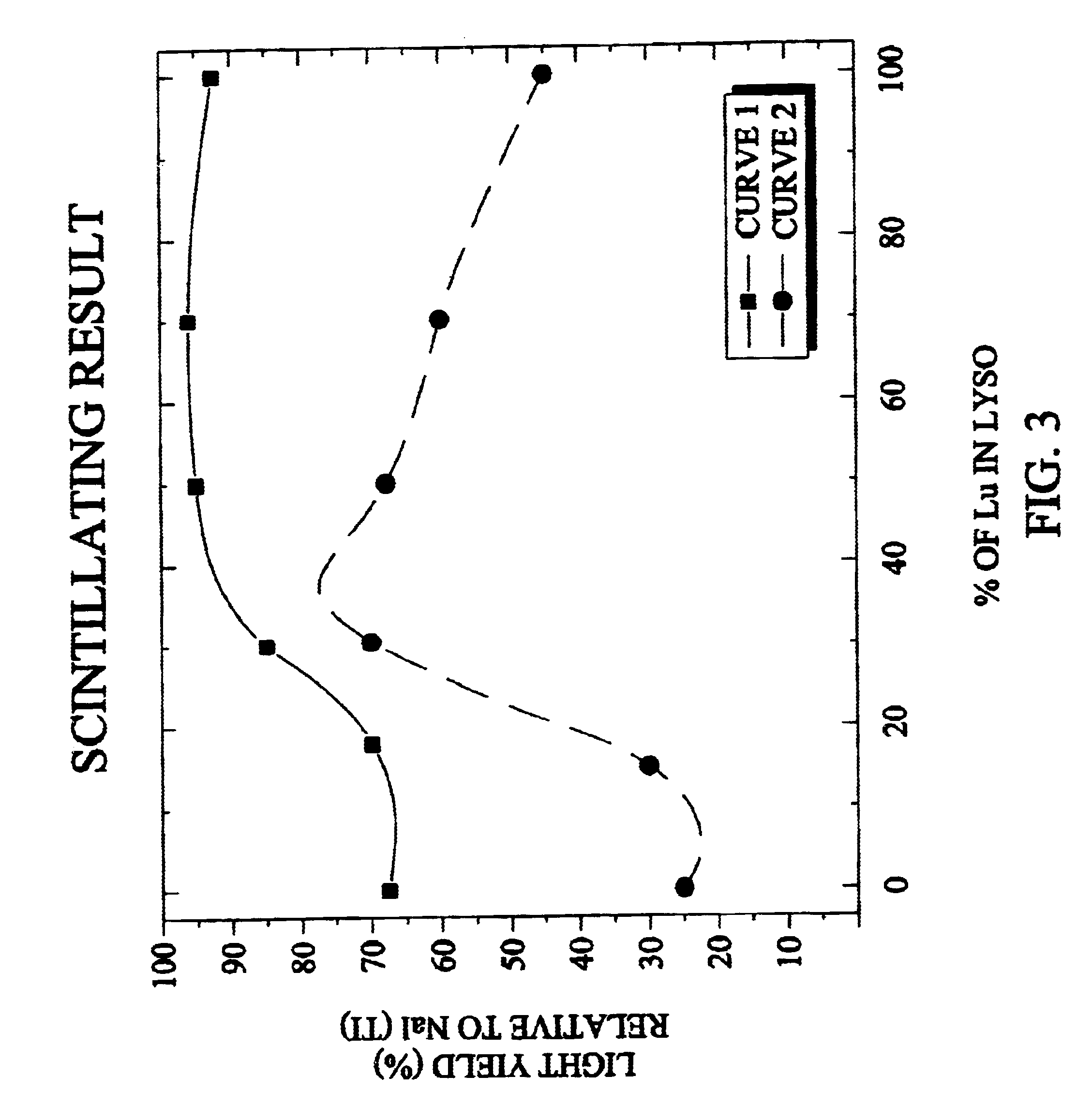 This application claims priority based on U.S. Provisional Application Serial No. 60/120,500 filed Feb. 18, 1999. This invention relates to a single crystal as scintillating detector for gamma ray or similar high energy radiation which single crystal is composed of Cerium doped Lutetium Yttrium orthosilicate (LYSO) with the general composition of Ce2x(Lu1−yYy)2(1−x)SiO5where x=0.00001 to 0.05 and y=0.0001 to 0.9999. There are a number of ways to detect high energy radiation. Some of the equipment can be quite bulky, such as a cloud chamber, others may not be as sensitive or quantitative. Scintillator is a very simple but also very accurate method to detect high energy radiation such as x-rays, gamma-rays, high energy particles exceeding a few kilo-electron-volts (KeV) in energy. When high energy radiation strikes on a scintillating crystal, it creates a large number of electron-hole pairs inside the crystal. Recombination of these electron-hole pairs will release energy in the range of a few eV. This energy can be emitted directly from the recombination center as light or transferred to a light emitting ion center which then emits a specific wavelength of light. This low energy emission can then be detected by a photomultiplier tube, avalanche photo diode (APD) or other detector systems with sufficient sensitivity. The higher the light emission (or light yield), the easier for the detector design. A The first scintillating crystal is calcium tungstate (CaWo4) which was used before the turn of this century to detect x-rays. The most significant discovery of a scintillating crystal is Thallium-activated sodium iodide NaI(Tl)) in the mid-40's. Even now, it is still the most widely used scintillating crystal. This is because large size crystals are readily available and quite inexpensive. Moreover, the light yield is the highest among all the known materials and is still the benchmark standard for all other scintillator crystals even after all these years. Even though NaI(Tl)) is widely used, it is not without problems. It is hygroscopic and very soft. Moreover, the density is too low (37 g/cm3), the effective mass number (Zeef) of 49 is also too small. It has a large and persistent after glow which interferes with the intensity counting system. Finally, the decay time about of 230 nanoseconds (ns) is too slow for many applications. Since the turn of this century, a large number of crystals have been proposed for potential scintillating applications. Even though they do show scintillating properties, none of them has all the right properties. The common problems are low light yield, physical weakness and difficult to produce large size high quality single crystals. Despite the problems, a number of them have found applications in physics, chemistry, geology and medicine. One common feature of all these usable crystals is that they are the only crystals which can be produced in large size and high quality by an industrial manufacturing process with reasonable cost. This common feature has proven to be the most important factor, more so than the details of scintillating properties, to be considered as a viable scintillator material. The specific examples include bismuth germanate ((BGO) which is Bi4Ge3O12), cerium doped gadolinium orthosilicate ((GSO) which is Gd2SiO5) and cerium doped lutetium orthosilicate ((LSO) which Lu2SiO5). BGO was found in the early 70's. It has higher density (7.13 g/cm3), and is non-hygroscopic. But it also has problems such as low light yield (15% that of NaI(Tl)), slow decay time (300 ns) and high refractive indices (n=2.15) which results in light loss due to internal reflection. Still BGO scintillator crystals are now used in high energy calorimetry in particle physics research Institutes. It is also used as the detector for the 511 keV gamma-ray radiation of the positron emission tomographs (PET) in medical imaging application. Because of the low light and slow decay, the image produced from the BGO PET machine tends to be blurred with poor resolution. In early 80's, the Ce doped GSO crystal was disclosed as a scintillator material. It has adequate density (6.71 g/cm3) and is also non-hydrogroscopic. The light yield is 20% of that obtained with NaI(Tl) with a much faster decay time (60 ns). Even though GSO crystals over 80 mm diameter have been produced, the crystal has not yet made in the PET marker because of a strong cleavage plane. It is very difficult to cut and polishing the crystal into any specific shape without the risk of fracturing of the entire crystal. Another unexpected problem is the high thermal neutron capture cross-section (49,000 barns) of the gadolinium. It will interfere with the gamma rays generated by neutron irradiation source. However, since there is no neutron involved in the PET process, gadolinium containing GSO is not a problem. In the late 80's, the Ce doped LSO crystal was disclosed as a good scintillator material. Similar to GSO, it has high density (7.4 g/cm3) and is non-hygroscopic. The light yield is significantly better and close to 75% that of NaI(Tl)) and the decay time is even faster (42 ns). The index of refraction is also very low (n=1.82). Moreover, since LSO has a totally different crystal structure from GSO, it is fortuitous that in LSO structure, there is not any distinct cleavage plane making the material more suitable for detector block fabrication without the serious risk of fracturing. The thermal neutron capture cross-section is very low (84 barns) as compared to GSO. Lastly, it is now possible to commercially produce high quality, large size single crystals of LSO. Compared with all the other existing known scintillator crystals, Ce doped LSO seems to have the best combination of all the needed properties for PET or other high energy gamma-ray detector application. Unfortunately, the lutetium element of the crystal contains a trace amount of a natural long decay radioactive isotope, Lu176, which will provide 