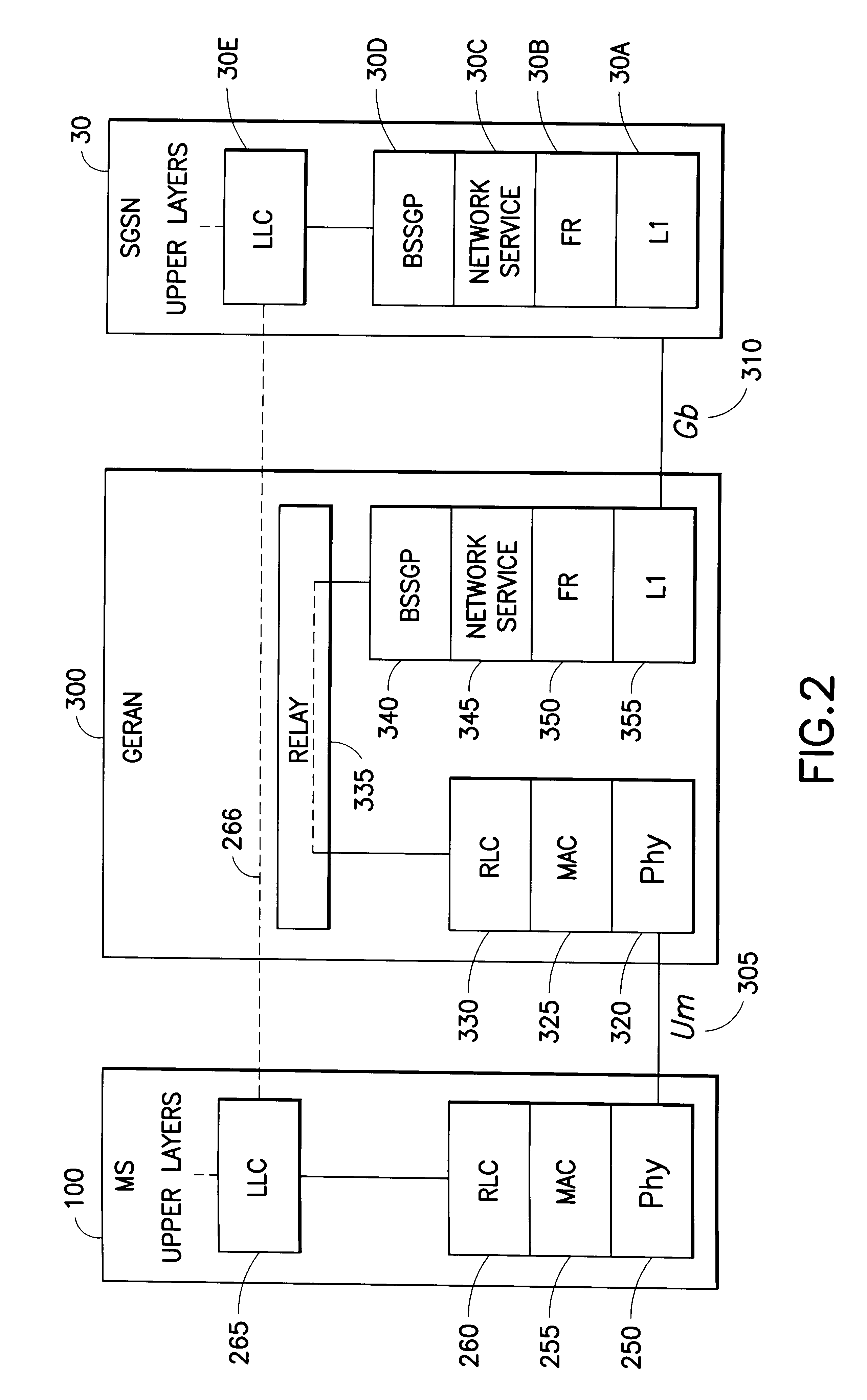 In operation, the MS 100 sends data to the network 10 using the Logical Link Control (LLC) protocol 265. While shown as the dashed (logical) connection 266 in FIG. 2, in actuality the MS 100 originated LLC packets are input to the RLC 260, segmented into an appropriate number of RLC/MAC PDUs and sent over the radio channel as uplink (UL) packets via the PHY 250. On the network side the RLC/MAC PDUs are concatenated into LLC PDUs that are relayed to the SGSN 30 using the BSSGP protocol 340 (via the Gb interface 310 between L1355 and L130A), and are then provided to the LLC layer 30E. Downlink (DL) packet data going to the MS 100 takes the opposite route as the UL packets.