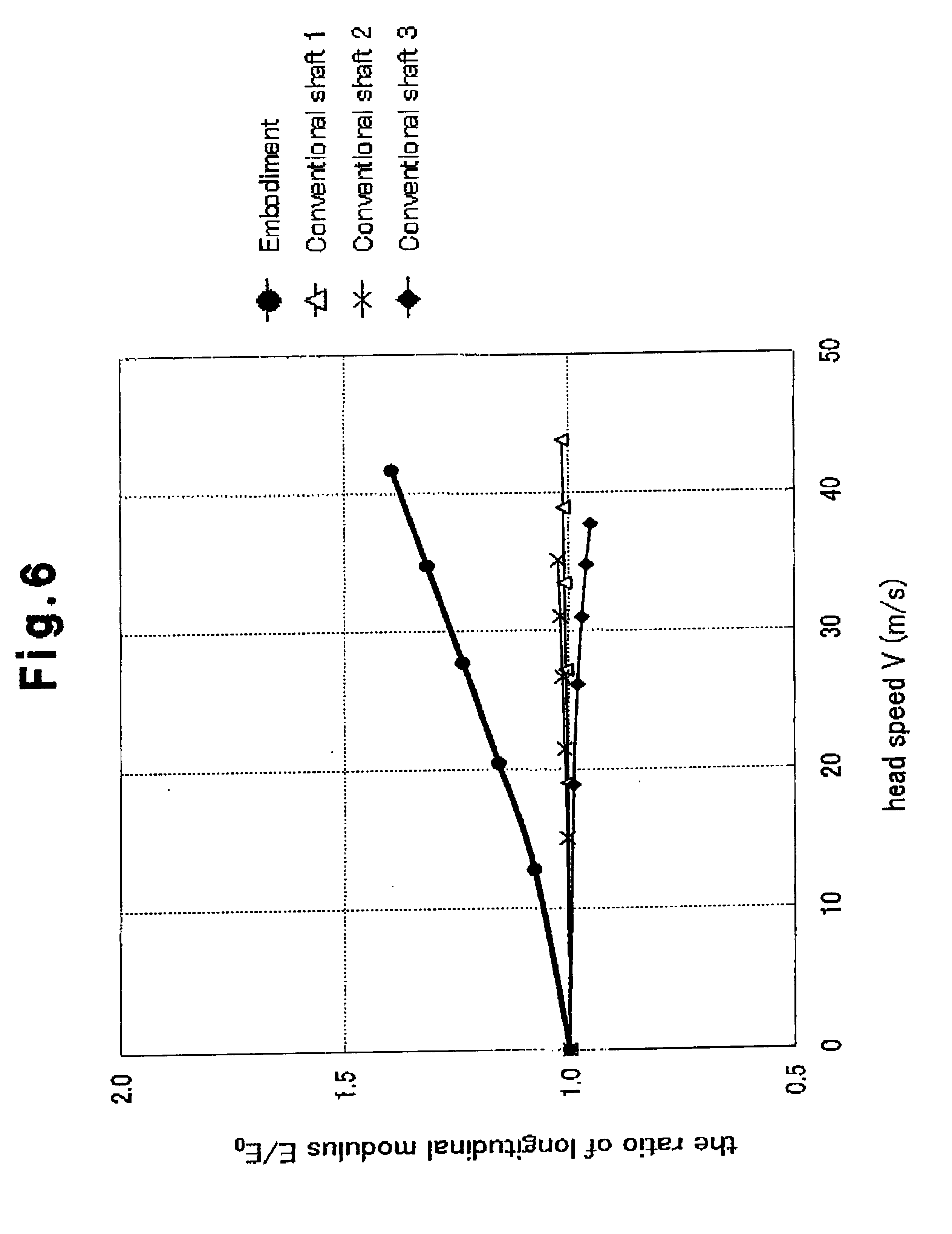 1. A golf club shaft made of fiber reinforced plastics having a braid layer along the length of the shaft that includes first diagonal yarns having a first orientation angle against the longitudinal axis of the shaft and second diagonal yarns having a second orientation angle, which is symmetrical with the first orientation angle, against the longitudinal axis of the shaft as the center axis, wherein the ratio of the longitudinal modulus of the shaft during a swing to the longitudinal modulus of the shaft when the head speed is zero increases with the increase in the head speed, wherein the longitudinal modulus of the shaft at the head speed of about 30 m/s is at least 1.2 times the longitudinal modulus of the shaft when the head speed is zero. 2. A golf club shaft made of fiber reinforced plastics having a braid layer along the length of the shaft that includes first diagonal yarns having a first orientation angle against the longitudinal axis of the shaft and second diagonal yarns having a second orientation angle, which is symmetrical with the first orientation angle, against the longitudinal axis of the shaft as the center axis, wherein the ratio of the longitudinal modulus of the shaft during a swing to the longitudinal modulus of the shaft when the head speed is zero increases with the increase in the head speed, wherein the braid layer includes a portion satisfying an inequality: where θ is the orientation angle, t is the average width of the first and second diagonal yarns, σt is the standard deviation, D is the shaft diameter, and n is the number of diagonal yarns. 3. A golf club shaft according to 4. A golf club shaft according to 5. A golf club shaft according to 6. A golf club shaft according to 7. A golf club shaft according to 8. A golf club shaft according to 9. A golf club shaft according to 10. A golf club shaft made of fiber reinforced plastics having a braid layer along the length of the shaft that includes first diagonal yarns having a first orientation angle against the longitudinal axis of the shaft and second diagonal yarns having a second orientation angle, which is symmetrical with the first orientation angle, against the longitudinal axis of the shaft as the center axis, wherein the ratio of the longitudinal modulus of the shaft during a swing to the longitudinal modulus of the shaft when the head speed is zero increases with the increase in the head speed, wherein the braid layer further comprises warps positioned at the orientation angle of approximately 0, wherein the braid layer includes a portion satisfying an inequality: where θ is the orientation angle, t is the average width of the first and second diagonal yarns and warps, D is the shaft diameter, n is the number of diagonal yarns, and n is also the number of the warps. 11. A golf club shaft according to 12. A golf club shaft according to 13. A golf club shaft according to 14. A golf club shaft according to 15. A golf club shaft made of fiber reinforced plastics having a braid layer along the length of the shaft that includes first diagonal yarns having a first orientation angle against the longitudinal axis of the shaft and second diagonal yarns having a second orientation angle, which is symmetrical with the first orientation angle, against the longitudinal axis of the shaft as the center axis, wherein the ratio of the longitudinal modulus of the shaft during a swing to the longitudinal modulus of the shaft when the head speed is zero increases with the increase in the head speed, wherein the Poisson's ratio expressed by the longitudinal and lateral strains is 0.5 or less at least at a part of the shaft, wherein the longitudinal strain of the shaft is the strain in the longitudinal direction of the shaft and the lateral strain is the strain in the circumferential direction of the shaft when load is applied to the shaft. 16. A golf club shaft according to 17. A golf club shaft according to 18. A golf club shaft according to 19. A golf club shaft made of fiber reinforced plastics having a braid layer along the length of the shaft that includes first diagonal yarns having a first orientation angle against the longitudinal axis of the shaft and second diagonal yarns having a second orientation angle, which is symmetrical with the first orientation angle, against the longitudinal axis of the shaft as the center axis, wherein the ratio of the longitudinal modulus of the shaft during a swing to the longitudinal modulus of the shaft when the head speed is zero increases with the increase in the head speed, wherein the shaft comprises a plurality of the braid layers, wherein each of the braid layers includes an inner layer having first and second diagonal yarns, wherein the inner layer has a portion satisfying an inequality: where θ is the orientation angle of the first and second diagonal yarns, t (t=1.6 through 2.4 (mm)) is the average width of the first and second diagonal yarns, σt (σt/t=approximately 20%) is the standard deviation of the width of the diagonal yarns, D ((3.0 mm≦D≦16.0 mm)) is the shaft diameter, and n (n=2, 4, 8, 16 . . . 2k, where k is a positive integer) is the number of diagonal yarns, and an outer layer positioned over the inner layer having third and fourth diagonal yarns, which are symmetrical with each other at third and fourth orientation angles against the longitudinal axis of the shaft, and warps, wherein the outer layer has a portion satisfying an inequality: where θ is the orientation angle of the third and second diagonal yarns, t′ (t′=1.6 through 2.4 (mm)) is the average width of the third and fourth diagonal yarns, D′ ((3.0 mm≦D′≦16.0 mm)) is the shaft diameter, n′ is the number of the third and fourth diagonal yarns, and n′ (n′=2, 4, 8, 16 . . . 2k, where k is a positive integer) is also the number of the warps.