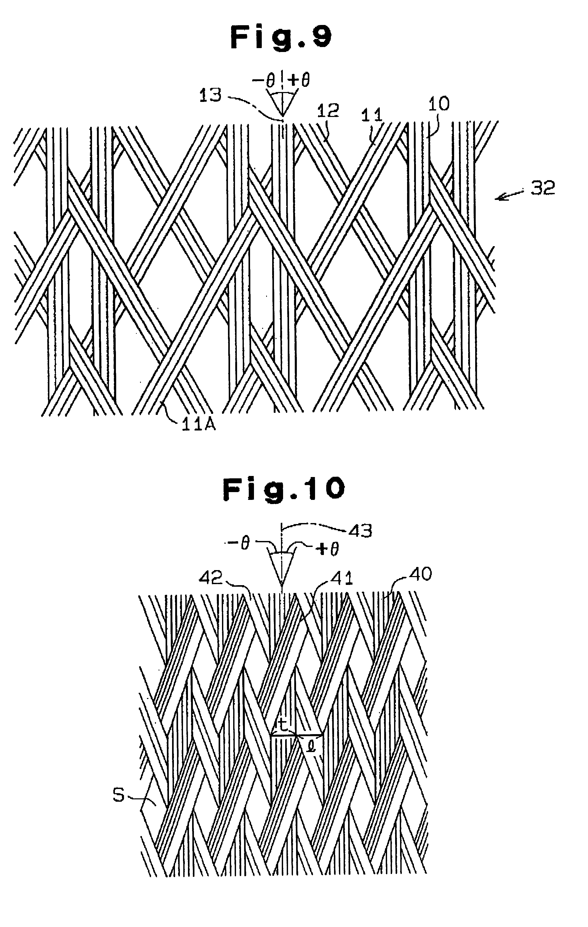 This application claims the priority to Japanese Patent Application No. 2000-357859, filed on Nov. 24, 2000. The present invention relates to a golf club shaft made of fiber reinforced plastics (or an FRP golf club shaft), and in particular it relates to a FRP golf club shaft which facilitates a swing by increasing modulus of longitudinal elasticity with increases in head speed during the swing, and a golf club having such a shaft. A club shaft made of fiber reinforced plastics (hereinafter referred to as an ‘FRP golf club shaft’) is advantageous over metal golf shafts in that it has lighter weight than metal ones, which makes it easier to accelerate a swing and increase the flying distance. Thus, the FRP golf club shaft is extensively employed. The FRP golf club shaft is a shaft formed of reinforcing fibers impregnated with resin. Types of FRP shafts include a shaft fabricated in the sheet rolling process (S/R shaft), a shaft fabricated in the filament winding process (FW shaft), and a braided shaft. The S/R shaft is formed by winding unidirectional prepreg sheets made of reinforcing fibers over a mandrel. The FW shaft is formed by winding a fiber bundle (yarn) of reinforcing fibers around the mandrel while reciprocating them along the longitudinal axis of the mandrel. The braided shaft is formed by braiding a plurality of fiber bundles (yarn) of reinforcing fibers or tow prepregs (or yarn prepregs) while braiding them over the mandrel to the substantially entire length of the shaft. The braided shaft is superior in improved bending strength since no joint exists both in the longitudinal and circumferential directions of the shaft and braid yarns are intertwined. For example, JP-A-6-278216 discloses a braided shaft. The braided shaft is formed by intertwining a plurality of diagonal yarns, which are positioned symmetrically at a certain orientation against the longitudinal shaft axis, and warps positioned at 0° against the longitudinal shaft axis. The diagonal yarns and warps are interwoven to form a triaxial braid layer, which improves the bending strength of the shaft. JP-A-11-342233 also discloses a braided shaft that is formed by laminating a plurality of braid layers. When all the braid layers have the triaxial construction that has a plurality of diagonal yarns set symmetrically against the longitudinal axis and warps set at 0° against the longitudinal axis, the three types of yarn overlap with each other at some portions and do not overlap at the others. In other words, the height differs at these portions. Thus, the shear strength between the braid layers decreases, and the bending strength and torsional strength are weakened. Consequently, conventional braided shafts have triaxial construction in its outer braid layer and biaxial construction in its inner braid layers. The conventional shafts address an improvement in bending strength by including triaxial braid layers having symmetrical diagonal yarns and warps. However, during a swing, centrifugal load on the shaft increases with increases in the head speed, thus affecting the shaft performance (i.e., bending deformation of the shaft and the corresponding change in feelings or flying distance). Therefore, the relationship between the load due to centrifugal force and deformation should be studied more in detail. Consider the state of the shaft during a swing. The golfer causes generally rotational motion of the head of the club during a swing to hit a ball. It is assumed that (1) centrifugal force immediately before the impact and (2) inertial force caused by acceleration or deceleration of the head are applied to the shaft. More specifically, the centrifugal force of (1) is 300 to 500 N which is generated immediately before the impact, during which time the head speed reaches 40 to 50 m/s. This force pulls the entire shaft in the centrifugal direction of the rotational motion and causes bending deformation and tensile deformation in the shaft. The inertial force of (2) originates in acceleration or deceleration of the head when the golfer rotates, twists, or translates his waist, arms, or wrists. This force applies bending or torsional moment on the shaft, thus causing its bending or torsional moment. The centrifugal and inertial forces produce (A) tensile stress and compression stress symmetrical to the neutral plane that are caused by bending moment on the shaft that is applied in the direction of the shaft and (B) tensile stress in the longitudinal direction that is caused by centrifugal force. The neutral plane of (A) means a virtual plane located along the longitudinal axis of the shaft upon which no tensile stress and compression stress act. The centrifugal force particularly acts on the shaft with significant force in the state before the impact, in which the club is swung down and the head speed has increased to some extent. In this state, the tensile deformation in the centrifugal direction and compression in the circumferential direction of (B) are negligibly small, while the bending moment of (A) increases with the acceleration of the head speed. In other words, as the centrifugal force on the shaft increases, the shaft deflects in a complicated fashion in combination with the change in the inertial force caused by the swing. Great increases in the bending moment change the deflection of the shaft greatly, which makes the degree of deformation unstable in the conventional shafts. This sometimes affects swings or feels (such as stability) perceived by golfers when they swing the golf clubs. Professional golfers, who have relatively high physical power and thus cause fast head speed and great deformation of the shaft or who have a more sensitive touch, are more likely to notice this shaft deformation. In particular, the shaft deformation immediately before the impact affects the trajectory of the balls hit. Therefore, it is important to suppress the shaft deformation and to stabilize the hit of the balls. As s
