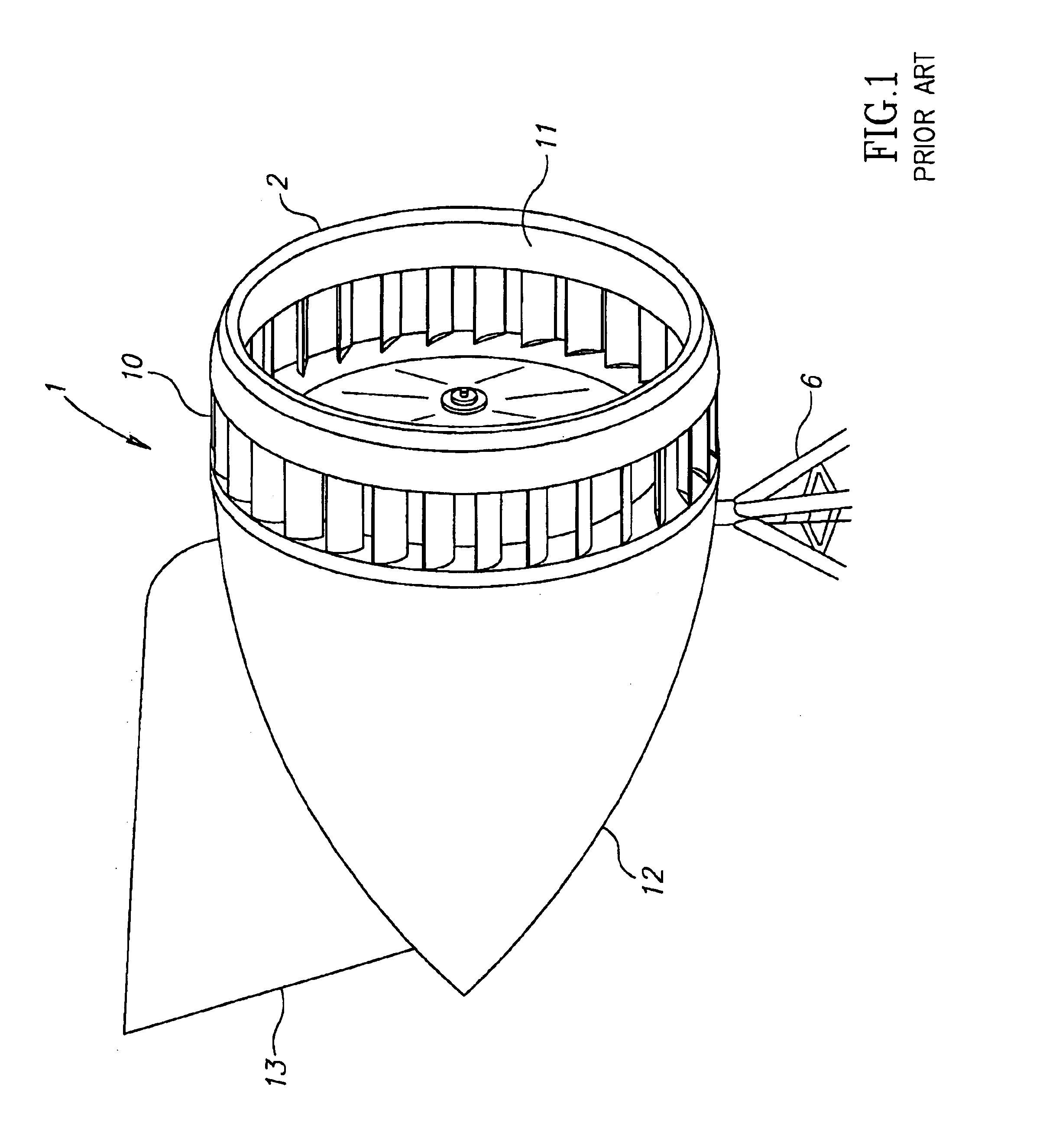 This application claims priority from Australian Application PS2667, filed May 30, 2002. The present invention relates generally to a fluid turbine. In particular, the invention concerns a wind turbine, although it may also be driven by other fluids such as water. Machinery for extracting power from the wind has been known for centuries. Early types, known as windmills, were used to power mills for grinding grain and for similar applications. They typically had a rotor with a number of radial blades or fabric sails and means for orienting the rotor to face into the wind when required and for “feathering” or furling the blades or sails when not required or in strong winds. They were of low sophistication and low efficiency. Many were of considerable size in order to generate useful quantities of mechanical power. Agricultural and other applications in which operation of mechanical devices such as pumps was required led to development of new and improved machines for harnessing wind power. An example still widely seen is the ordinary “windmill” used for pumping well water for farm stock. Such machines typically have a rotor with a number of simple sheet metal blades thereon, and drive mechanical equipment directly through gearing. They were (and are) typically smaller in rotor diameter and more efficient than the earliest windmills and their rotors operate at somewhat higher speeds. Vane arrangements are provided to face the rotor into the wind and to orient it suitably to avoid damage in high winds. With the development of electrical technology, machines were developed to convert wind power to electrical power through generators. This trend began with small scale machines, used for remote area power supply, but has now become much more important, with many machines of large scale being used to supply large-area power grid systems alongside coal-fired and other types of power stations. Improving understanding of fluid flow in the 19th and 20th centuries has led to the development of new types of machines and to better design techniques. The term “windmill” is giving way to “wind turbine” for most applications as the machines themselves have developed in sophistication and scale. Although machines have been developed in which the axis of rotation of the rotor is vertical (e.g. the Darrieus and Savonius types well known in the art), the most common wind turbine type has a rotor with a horizontal axis of rotation and a small number of radial blades, so that the rotor appears similar to an aircraft propeller. Such horizontal axis wind turbines have been built in very large sizes and with great sophistication in their design. However, the use of large numbers of turbines of this type for power generation is still marginal economically and is controversial, due to their size, their often unattractive appearance, their noise and even their interference with radio-frequency transmissions caused by the large rotating blades. Also, their sophistication in itself has the problem that ongoing maintenance can be expensive and difficult, greatly affecting life-cycle costs and even their ability to be used in some places where suitable people to maintain them are not available. The present invention is intended to address these problems. The wind turbine disclosed herein is comparatively simple, robust, easy and comparatively cheap to manufacture and maintain in the intended sizes. Yet it is believed to have surprisingly good efficiency and so to be able to provide useful amounts of power in the intended size and cost range. Further, it is believed to have satisfactory noise characteristics, and a reasonable appearance. While not necessarily of the theoretically highest possible efficiency, it is believed that the wind turbine of the present invention provides a useful alternative to other types available due to this combination of properties. The present invention was conceived in an attempt to improve on the wind turbine disclosed by Cobden in U.S. Pat. No. 4,415,306 and Australian Patent No. 563265 (hereinafter referred to as the Cobden wind turbine). As described below, this machine differed radically from conventional horizontal-axis wind turbines of the “high speed” type having two or three radial propeller-style blades often used for electric power generation, and of the “low speed” type having a larger number of radial blades and typified by the agricultural windmill used for pumping water. Although quiet and visually acceptable, it was believed that the Cobden turbine's performance could be improved. Wind turbines similar to the Cobden turbine were disclosed by Aylor in U.S. Pat. No. 4,781,523 as offering higher efficiency. One embodiment, very similar to the Cobden turbine, had multiple blades arranged peripherally on a rotor with their lengths parallel to the rotation axis of the rotor with fairings provided for causing air to flow radially through the blades. In another embodiment, the rotor had blades extending forwardly and outwardly from a hub, with air flowing outwardly and backwardly through the blades. In both embodiments, particular relationships between air inlet and outlet areas and flow directions were specified, as discussed further below. Neither embodiment was considered particularly cheap or simple to manufacture, due to the required shape of the flow deflector(s) and rotor support body. U.S. Pat. No. 4,684,316 (Karlsson) discloses a somewhat similar arrangement that was felt likely to have high cost in large sizes and high aerodynamic losses from the non rotating parts upstream of the rotor. Many Wind turbines have been disclosed in which higher efficiency than in conventional types was to be obtained by enclosing a bladed rotor in a duct with a diffuser section downstream of the rotor. These enable faster flow through the blading which can accordingly be more effective in generating power, and reduce blading tip losses. Some examples are in U.S. Pat. No