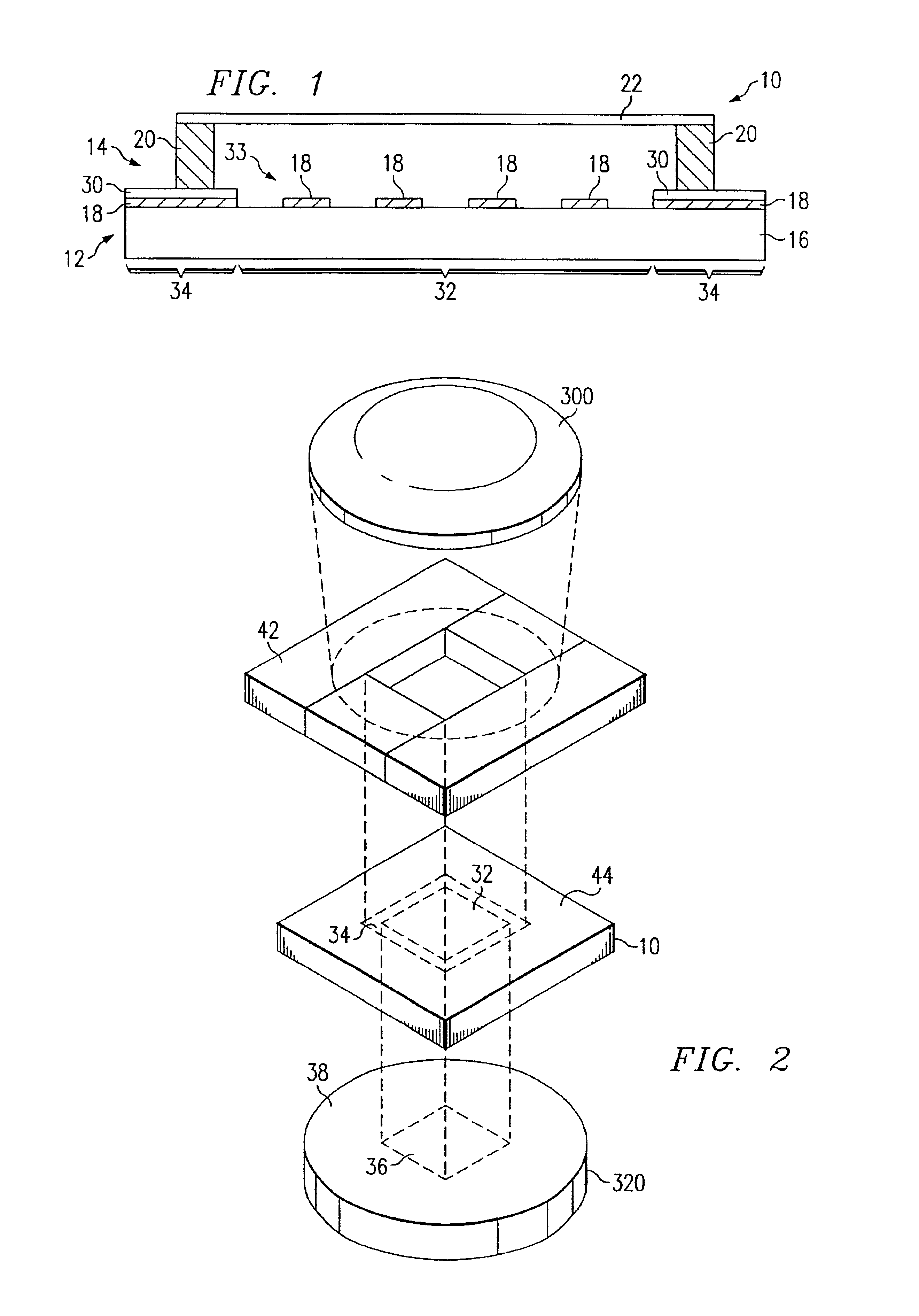 For transmissive systems, the EMR passes through substrate 16, and the circuit image from pattern 33 in mask field 32 is projected onto the surface of an object being imaged, such as a semiconductor wafer 320. The area of semiconductor wafer 320 that receives the EMR transmitted through mask field 32 is known as the image field 36. As depicted in FIG. 8, in the example embodiment, opaque material 30 may be applied to the topside of the photomask (i.e., the side with the pattern of optical absorber). As evident from FIGS. 8 and 2, when photomask assembly 10 is used to image wafer 320, EMR may be projected onto photomask assembly 10 from the backside (i.e., the side opposite the topside), and opaque layer 30 may prevent the EMR from passing through border region 34 and exposing areas of wafer 320 outside image field 36. Opaque layer 30 on border region 34 thus serves to ensure that image field 36 corresponds precisely to mask field 32. For instance, opaque layer 30 may prevent the EMR from striking non-target regions 38 of semiconductor wafer 320 (i.e., regions outside of image field 36) and may prevent EMR that strikes border region 34 from causing background exposure on semiconductor wafer 320. For example, the lithography system may step across wafer 320 to expose a series of image fields 36, and the opaque border may prevent partial illumination of adjacent image fields.