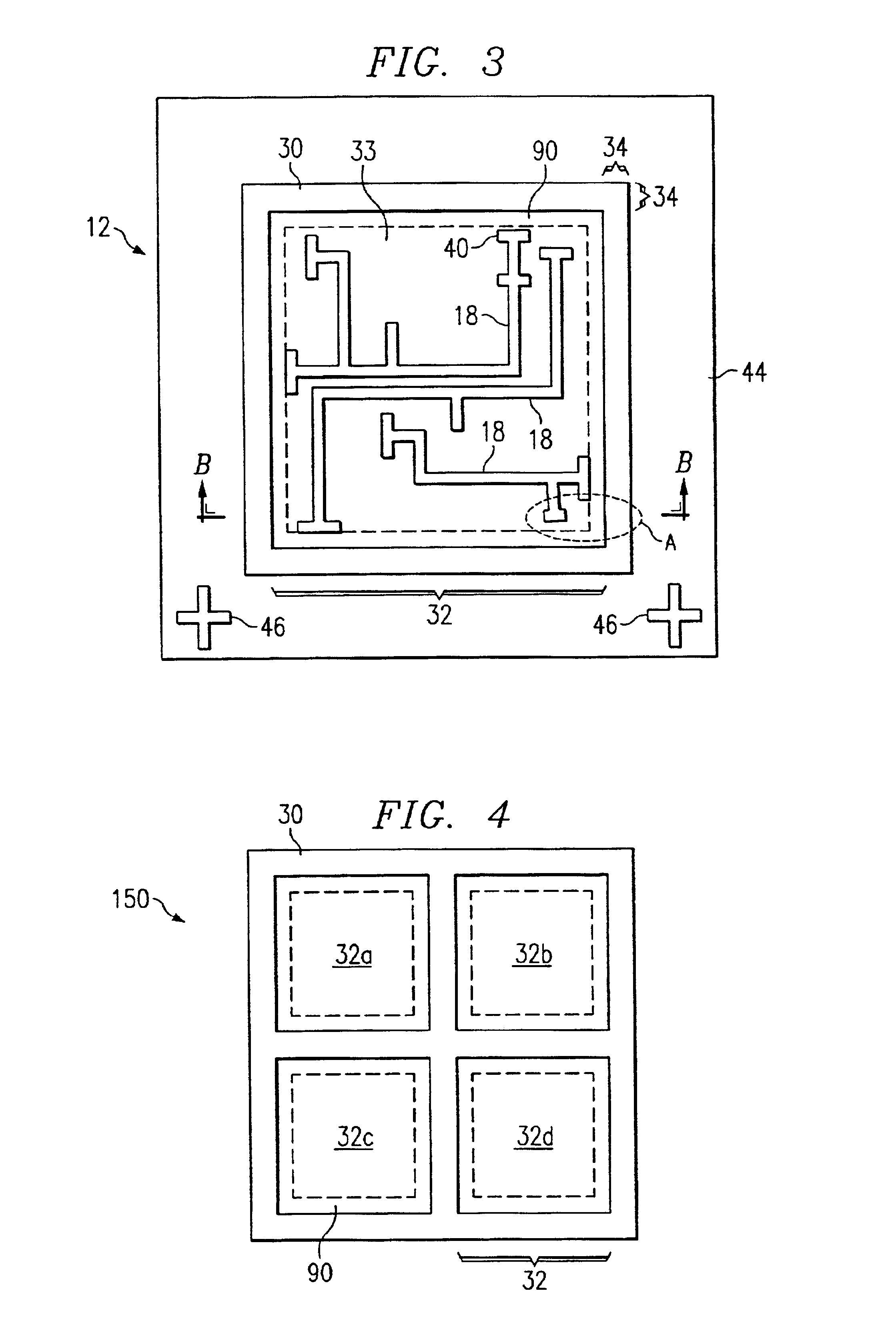 FIG. 4 illustrates an alternative photomask 150 that features four mask fields designated 32a, 32b, 32c, and 32d; respective insulating clear regions 90 surrounding each mask field 32a, 32b, 32c, and 32d at the perimeter of each mask field 32a, 32b, 32c, and 32d; and a border of opaque material 30.