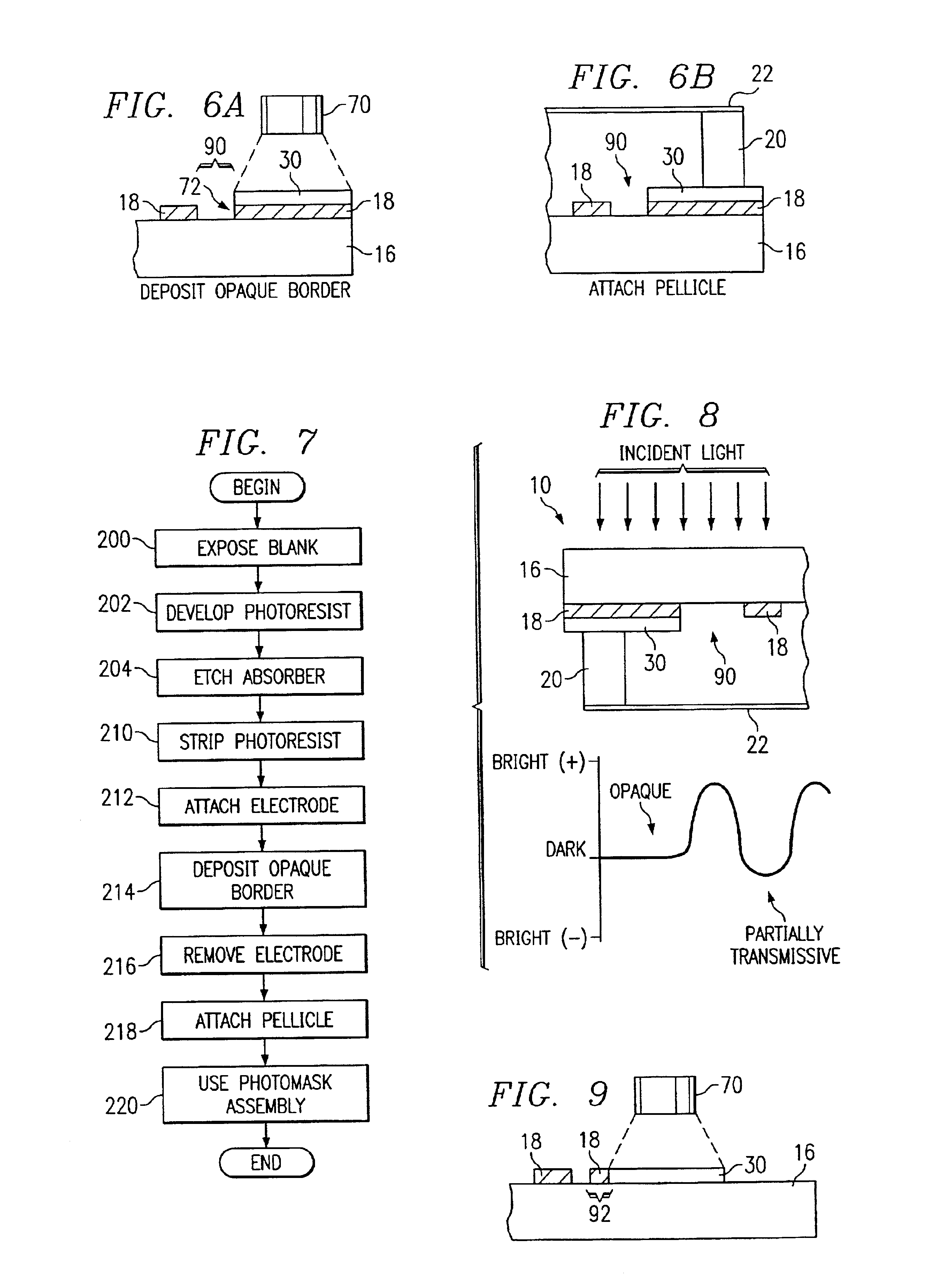 During electroplating, insulating clear region 90 acts as a barrier to the electric current and prevents the plating metal from adhering to the pattern. The plating metal only needs to be thick enough to make the border region opaque to an exposure wavelength emitted in a photolithography system. Any metallic electroplate that provides good adhesion to the partially transmissive layer, has adequate opacity, and has a low defect density during processing of the mask (e.g., from electroplating through mask cleaning) may be used. As indicated in block 216 and 218 and FIG. 5G, steps to complete fabrication of photomask assembly 10 may include removing electrode 68 and attaching pellicle 14.