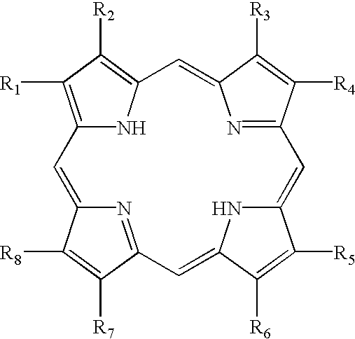 5. The method of claim 1, wherein said porphyrin compound is selected from mesoporphyrin derivatives, deuteroporphyrin derivatives, coproporphyrin derivatives, uroporphyrin derivatives, pentacarboxyporphyrin derivatives, hematoporphyrin derivatives, protoporphyrin derivatives, hexacarboxyporphyrin derivatives, chloroporphyrin e6 derivatives, chloroporphyrin e4 derivatives, phylloporphyrin derivatives, rhodoporphyrin derivatives, pyrroporphyrin derivatives, pheoporphyrin a5 derivatives, and phylloerythrin derivatives.