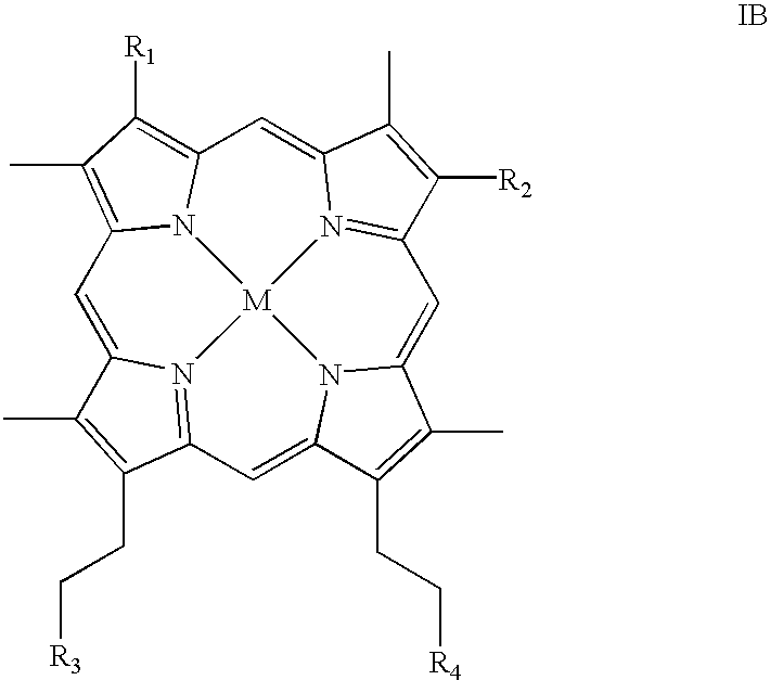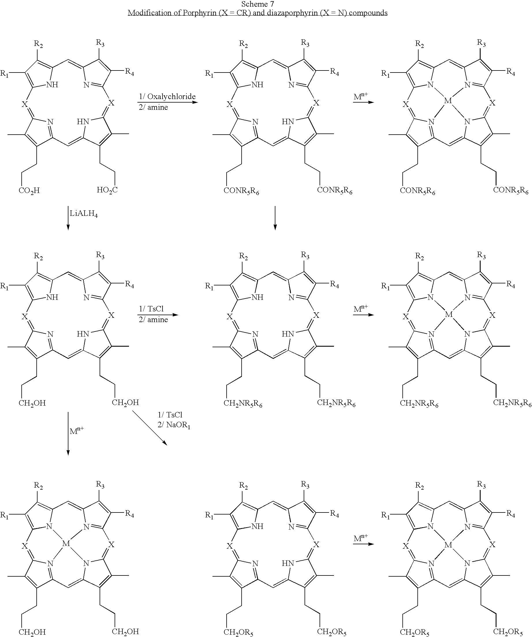3,3′-dimethyl-4,4′-di(methyl propionate)dipyrromethane (1.05 g) was dissolved in ethyl acetate (25 ml) and bromine (1.5 g) was added dropwise. A dark brown precipitate was formed. The reaction was cooled and the solid filtered and dried. Yield of dibrominate dipyrromethane=0.95 g. This material was dissolved in methanol (50 ml), and sodium azide (1 g) in water (5 mL) was added and the reaction refluxed for 3 days. UV/Vis analysis of the reaction showed the disappearance of the 429 nm peak (due to dipyrromethane) and appearance of two peaks at 545 nm and 620 nm. The solvent was evaporated and the residue chromatographed over silica gel (2-5% methanol/dichloromethane). The fast running blue/purple band, which was 3,7,14,17-tetramethyl-5,10-diazaporphyrin-2,8,12,18-tetra(propionic acid methyl ester), was isolated. Yield 3,7,14,17-tetramethyl-5,10-diazaporphyrin-2,8,12,18-tetra(propionic acid methyl ester)=of 100 mg. This material was metallated as described in example 21. Yield, 75 mg.