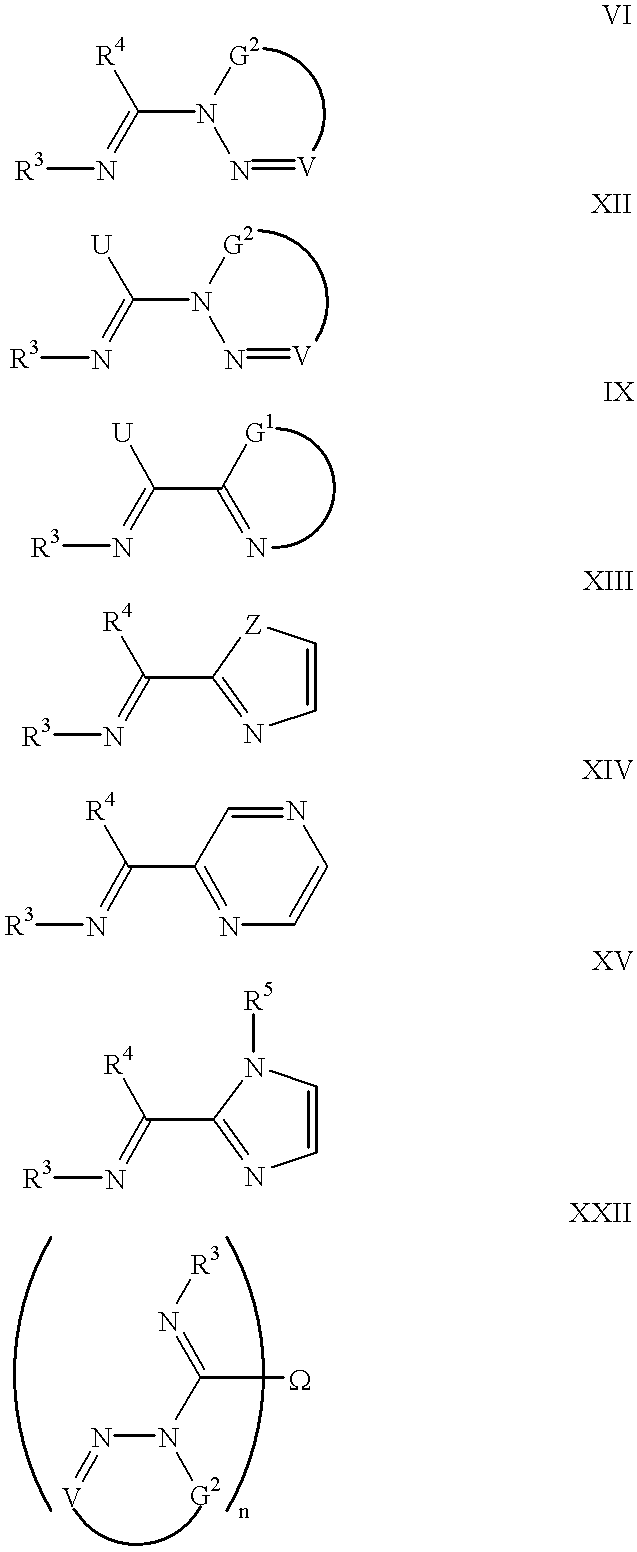Preferred neutral Lewis acids include: MAO and other aluminum sesquioxides, R37Al, R72AlCl, and R7AlCl2wherein R7is alkyl. Complex V and compound Y may be combined in the liquid phase. The liquid phase may include solvent or neat monomer. In a process for preparing polyolefins, complex V and compound Y may be combined in the presence of monomer The molar ratio of compound Y to complex V may be from about 10 to 10,000. A second methodology for the in situ generation of an active complex of the formula I involves contacting a ligand with a suitable transition metal complex in the presence of a Bronsted acid and ethylene to provide an active catalyst. An example of using this methodology to prepare a catalyst of formula I would involve contacting a ligand of formula VI, XII, IX, XIII, XIV, XV, or XXII (as described above) with a suitable Ni complex (such as Ni(1,5-cyclooctadiene)2) and a Bronsted acid (such as HB(Ar)4where Ar is 3,5-bis(trifluoromethyl)phenyl) in the presence of an olefin (such as ethylene) to generate an active olefin polymerization catalyst of formula I. Specific examples of this methodology are detailed in the example section below. (See also, L. K. Johnson et al., WO Patent Application 96/23010). Preferred neutral Lewis acids include: MAO and other aluminum sesquioxides, R37Al, R72AlCl, and R7AlCl2wherein R7is alkyl. The skilled artisan, in possession of this disclosure, could make the present compounds without undue experimentation. Methods of synthesizing complexes I and II and compounds VI, XII, IX, XIII, XIV, XV, and XXII are also illustrated in the following examples. Preferred ligand components for use in complex I or II and preferred catalyst systems utilizing complex I or II are also set forth in the following examples. The present invention also provides processes for preparing polyolefins utilizing complexes I, II, and compounds VI, XII, IX, XII, XIV, XV, and XXII. The present invention also provides a class of olefin polymerization catalysts based on late transition metal complexes of bidentate ligands comprising one imidate ester, thioimidate ester, selenoimidate ester, or amidine N-donor fragment, and one heterocyclic N-donor fragment, the two fragments together comprising a neutral bidentate, N,N-donor ligand. In one aspect, the catalyst “system” further comprises a Lewis or Bronsted acid. An electron deficient metal center is advantageous for efficient olefin polymerization. A further embodiment of the present invention provides catalyst systems wherein a binucleating or multinucleating ligand is complexed to a transition metal and one or more Lewis acids to obtain an active olefin polymerization catalyst. While not wishing to be bound by any theory, it is believed that the Lewis acid complexation renders the transition metal more electron deficient rendering the transition metal catalyst more active and/or selective, and/or potentially providing a site to bind the catalyst system to a surface. Thus, broadly, catalyst systems of this embodiment of the present invention comprise ligand components, such as the ligand components described above, complexed with a transition metal and a Lewis acid. Preferred catalyst systems of this embodiment of the present invention include catalyst systems wherein the Lewis acid is bound to one or more heteroatoms which are π-conjugated to the donor atom or atoms bound to the transition metal. Thus, in a further preferred embodiment, the invention provides a process for the polymerization of olefins comprising contacting one or more monomers of the formula RCH═CHR1with a binucleating or multinucleating ligand complexed to a Group 8-10 transition metal M and one or more Lewis acids, wherein the Lewis acid or acids are bound to one or more heteroatoms which are π-conjugated to the donor atom or atoms bound to the transition metal M; and R and R1are each, independently selected from hydrogen, hydrocarbyl, fluoroalkyl, or may be linked to form a cyclic olefin. Examples of catalyst systems comprising a Lewis acid-ligand-transition metal complex of the present invention include XIX: