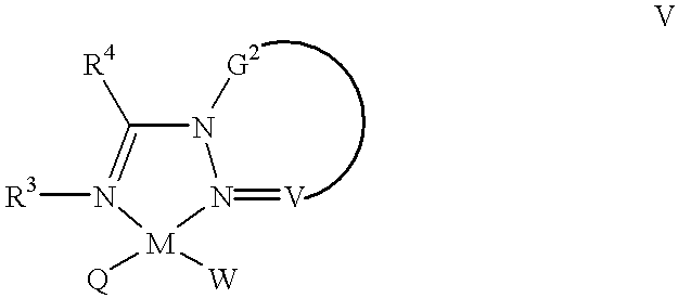 A 50 mL Schlenk flask equipped with a magnetic stir bar and capped with a septum is charged with 0.2 mmol of compound VI from example 88 and 0.2 mmol (1,2-dimethoxyethane)nickel(II) dibromide (Aldrich) under an inert atmosphere. Dry, deoxygenated dichloromethane (5 mL) is added and the mixture is stirred under an argon atmosphere, slowly preparing a crystalline precipitate. After 1 hour, another 5 mL dichloromethane is added. The mixture is stirred another 21 hour at 21° C., then diluted with 10 mL dry, deoxygenated hexane and stirred another 8 hour. The supernatant is removed via a filter paper-tipped cannula, and the residue dried in vacuo at 1 mm Hg to afford compound VII. A 200 mL pear-shaped Schlenk flask equipped with a magnetic stir bar and capped with a septum is charged with 10 mg of compound VII from example 89. The flask is evacuated and refilled with ethylene, then charged with 75 mL dry, deoxygenated toluene. The resultant suspension is cooled to 0° C. and allowed to equilibrate with 1 atm ethylene for 15 min, then treated with 4.0 mL of a 10 wt % solution of MAO in toluene (Aldrich) and stirred under 1 atm ethylene. After 60 minutes, the reaction is quenched by the addition of methanol, acetone and 6 N aqueous HCl to produce a polyethylene precipitate. A cooled solution of 2-acetylthiazole (4 mmol) and 2,6-diisopropylaniline (12 mmol) in toluene (15 mL) is treated with TiCl4(2,0 mL of 1.0 M solution in toluene), immediately yielding an olive green precipitate. After allowing the reaction to warm to room temperature, stirring is continued for 72 hours before the reaction contents are filtered through alumina, rinsing with ethyl acetate. The filtrate is washed sequentially with 0.6 M HCl, saturated sodium bicarbonate, and brine, then dried over magnesium sulfate, filtered, and concentrated to afford E1 as a yellow solid 2-Imidazolecarboxaldehyde (2.9 mmol) is added to a solution of diisopropylaniline (2.9 mmol) in ethanol (10 mL). The reaction is refluxed for 4 hours, then concentrated to a small volume, taken up in ethyl acetate, and washed. Removal of solvent by rotary evaporation gives an oil that crystallized over time, is isolated by filtration, washed, and used without further purification. A molar excess of thiazole/imine E1, from Example 91, and (DME)NiBr2are combined as solids in an inert atmosphere glove box. then removed from the glove box and treated with dry CH2Cl2. The suspension immediately develops a deep orange/brown color and is stirred overnight at room temperature. The solvent is evaporated under a stream of argon, and the precipitated solid is washed several times with hexane and hexane/methylene chloride before being dried in vacuo to give the pre-catalyst F1 as an orange/brown powder. Methylene chloride (10 mL) is added to a mixture of crude imidazole/imine E2 (100 mg) from example 92, and (DME)NiBr2(27 mg) The suspension gradually develops a bright green color, then appears to darken somewhat. After stirring overnight, the solvent is evaporated under a stream of argon, and the precipitated solid is washed several times with hexane and hexane/methylene chloride before being dried in vacuo to give the pre-catalyst F2 as a yellow-green powder. The thiazole/imine complex F1 (12 mg), from Example 93, is suspended in 20 mL of dry toluene. The reaction mixture is cooled to 0° C. and equilibrated under an ethylene atmosphere, then treated with MAO (1.8 mL of a 10% by weight solution in toluene) and stirred under 1 atm ethylene for 30 minutes. The reaction is quenched by the sequential addition of acetone, methanol, and 6M HCl. The precipitated polyethylene is isolated by filtration, washed, and dried in vacuo. Polymerization of ethylene with catalyst system IV.