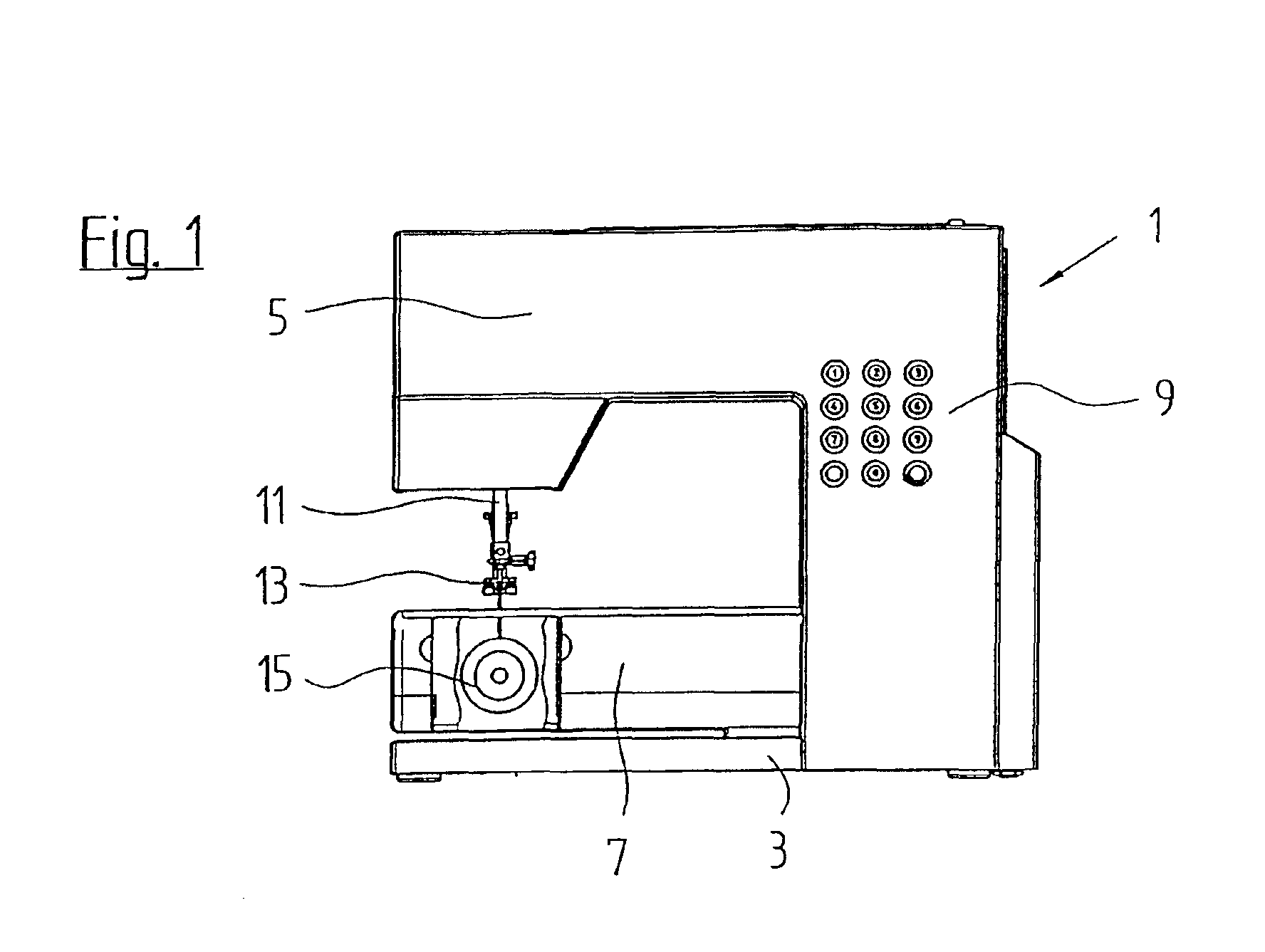 From a light source (51), light beams (57) are directed tangentially through the hook body (17), the hook base (27), and the bobbin case (28), onto a light receiver (53). Using the time (t) or the position of angular rotation of the hook body (17) at the impingement of the first light beam (57), the diameter of the bobbin packing on the lower thread bobbin (29) can be calculated.