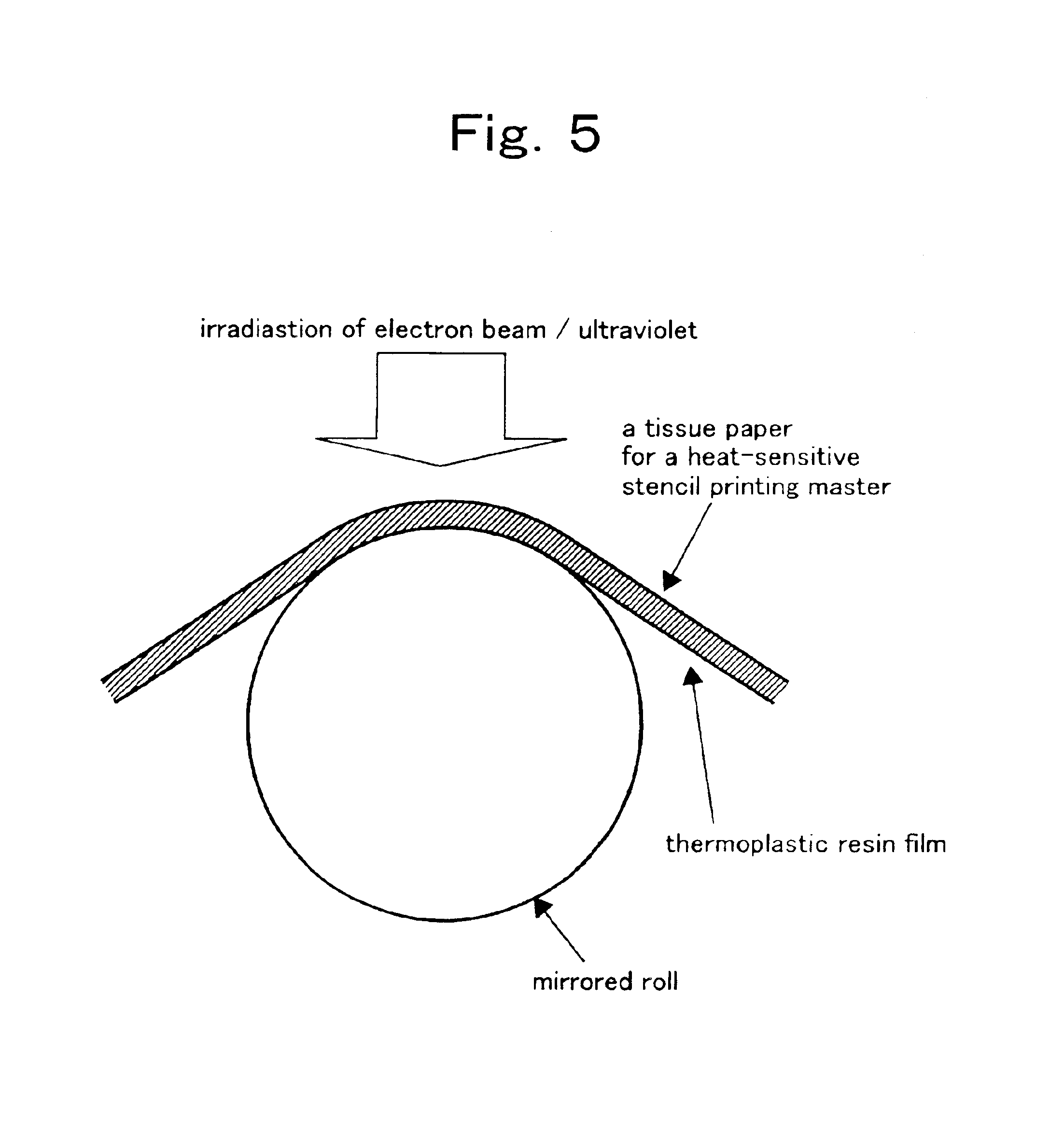 With regard to the size-press processing in the present invention, though the impregnation of the tissue paper used for heat-sensitive stencil sheet with an ionizing radiation-curable resin may includes, but not limited to, reverse roll coating, gravure coating, offset gravure coating, kiss coating, wire bar coating, blade coating, transfer roll coating, die coating, and the like by controlling viscosity of coating liquid, each those coating techniques are effected from one side of surface only of a substrate to be coated, thus homogeneous impregnation covering whole layer thickness of the tissue paper is hardly effected by those coating techniques. For the easy achievement of a smoothen surface after lamination without releasing of fiber from tissue paper treated, which is also one purpose of the present invention, the size-press processing suited to a impregnating is the most favorable coating, and thereby whole layer thickness of tissue paper used for heat-sensitive stencil sheet is homogeneously impregnated. As a fourth feature of the present invention, there are provided a tissue paper used for heat-sensitive stencil sheet impregnated with the ionizing radiation-curable type of resin, the tissue paper is that being obtained by separating of a multi-layer paper according to any paragraphs (2) or (4), as described in paragraph (5) According to the feature of the present invention, it is possible to obtain easy a tissue paper used for heat-sensitive stencil sheet which has a lowered basis weight and an excellent passing-through of ink, both that are difficult to attain by conventional techniques. As a fifth feature of the present invention, there are provided a tissue paper used for heat-sensitive stencil sheet being obtained by exposing a tissue paper used for heat-sensitive stencil sheet according to any one paragraph selected from paragraphs (1), (3) and (5) to electron beam, as described in paragraph (6); and a tissue paper used for heat-sensitive stencil sheet being obtained by exposing a tissue paper used for heat-sensitive stencil sheet according to any paragraphs (2) or (4) to electron beam, as described in paragraph (7). Tho tissue paper used for heat-sensitive stencil sheet by the feature of the present invention, an ionizing radiation curable resin impregnated in the tissue paper used for heat-sensitive stencil sheet is that being cured by exposure to an electron beam as an ionizing irradiation, thereby bonding strength between fibers, strength against stretching, ink passing-through, all those properties are simultaneously required for thermal tissue paper used for heat-sensitive stencil sheet, attained. Hereinafter, heat-sensitive stencil sheets derived from above-mentioned tissue paper used for heat-sensitive stencil sheets by present invention, and production methods thereof are described below. As a sixth feature of the present invention, there is provided a heat-sensitive stencil sheet having a thermoplastic resin film which is, at its surface of one side, bonded by point-bonding (spot-bonding) to a tissue paper used for heat-sensitive stencil sheet according to any one paragraph selected from paragraphs (1), (3), (5), (6), and a heat-sensitive stencil sheet according to paragraph (7), an anti-sticking layer on the other surface of the thermoplastic resin film, wherein there is a porous resin layer provided to surface of one side of the thermoplastic resin film, the thermoplastic resin film, on the other surface thereof, is bonded by point-bonding to a tissue paper used for heat-sensitive stencil sheet, an anti-sticking layer, and the tissue paper being impregnated with an ionizing radiation-curable type of resin, as described in paragraph (8). The heat-sensitive stencil sheet of the present invention allows the tissue paper used for heat-sensitive stencil sheet and the thermoplastic resin film to be ideally bonded to each other, thus improving the ease of perforation and creating sharp images in prints. Also, as the tissue paper is impregnated with an ionizing radiation-curable resin material, its mechanical strength can be improved hence contributing to the economical production of the heat-sensitive stencil sheet, and which exhibits no removal of the fibers and thus is high in the quality. Moreover, as the protective layer to prevent sticking is provided on the film, it can protect a thermal head from sticking with a fused surface of the thermoplastic film, thus it enables the preparation of a master that yields solid image prints. The anti-sticking layer may be a thin layer containing silicon oil, silicon resin, fluorine resin, a surface active agent, a destaticizer, a heat resistant agent, an anti-oxidization agent, organic particles, inorganic particles, a pigment, a dispersant, an antiseptic agent, and an antifoaming agent. The thickness of the thin layer ranges preferably from 000.5 to 0.4 μm and more preferably from 0.01 to 0.4 μm. The method of forming the anti-sticking layer on the heat-sensitive stencil sheet of the present invention is not limited to but may be made by applying and drying a coated solution layer made of water or a solvent with the use of a roll coater, a gravure coater, a reverse coater, or bar coater. The thermoplastic resin film according to the present invention may be selected from known polyester, polyamide, polypropylene, polyethylene, polyvinyl chloride, polyvinylidene chloride, and their copolymer. Preferably, polyester film is employed for favorable sensitivity to perforation. Characteristic examples of the polyester film are polyethylene, terephthalic, copolymer of ethylene terephthalate and ethylene-isophthalate, and copolymer of hexamethylene terephthalate and cyclohexanedimethylene terephthalate. For improving the sensitivity to perforation, the copolymer of ethylene terephthalate and ethylene-isophthalate or the copolymer of hexamethylene terephthalate and cyclohexanedimethylene terephthalate is favorably selected. The ther