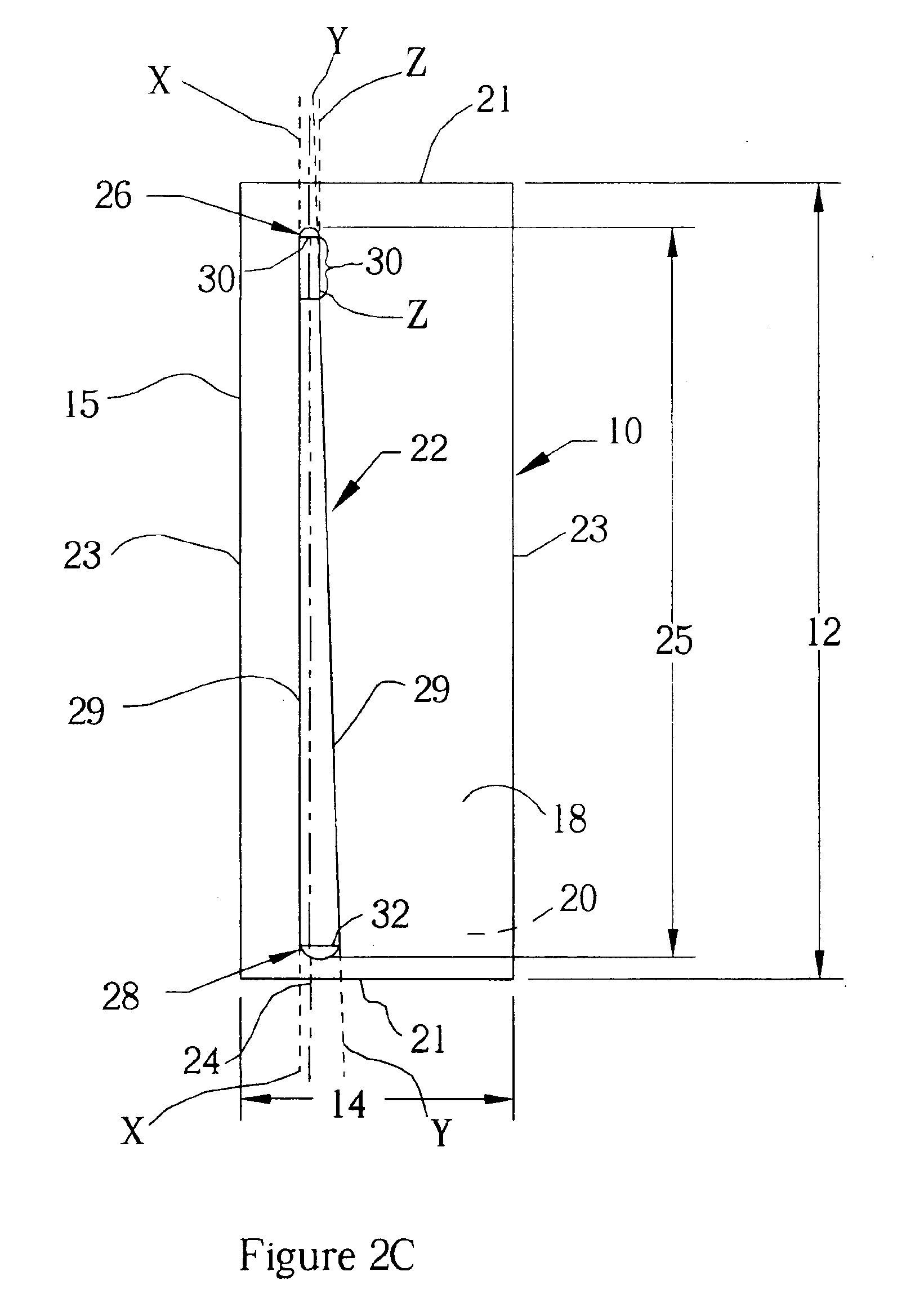 The guide groove 22 may be tapered so as to increase the width of the guide groove 22 as one moves from the first end 26 to the second end 28. In one embodiment, the taper may be such that the width of the groove 24 increases by about {fraction (1/16)} of an inch (about 0.158 cm) about every foot (about 30.48 cm) of length, or about 0.2984 degrees. In a preferred embodiment, the guide groove 22 should have a second end 28 with a major width 32 that is at least about ½ inch (about 1.27 cm). This allows for easy insertion of a ½ inch (about 1.27 cm) cutting tool to be passed through the guide groove 22 without risking damage to the guide groove 22 or cutting tool. It should be noted that the guide groove 22 may be tapered along one or both of its longitudinal sides 27 and 29. That is, one or both of the longitudinal groove sides 27 and/or 29 may be nonparallel to the longitudinal centerline 24 of the guide groove 22. In a preferred embodiment, both longitudinal guide groove sides 27 and 29 are nonparallel to the longitudinal centerline 24 and each other. An example of this is shown in FIG. 2A. An example of an embodiment where one of the longitudinal sides, side 27 is generally parallel to the longitudinal centerline 24 and the other longitudinal side 29 of the guide groove 22 is not is shown in FIG. 2C.