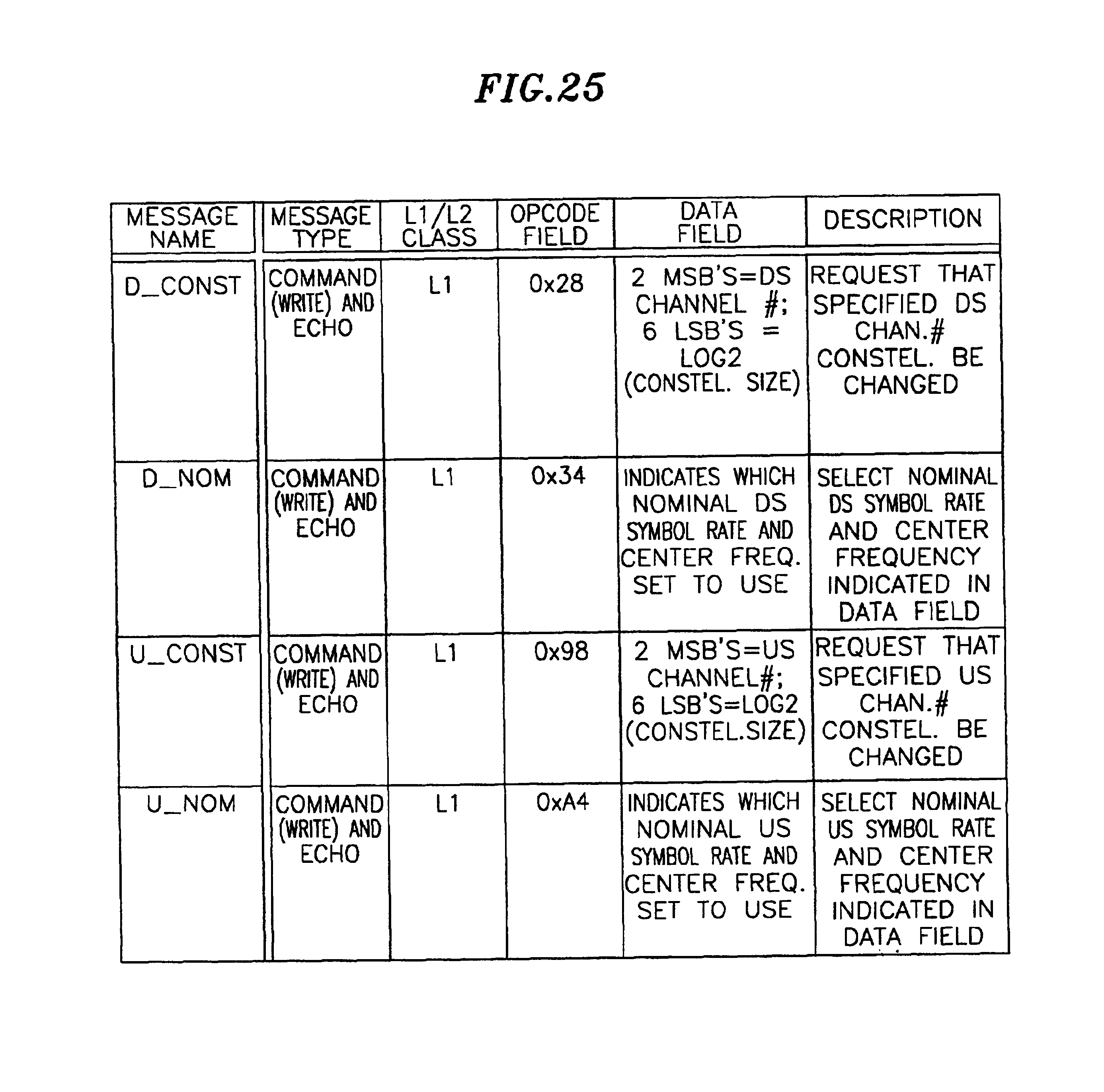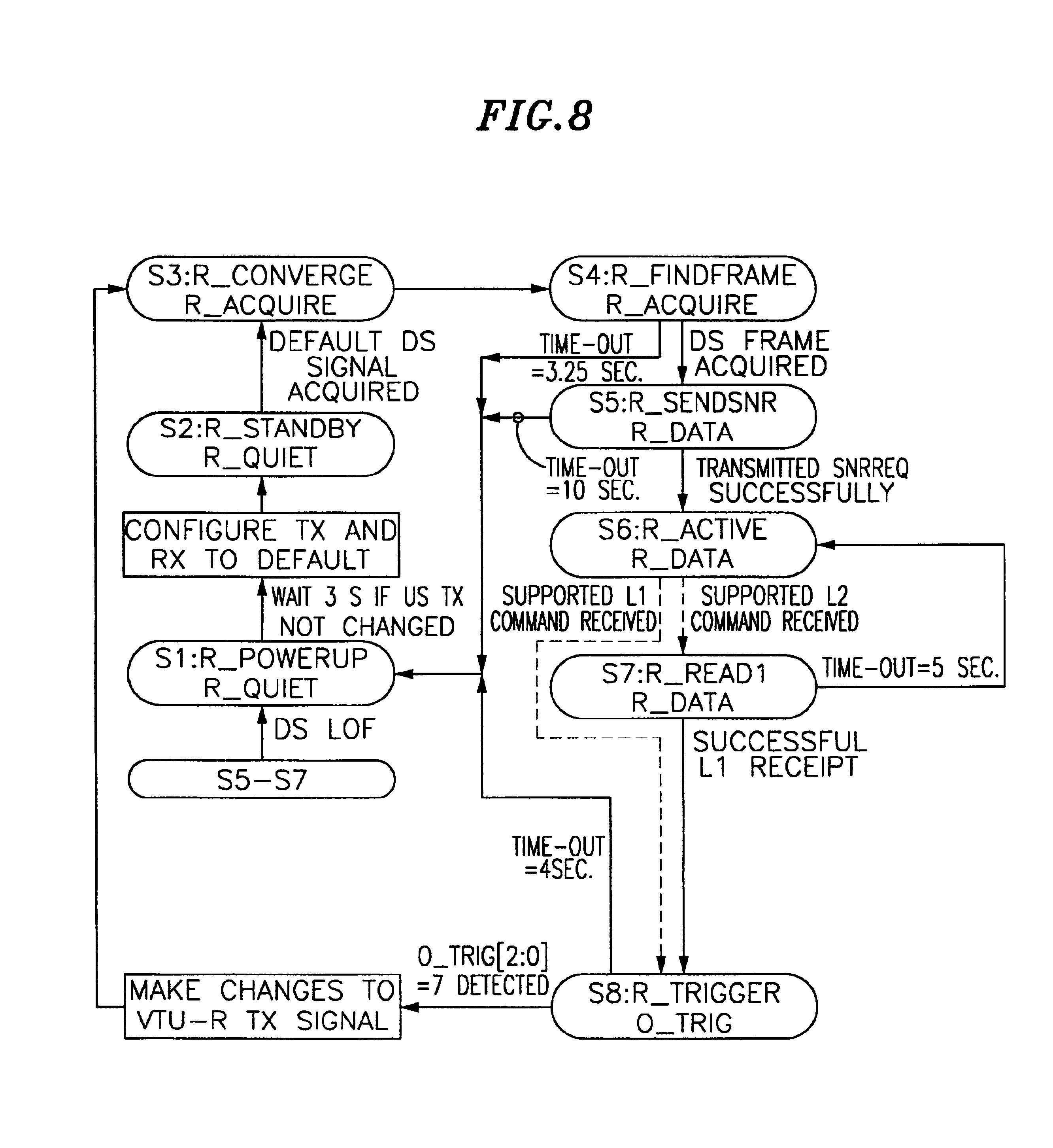 VTU-O master, VTU-R slave operation VOC handshaking for reliable link message exchange maximizes throughput in presence of bridged taps and other impairments. The VDSL Operations Channel (VOC) and Rate-Adaptive Initialization code is run on a PC as a user-selectable option under QAMLink. The software then enters either the VTU-O or VTU-R Level 3 algorithm, discussed below. After a short delay either system type will display a message to the screen indicating that typing a “C” (for “CONNECT”) will start the automatic rate adaptive initialization. In this way the user is able to activate a link request from either the VTU-R or the VTU-O. Typically a user will first execute this procedure for the VTU-O transceiver, followed by the VTU-R, and then activate an initialization request from one of the modems. The Level 1 through Level 3 algorithms for both VTU-O and VTU-R will then work together to execute the following sequence of steps. After acquiring initial default downstream (QPSK, 1.62 Mbaud) and upstream (QPSK, 540 kbaud) links, the VTU-O uses the VOC channel to first set the upstream constellation. It then establishes a series of downstream links at the specified set of additional spectral allocations. The downstream SNR achieved at each of these symbol rates is tabulated by the VTU-O. By evaluating the table of SNR vs. symbol rate values thus achieved, the VTU-Q selects the symbol rate/constellation combination which maximizes bit rate up to the overall target rate and maximizes margin beyond that. Following configuration of the downstream link with the final selected parameters, both VTU-O and VTU-R Level 3 algorithms display an indication of the final symbol rate, constellations, and bit rates selected. The VTU-O also records this and other intermediate data to a file on the PC. At this point the user can return to the main QAMLink menu at either modem by selecting F10. An automatic restart capability can then optionally be enabled under the QAM Constellation monitor. This functionality provides for a rapid return to the final selected link parameters following a sustained loss of synchronization. The following set of downstream symbol rates are currently supported by the software: 1.62 Mbaud, 3.24 Mbaud, 3.70286 Mbaud, 4.05 Mbaud, 4.32 Mbaud, 4.86 Mbaud, 5.184 Mbaud, 5.67 Mbaud, and 6.48 Mbaud. For each of these the center frequency is selected so as to produce the same lower band edge (currently 1.4985 MHz). The set of downstream symbol rates tried by the VTU-O during any particular initialization attempt is a specific subset of these rates, as established in the Control Parameter Input screen. In a ported environment this allows the OAM&P platform to leverage existing information about the line to trade off rate granularity versus activation time. Use of the overall target rate feature in the Control Parameter Input screen allows for implementation of the alternative initialization goal of maximizing margin at a specified bit rate. VOC/Initialization Software Structure The code which implements the functionality described above and illustrated in At the top of the rate adaptive hierarchy is the Level 3 algorithm. The Level 3 algorithm provides high-level instructions to the lower levels of the hierarchy to be carried out. At the VTU-O the Level 3 algorithm is responsible for generating transmission parameter change requests and processing of the results of these changes. Hence it is the VTU-O Level 3 algorithm which directs the series of downstream symbol rate changes, builds the SNR table, and selects the final spectral allocation and constellation pair. At the VTU-R the Level 3 algorithm is responsible for monitoring the received VOC field, calling the Level 1 algorithm if a non-IDLE message is detected, and calling the Level 2 algorithm if a change in transmission parameter has been requested. The Level 2 algorithm is responsible for implementing the initialization and adaptation state machines, shown in FIG. 7 and FIG. 8. At the VTU-O, the Level 3 algorithm calls the Level 2 algorithm to request that a change in transmission parameter, such as symbol rate, be executed. At the VTU-R, the Level 2 algorithm is called when the Level 3 algorithm learns (from data returned by its Level 1 algorithm) that the VTU-O has issued a parameter change request which the VTU-R supports. In addition, the Level 2 algorithms of both modems are invoked to establish the default system links. The Level 1 algorithm implements the VOC handshake flow charts, shown in FIG. 9 and FIG. 10. Two illustrative VOC message sequences, which could be produced by the concurrent operation of these two flow charts, are shown in FIG. 11 and FIG. 12. At the VTU-O, the Level 1 algorithm is called by either the Level 2 or Level 3 algorithm and provided with a COMMAND message that is to be communicated to the other end using the VOC, along with the expected ECHO from the VTU-R. At the VTU-R the Level 1 algorithm is called by either the Level 2 or Level 3 algorithm whenever a non-IDLE received VOC message is first detected. The VTU-R Level 1 algorithm is responsible for interpreting the received VOC COMMAND and generating the proper ECHO response. VTU-O Level 1 Inputs and Outputs Every time the VTU-O Level 1 algorithm is called it makes use of the following information: the value of the three-octet VOC COMMAND (1 octet opcode plus 2 octets data) that the VTU-O Level 1 algorithm is to attempt communicating to the VTU-R; an indication of whether the COMMAND is a READ or a WRITE; and the value of the expected VOC ECHO to be received from the VTU-R. If the COMMAND is a WRITE, only the opcode portion of this expected ECHO is significant. If the COMMAND is a READ, both the opcode and data portion of the expected ECHO are significant. Upon exiting the VTU-O Level 1 algorithm provides the following information: whether the VOC message communication was deemed successful or not, as defined by the VTU-O handshake flow char