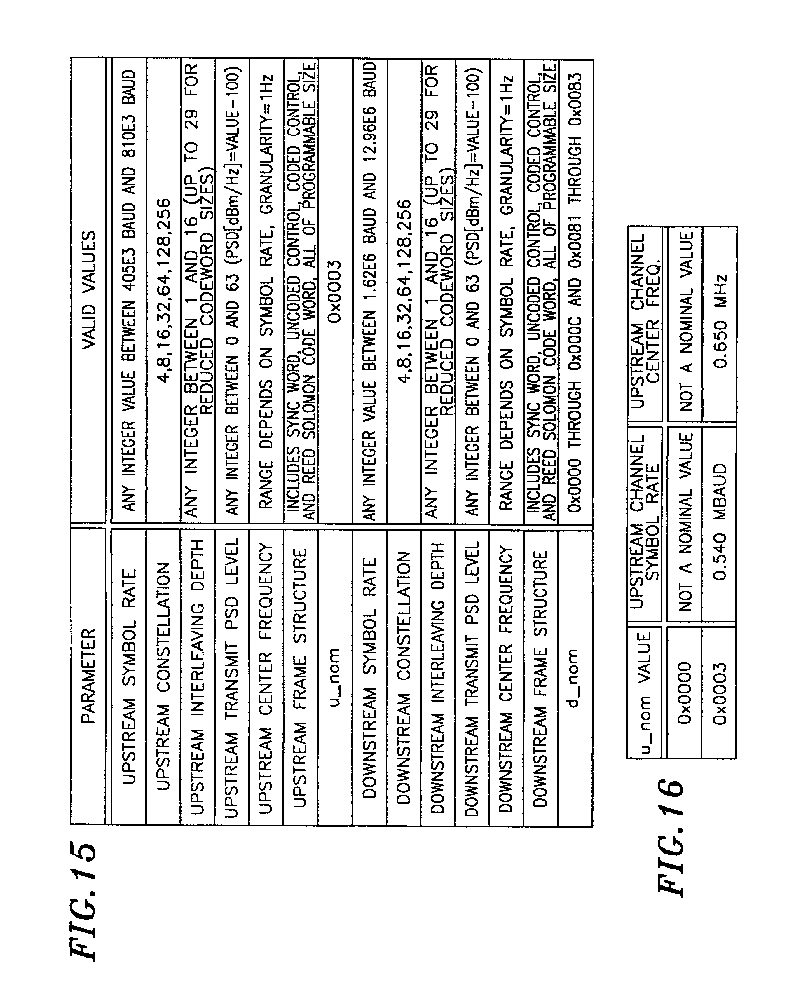 VTU-R Level 3 Inputs and Outputs As a slave of the VTU-O, the VTU-R Level 3 algorithm does not require access to its own set of process control parameters. Upon return, information regarding the final transmission parameters are available by querying BCM6010 hardware registers. VTU-R Level 3 Functional Description Overview Because the VTU-R is a slave of the VTU-O, the VTU-R Level 3 algorithm processing is relatively simple. The flowchart is shown in FIG. 22. Upon entry the Level 3 algorithm prepares for the establishment of the default links by calling the Level 2 algorithm with an entry state of S1. After the default link is established, the Level 3 algorithm polls the received VOC frame field, the received frame lock indicator, and the keyboard. If the function key F10 is entered, the Level 3 algorithm returns. If a loss of frame is sustained for 500 ms, an attempt is made to re-establish the default link by once again calling Level 2 with an entry state of S1. And if a non-IDLE VOC message is repeated the Level 1 algorithm is called in order to interpret and respond to the message. In the latter case, if the ECHO sent by the Level 1 algorithm indicates a request for a supported transmission parameter change, then the Level 3 algorithm calls the Level 2 algorithm in order to implement that change. Following the Level 2 algorithm return, the Level 3 algorithm resumes polling the received VOC, received frame lock indicator, and keyboard, as before. Auto-Restart Functionality An automatic restart (“warm start”) functionality is built into the rate adaptive software. Accessible following the completion of any rate adaptive startup, this functionality provides for rapid reacquisition of the final rate adaptive transmission parameters in the event of a sustained loss of upstream or downstream frame. In the current version of software, a loss of frame must be maintained for 3-4 seconds before an automatic restart is initiated. This allows time for the receiver to recover on its own (i.e., without undergoing the restart procedure) from a long impulse noise event or micro-interruption of the signal. An automatic restart begins with the system bringing up the default links, followed by the use of the VOC message channel to switch directly to the final transmission parameters. In the event that the final parameters cannot be re-established in this way, the system reverts to a full rate adaptive startup (“cold start”). This can occur when there is a significant change in channel characteristics since the last cold start. When enabled, the automatic restart functionality also places the transceiver in a mode which provides maximum tolerance to burst noise. The auto-restart functionality is enabled through the QAM constellation monitor of QAMLink (F8 from the QAMLink main menu). Once in the constellation monitor, the auto-restart mode can be toggled on and off through the F7 key. Auto-restart mode returns to off whenever the constellation monitor is exited. Auto-restart must be enabled in both the VTU-O and VTU-R in order for the described functionality to execute. It is understood that the exemplary method and apparatus for rate adaptation in DSL and the like described herein and shown in the drawings represents only a particular embodiment of the invention. Indeed, various modifications and additions may be made to such embodiment without departing from the spirit and scope of the invention. For example, the present invention may be utilized to optimize quadrature amplitude modulation (QAM) transmission performance by maximizing bit rate subject to a specified minimum margin constraint, by maximizing bit rate subject to a specified maximum bit error rate (BER) constraint, by maximizing margin at a specified bit rate, or by minimizing bit error rate (BER) at a specified bit rate. Indeed, quadrature amplitude modulation (QAM), may be optimized by combining any such techniques so as to provide a specified target bit rate, above which margin is maximized. Such optimization may apply independently to both the upstream and downstream channels in a full duplex quadrature amplitude modulation (QAM) system. Either the same or different optimization criteria, such as those listed above, may be performed for the upstream and downstream channels, in a full duplex quadrature amplitude modulation (QAM) system. Optionally, the downstream data payload rate may be reduced so as to more nearly equal the data payload rate achieved by the upstream channel, in which the reduction is performed by reducing the transport payload percentage and/or the downstream line rate, in a way which is consistent with the selected optimization criteria. Alternatively, the upstream payload rate may be reduced so as to more nearly equal the payload rate achieved by the downstream channel, in which the reduction is performed by reducing the transport payload percentage and/or the upstream line rate, in a way which is consistent with the selected optimization criteria. Quadrature amplitude modulation (QAM) transmission performance optimization may be performed according to the selected optimization criteria listed above, by varying in discrete steps one or more of the following parameters: Symbol rate, constellation, center frequency, transmit power and power spectral density, physical frame structure, block coding parameters, convolutional coding parameters, trellis coding modulation parameters, Tomlinson precoder coefficients, and interleaving parameters. Thus, the present invention relates to an algorithm which establishes or attempts to establish a series of links at a predetermined set of symbol rate and center frequency pairs, in which the achieved signal to noise ratio (SNR) and/or bit error rate (BER) for each symbol rate and center frequency pair is tabulated and used to select a final symbol rate, center frequency and constellation triplet, according to the specified optimization criteria. Each of the different symbol 