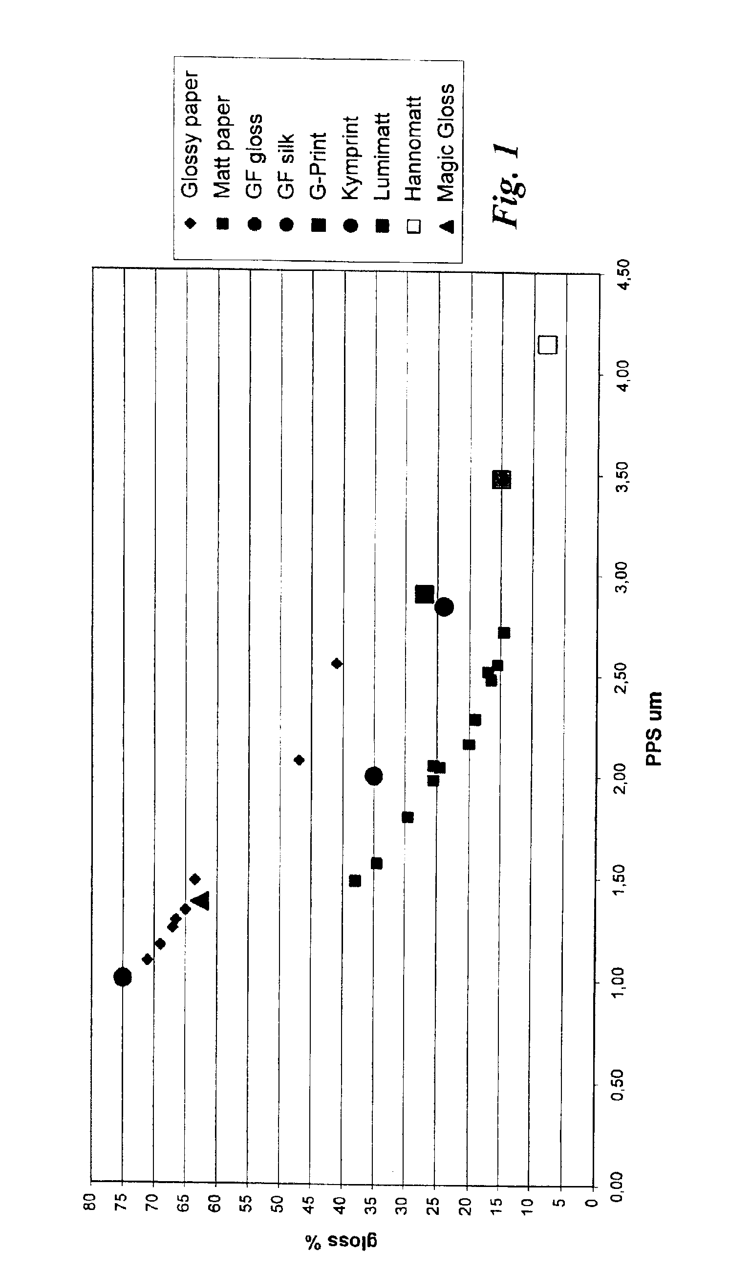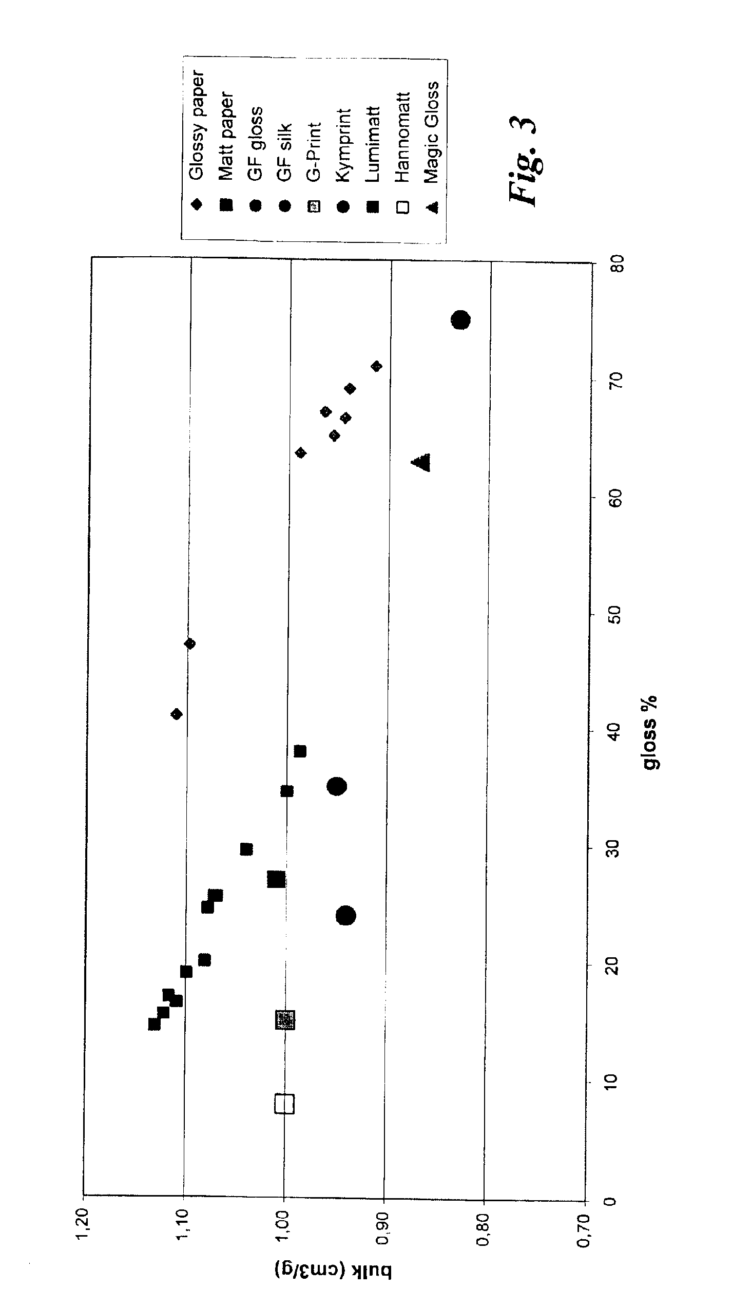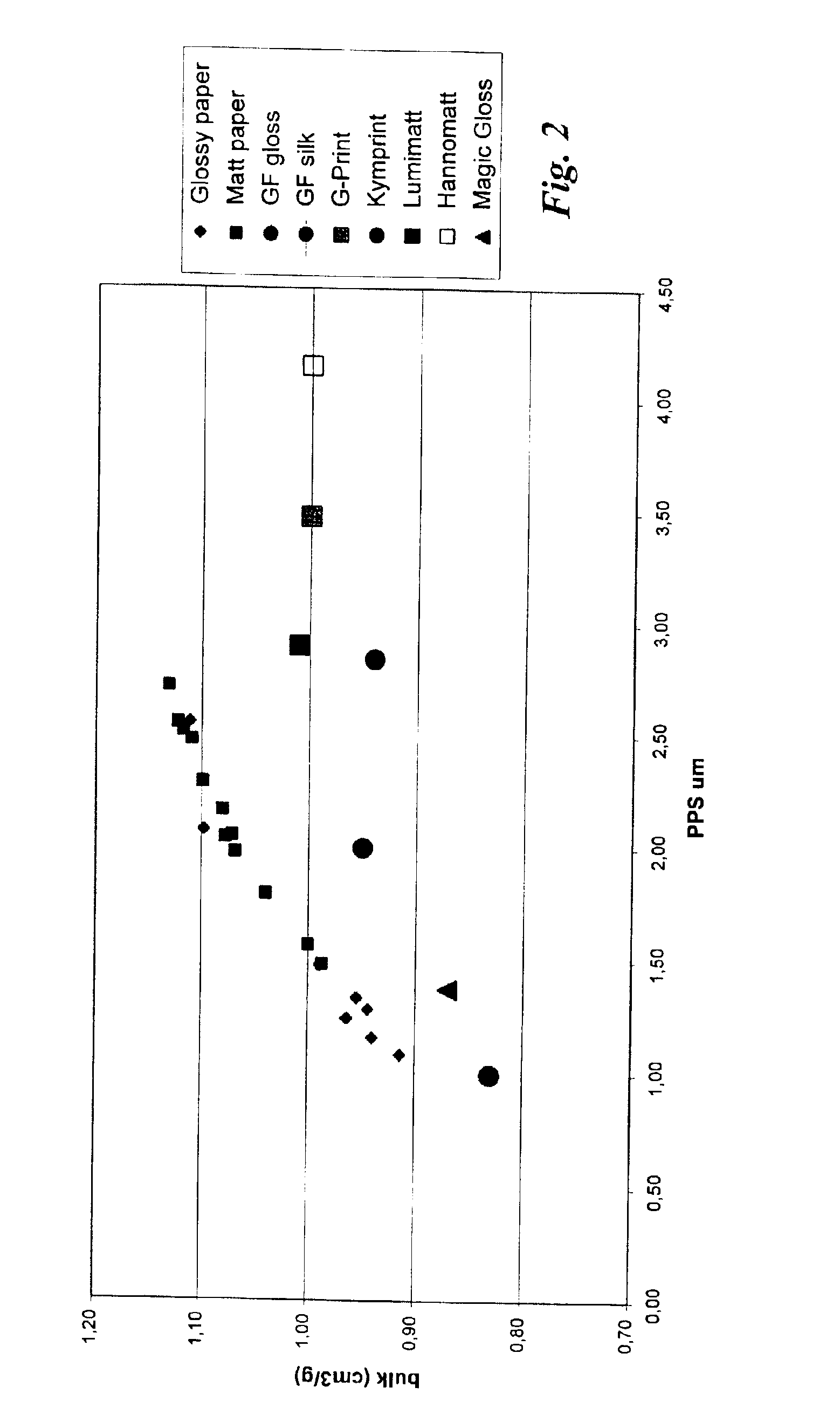 Thus a paper was obtained which had very good quality properties in terms of heatset-offset printing. Table 2 compares the paper according to the invention with competitors, the grammage of all of the papers being 90 g/m2. The papers of the competitors had been produced using—probably—as the short-fibered pulp a chemical birch pulp or possibly a chemical pulp containing eucalyptus, acacia or so-called mixed hardwood pulps. The gloss and smoothness indicated in the table are mean values calculated from the values of the top side and the wire side of the paper. The results of Table 2 are also presented graphically in The paper according to the invention is smoother but, nevertheless, its bulk is on average over 10% better then the bulk of the best competitors. In matt papers the gloss value is not as essential a quality value as the smoothness of the paper, but even with respect to gloss, the paper according to the invention is within the same range as the competitors. Opacity is especially notable in the results of Table 2. The paper produced by the method according to the invention is with respect to opacity so much better that the opacity achieved by the competitors with a grammage of 90 g/m2could be achieved with the paper produced according to the invention already with a 76 g/m2paper. This calculation is based on the use of the Kubelka-Munk theory. It is essential to note even in this example that in Examples 1, 2 and 4 the speed of the apparatus was always within the range of 895-1100 m/min. It is thus in practice possible to implement a machine line wherein paper production, coating and calendering are in the same production line and the speed of the entire line is, for example, 1100-1200 m/min.Coating pigment 100 parts by weight (e.g. coarse calcium carbonate) binder 1-20% of the weight of the pigment additives and auxiliary agents 0.1-10% of the weight of the pigment water balance coating pigment I 10-90 parts by weight (e.g. fine gypsum) coating pigment II 0-90 parts by weight (e.g. fine kaolin) coating pigment III 0-90 parts by weight (e.g. fine carbonate) pigment in total 100 parts by weight binding agent 1-20 parts by weight additives and auxiliary agents 0.1-10 parts by weight water balance precipitated calcium carbonate 40-90 parts and kaolin 10-60 parts or gypsum 10-60 parts and binder 1-20% of the pigment thickener 0.1-10% of the pigment EXAMPLE 1
