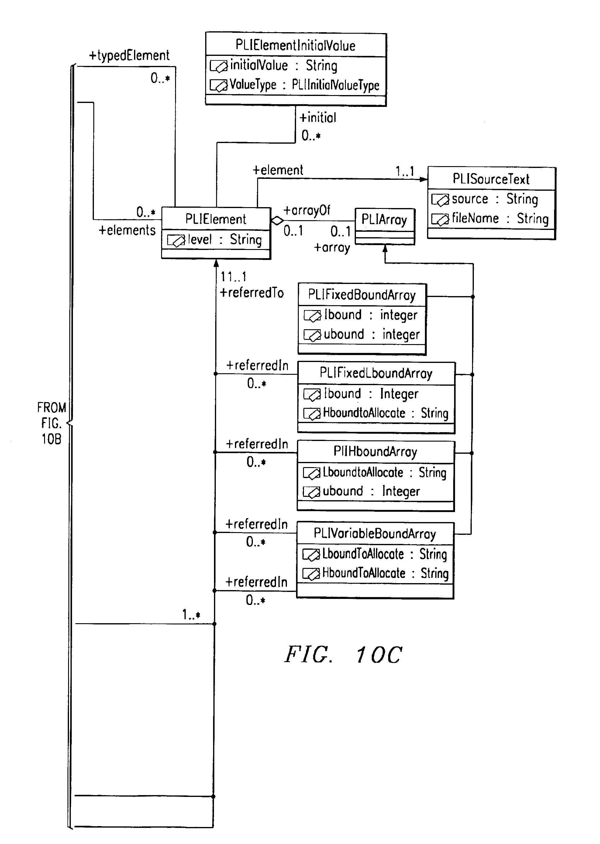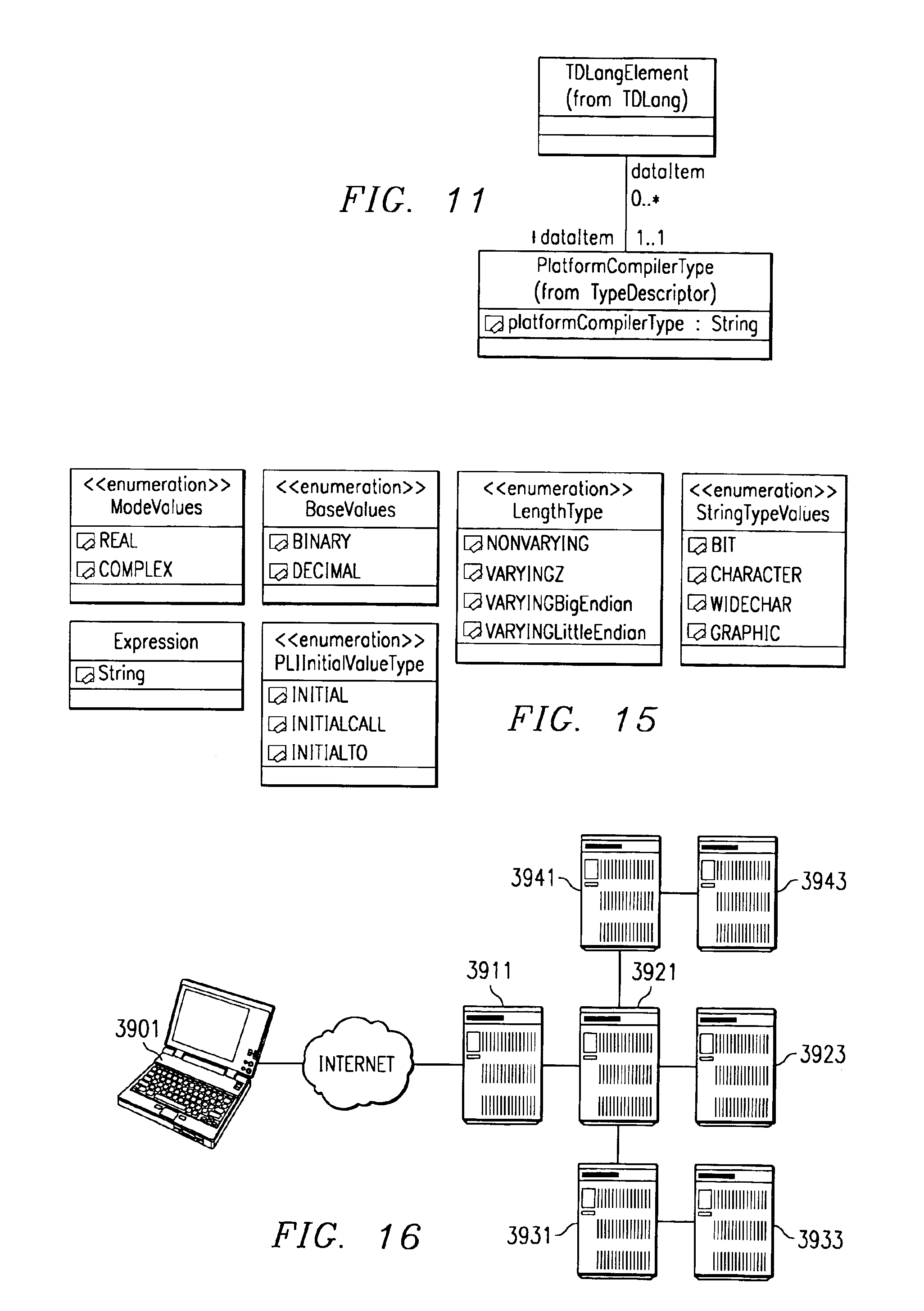 But it is not possible to create a new typedef from X that makes any of the subcomponents of X, e.g., D or E, into an array. This example and many others point out the unclear status of array definitions in typed languages. An InstanceTDBase type has two concrete subtypes, SimpleInstanceTD and AggregateInstanceTD. SimpleInstanceTD models data elements without subcomponents, while AggregateInstanceTD models data elements with subcomponents. To find the subcomponents of an AggregateInstanceTD, one must navigate back to the corresponding data element declaration in the CAM language model. There, the association between an aggregate type and its subcomponents may be navigated, leading to a set of subcomponent data elements, each of which has one or more corresponding instances in the Type Descriptor model. This introduces some model navigation complexity, but avoids duplicating the aggregation hierarchy in both the language and the Type Descriptor models. The additional processing complexity of traversal is not great, and considerable simplification is obtained in algorithms that would modify the model to add, delete or rearrange subcomponents in an aggregation. A SimpleInstanceTD model type is also associated one to one with a BaseTD model type. The BaseTD model type is specialized to hold implementation information that is common for all data elements of the same language type. The information that describes a 32-bit signed binary integer on a specific hardware/software platform is thus instantiated only once in a given model instantiation, no matter how many data elements may be declared with this type. One may contemplate an association between TDLangClassifier and BaseTD matching the association between TDLangElement and InstanceTDBase. However, this is problematic in that constructions that the language regards as simple types (e.g., strings) may not map directly to simple hardware/software types. Rather than introduce more mechanisms into the Type Descriptor model to describe string implementations, a specialization of BaseTD is utilized which describes the common string implementations. Various attributes in the TypeDescriptor model are suffixed with the string “formula.” These attributes contain information that may in some cases be impossible to compute without access to data created only at run-time. An example is the current upper bound of a variable-sized array or the offset to an element that follows another element whose size is only known at run-time. Such information could be included as values in a model instance, but this would require a model instance for each run-time instance, and would mean that the model could only be constructed at run-time, requiring the model definition to include factories and other apparatus to create model instances at run-time. A model that can be constructed from platform and compiler knowledge is much more useful, and the formulas provide a way to define concrete values when the run-time information is available. These formulas may be interpreted by marshaling engines, or they may be used to generate marshaling code, which is loaded and executed by the marshaling engine on demand. 4. d. Formulas As used in connection with formulas, “field” refers to a component of a language data structure described by the Type Descriptor model, while “attribute” denotes part of the model, and has a value representing a “property” of the field. Thus the value of a field means a run-time value in a particular instance of a language data structure, whereas the value of an attribute is part of the description of a field in a language data structure, applies to all instances of the data structure, and is determined when the data structure is modeled. For most attributes in an instance of the Type Descriptor model, the value of the attribute is known when the instance is built, because the properties of the fields being described, such as size and offset within the data structure, are invariant. But if a field in a data structure is defined using the COBOL OCCURS DEPENDING ON construct or the PL/I Refer construct, then some properties of the field (and properties of other fields that depend on that field's value) cannot be determined when the model instance is built. Properties that can be defined using these language constructs are string lengths and array bounds. A property that could indirectly depend on these language constructs is the offset of a field within a structure, if the field follows a variable-size field. In order to handle these language constructs, properties of a field that could depend on these constructs (and thus the values of the corresponding attributes), are defined with strings that specify a formula that can be evaluated when the model is used. However, if a property of a field is known when the model instance is built, then the attribute formula simply specifies an integer value. For example, if a string has length 17, then the formula for its length is “17”. The formulas mentioned above are limited to the following: