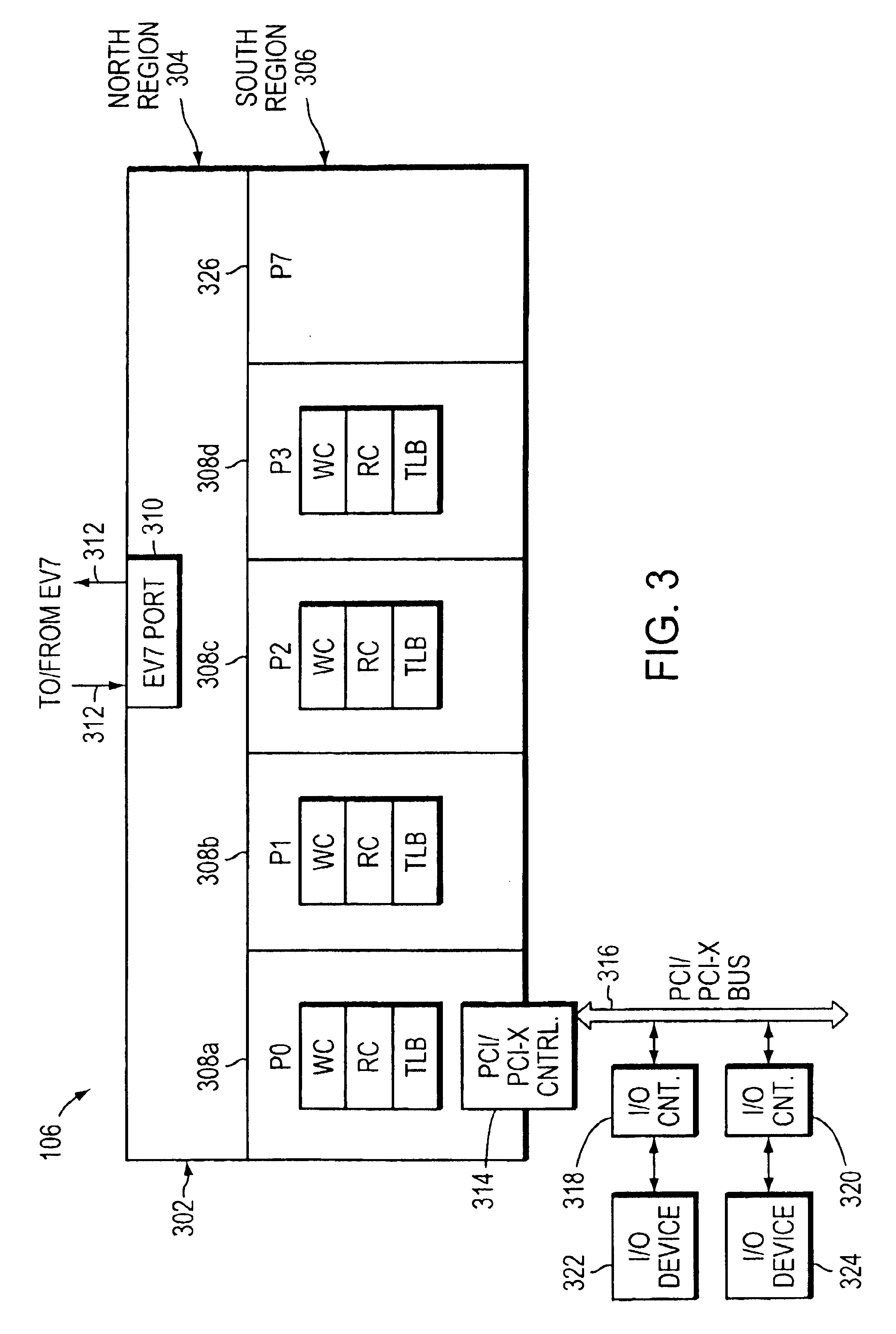 A multiplexer (MUX) (not shown) receives inputs from each of the south ports P0-P3 and P7 and provides a single output to North region 304. Thus, messages generated within any of the south ports P0-P3 and P7 are received by and processed by the MUX before transmission to North region 304 and the EV7 mesh. The MUX may include an up hose arbitration (arb) logic circuit.