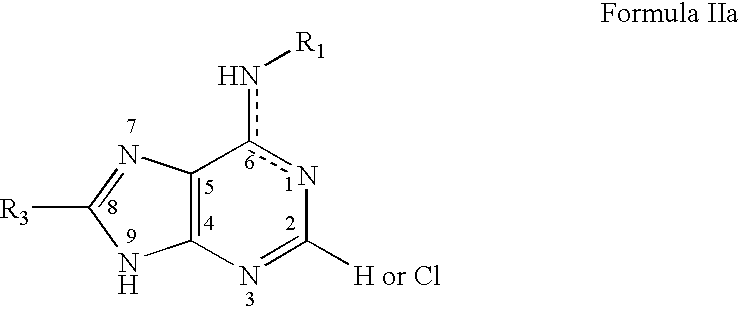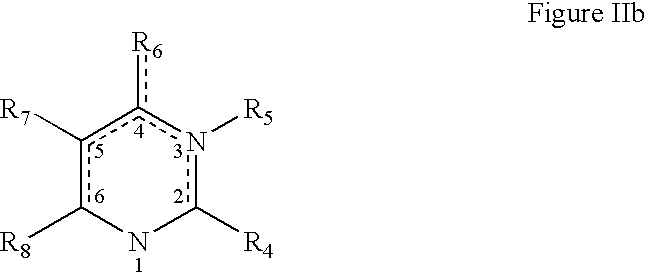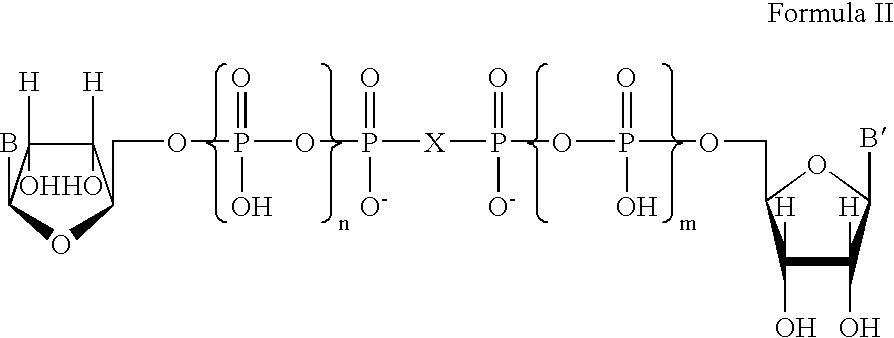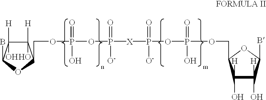 B and B′ are each independently a purine residue, as in Formula IIa, or a pyrimidine residue, as in Formula IIb, linked through the 9- or 1-position, respectively: