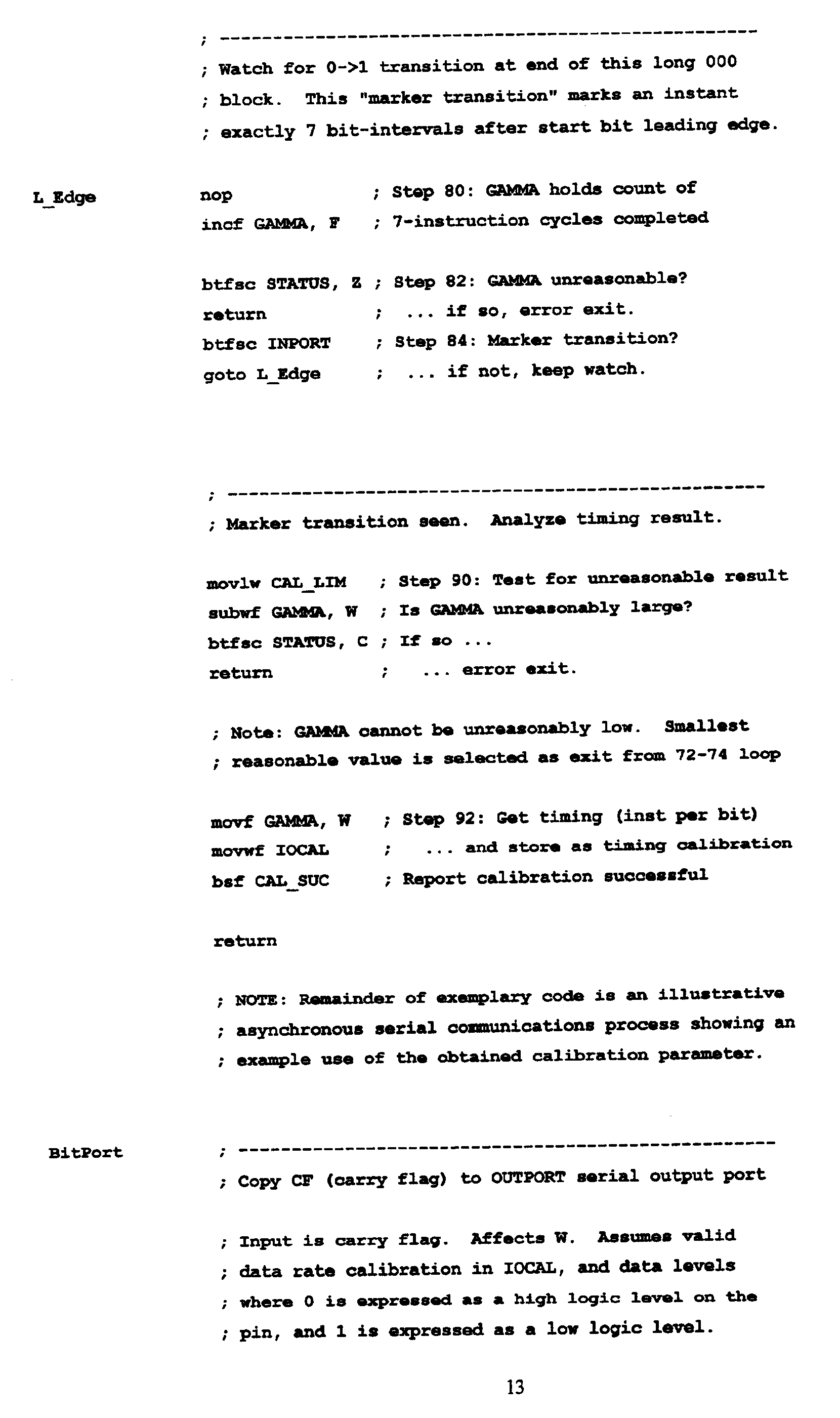 The present invention may be used by a receiving device, microprocessor 10, to determine the apparent data rate of an asynchronous serial data communication generated by a sending device, remote serial device 20. As illustrated for a typical binary sequence in Since microprocessor 10 mimics the data rate of remote serial device 20, one or both devices may employ an imprecise timing reference. When microprocessor 10 employs an imprecise timing reference, as in the present embodiment, the apparent data rate observed by microprocessor 10 may not equal the true data rate. The apparent data rate is sufficient and preferred for enabling microprocessor 10 to conduct subsequent serial communications, since the apparent data rate may be matched by microprocessor 10 in subsequent asynchronous serial communications, matching the actual data rate employed by remote serial device 20. The implementation of the preferred embodiment depends upon the data patterns expected from remote serial device 20, and the conditions under which these patterns are transmitted, in ways that are apparent to a person of ordinary skill in the art. The exemplary Uniden BC-780XLT remote serial device 20 uses asynchronous serial communications for control and status reporting, and responds to an unintelligible command, such as a single carriage return (binary sequence “00001101”), with the predetermined data “ERR” (error) represented as a standard ASCII binary sequence. The predetermined data pattern utilized by the present invention is characterized by specific features of the data pattern illustrated in FIG. 2. Specifically, any pattern includes the predetermined data pattern if it includes a recognizable marker transition 34 between symbol values, where calibration time interval 40 (from start bit leading edge 30 to marker transition 34) contains a fixed and predetermined number of data symbols (including the start bit data symbol). In the preferred embodiment, it is further required that a predetermined number of data symbols, immediately preceding marker transition 34 and corresponding to window interval 42, be represented with symbol(s) different from postmarker symbol 38 immediately following marker transition 34. Alternative embodiments may not include this additional requirement, as discussed in a later section. In this embodiment, data symbols before or after window interval 42 (if any) have no effect upon the operation of the present invention, with the single exception that postmarker symbol 38 must not appear within window interval 42. Accordingly, a plurality of data patterns may include the same predetermined data pattern. For example, the exemplary source code in The exemplary asynchronous serial communications source code presented in the detailed description accepts a calibration parameter measured as the number of microprocessor 10 instruction cycles executed over the duration on a single bit, at the data rate used in the asynchronous serial data communications. This parameter is determined by counting blocks of seven executed instructions over an interval corresponding to seven bits, calibration time interval 40, transmitted by remote serial device 20 in the asynchronous serial data communications. The number of seven-instruction blocks executed over seven bits of equal duration is clearly identical to the number of single instructions executed over a single bit. The process described below for detecting start bit leading edge 30 and marker transition 34, and measuring calibration time interval 40 between these transitions, is a preferred but not exclusive process since various mathematically equivalent alternatives may be used to achieve the same end. In the preferred embodiment, the exemplary Uniden BC-780XLT remote serial device 20 uses the RS-232 protocol for asynchronous serial communications. The BC-780XLT correctly interprets logic level data, but provides output data at levels (+12 V and −12 V) that could damage the microprocessor. Level converter 16 clamps the positive level to +5 V, while diodes within the exemplary PIC12C508 communications port clamp the negative level to ground, thereby converting the RS-232 BC-780XLT output levels to logic levels. At step 50, an unintelligible command is sent from microprocessor 10 to remote serial device 20. As indicated above, the Uniden BC-780XLT responds to an unintelligible command by sending an ASCII “E” (binary “01000101”) over communications link 12. At step 52, communications line 14 is checked to ensure that its initial level is consistent with the idle state expected between sequences of binary symbols. Then, in step 54, a timeout counter is cleared. The check of step 52, and the use of the timeout counter referenced in step 54, are optional elements that reduce the risk of errors. At step 60, communications line 14 is monitored to check for start bit leading edge 30, which is indicated by the first appearance of the data level opposite the idle level. If start bit leading edge 30 is detected, the process moves to step 70. Otherwise, the timeout counter is advanced at step 62, and tested for expiration at step 64. Normally the process returns to step 60 while waiting for the start bit leading edge, but if the timeout counter expired, the process terminates with an error exit at step 98 without a successful calibration because the expected response “E” was not seen. Upon detecting start bit leading edge 30 at step 60, a timing metric counter is cleared at step 70. This counter will measure the apparent length of calibration time interval 40 between start bit leading edge 30 and marker transition 34. Then the process enters a delay loop, alternately advancing the timing metric counter at step 72 and checking this counter at step 74 against a predetermined exit value, until the counter equals the exit value. Loop exit must occur at a time during window interval 42. The approximate delay time should be targeted for exit near wind