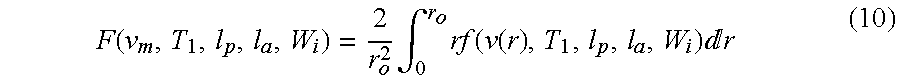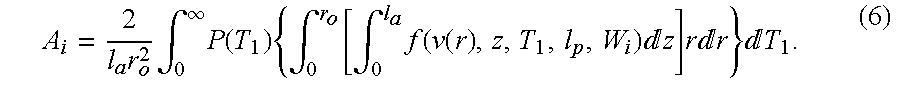 which can be obtained from Eqs. 8a and 8b by making the substitution, ν=νm·ξ. Because the inversion depends critically on the accuracy of these derivatives, it is useful to display the detailed results. The derivatives in the summation of Eq. 31 are given by, fi,1(vm·ξ)vm=ξ·Wila-[(lp+vm·ξ·Ti,l)vm·la·exp(-lpvm·ξ·Ti,l)+ξ·Wila]·(1-exp(-WiTi,l)),(33)