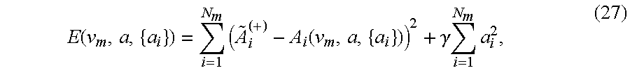 with respect to the parameters νm, a, and the set of amplitudes a1. The last term in Eq. 27 is used to stabilize the solution by reducing the effects of noise amplification that can occur in under determined inverse problems. The parameter γ is a regularization parameter and γ≧0.