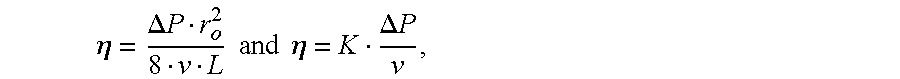 where the average speed ν of the fluid is equal to νm/2. Because L and roare defined by the apparatus, Eq. 40 may be converted to a more general form, η=K·ΔPv,(41)
